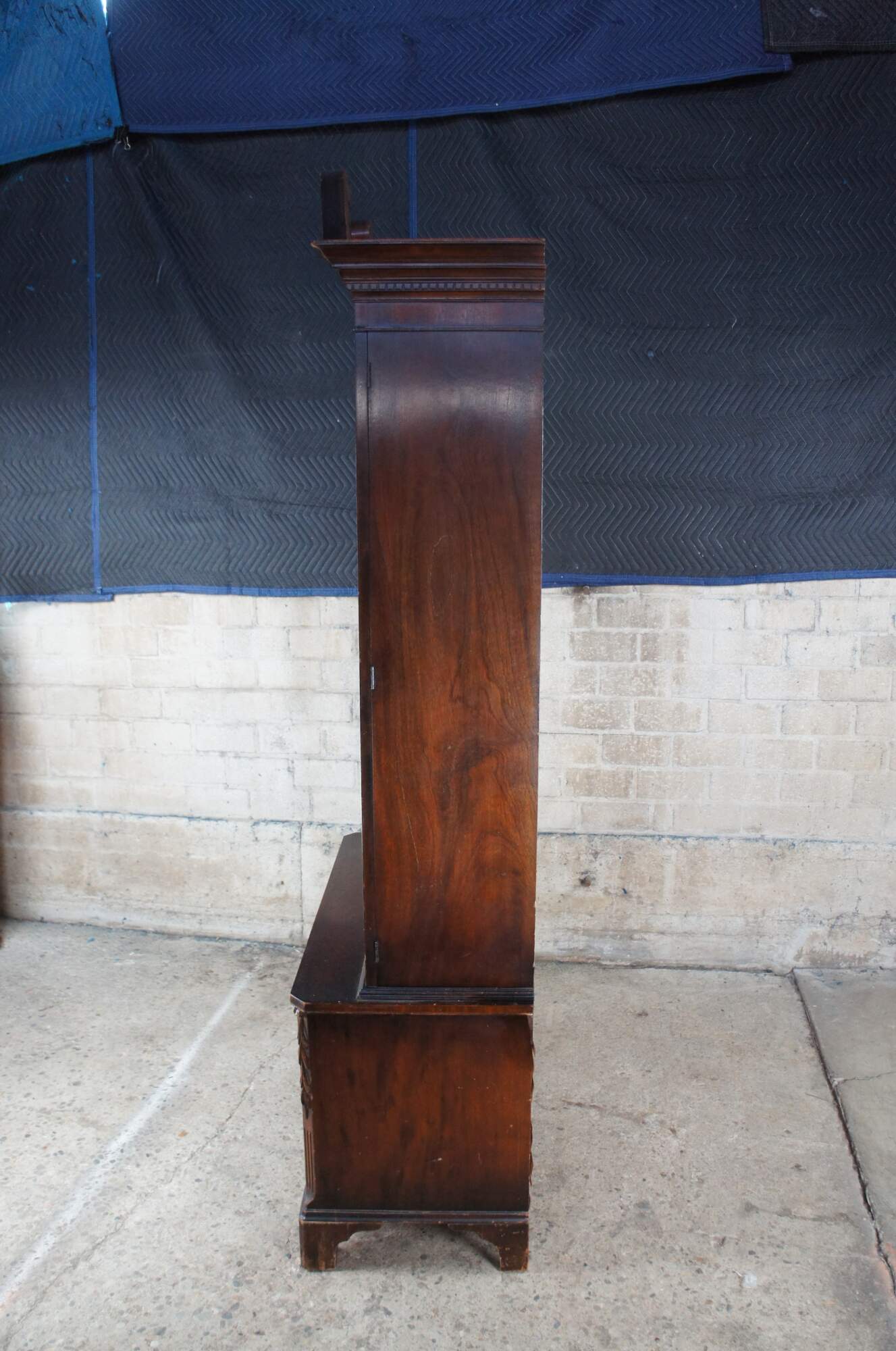 The lower side of the cabinet has two doors with circular banding set between chamfered stiles with foliate carving and fluting towards the base. Interior open to one shelf. The cabinet base is supported by bracket feet.