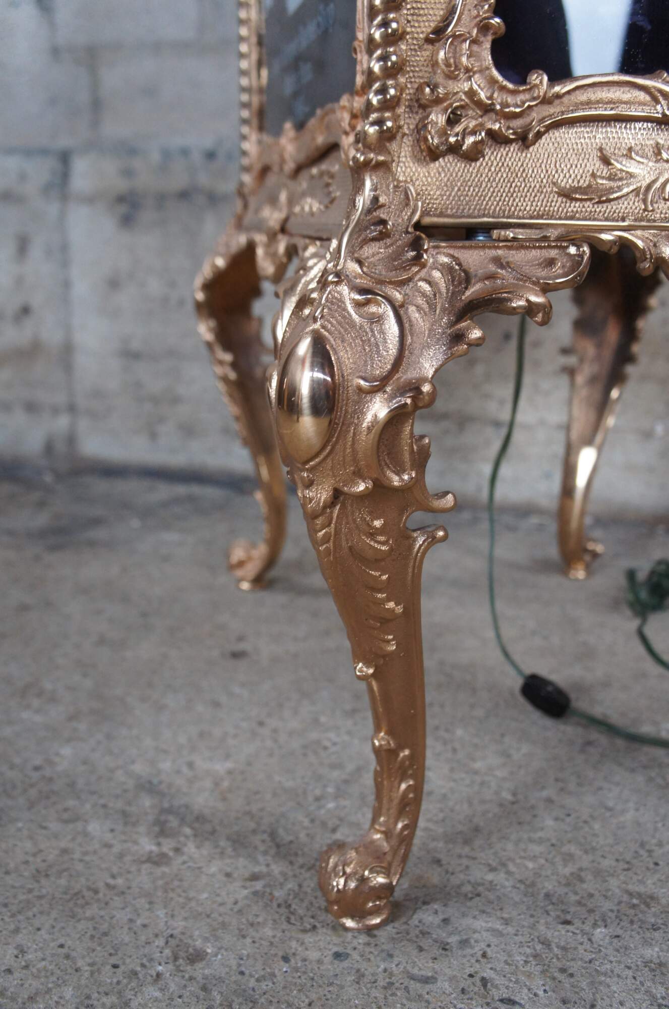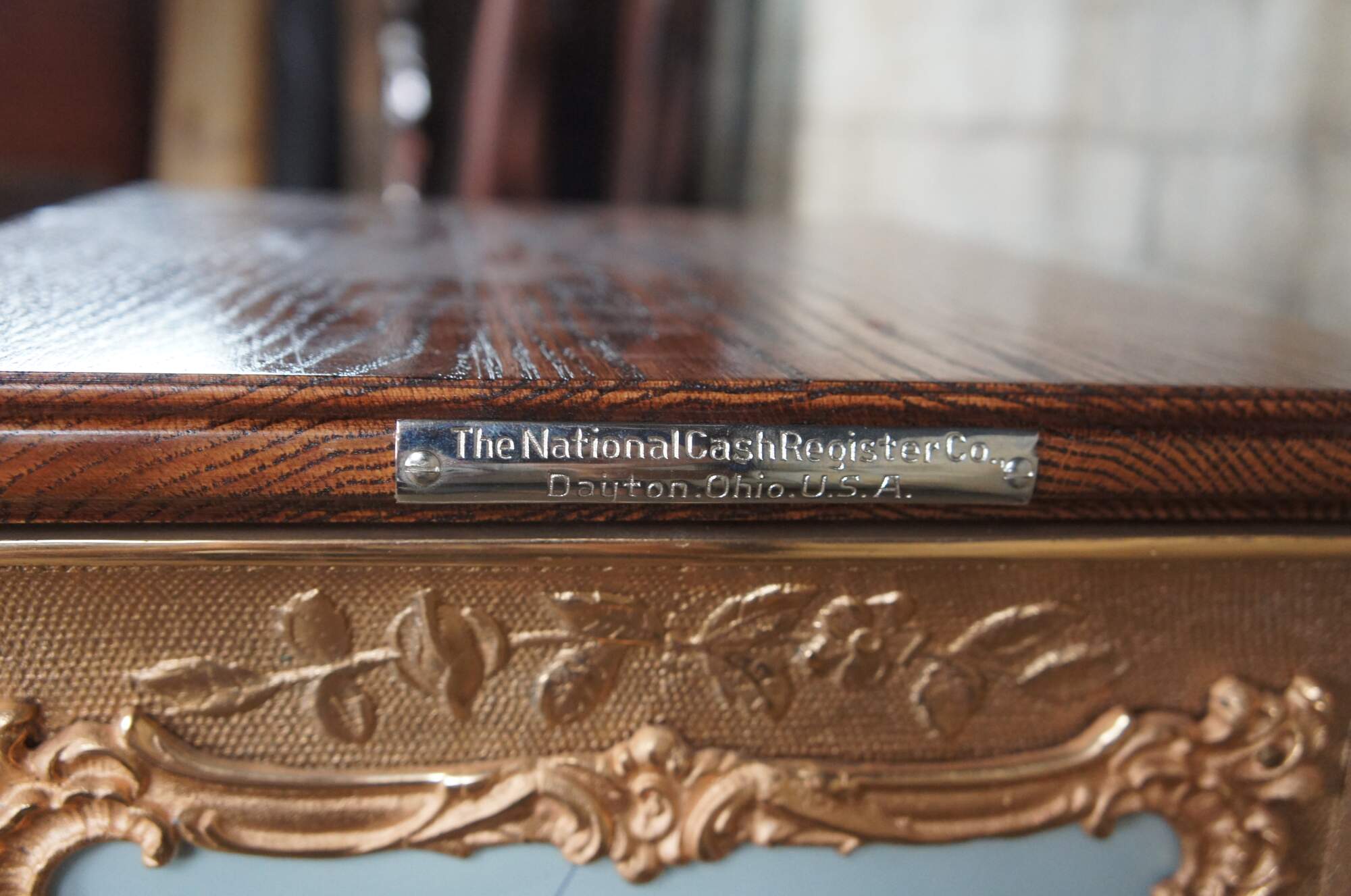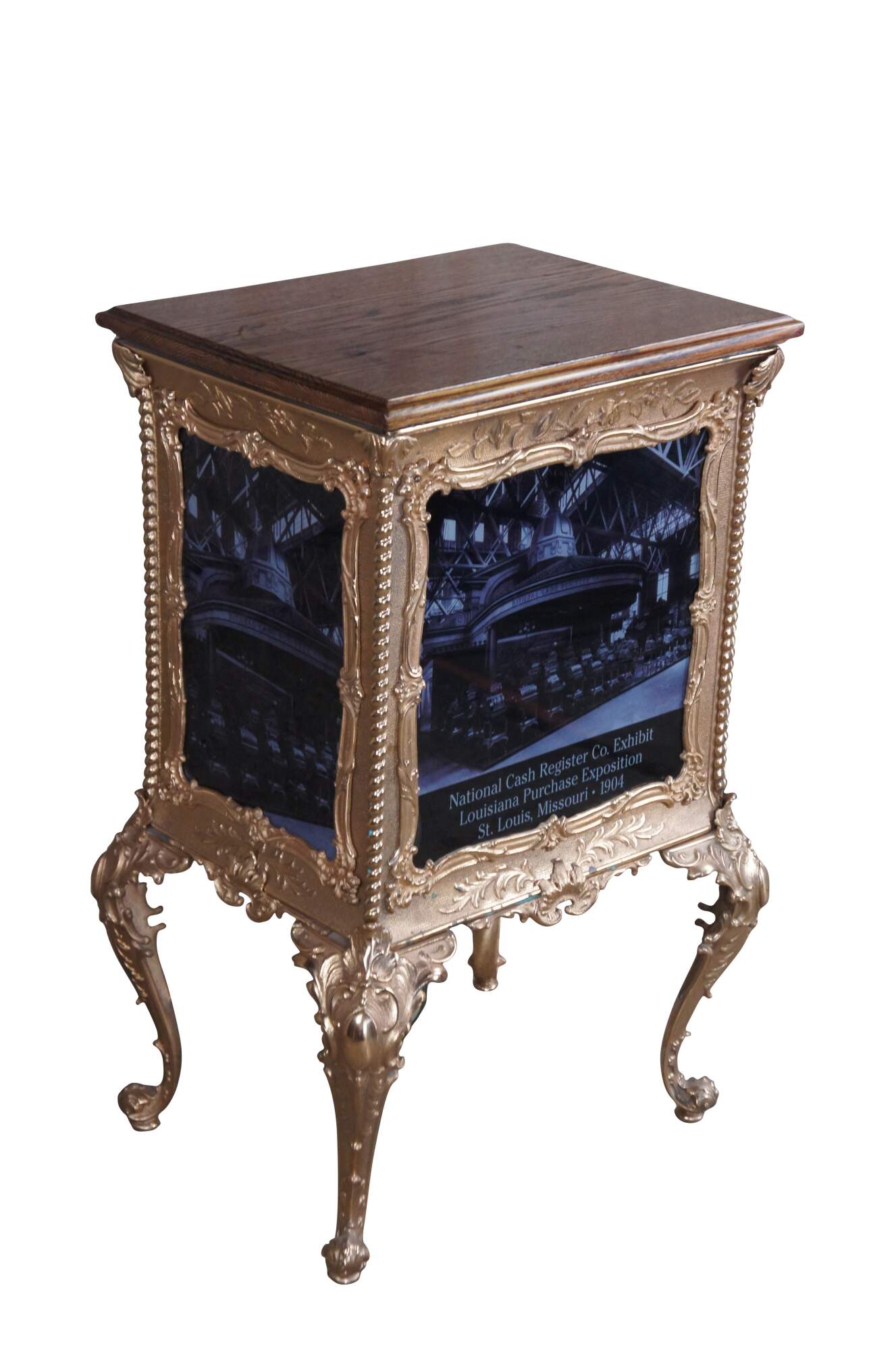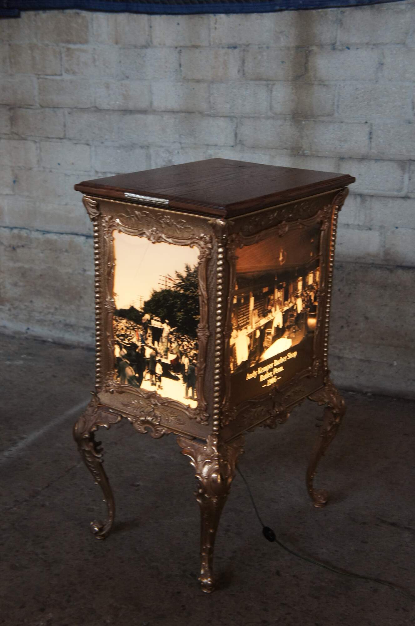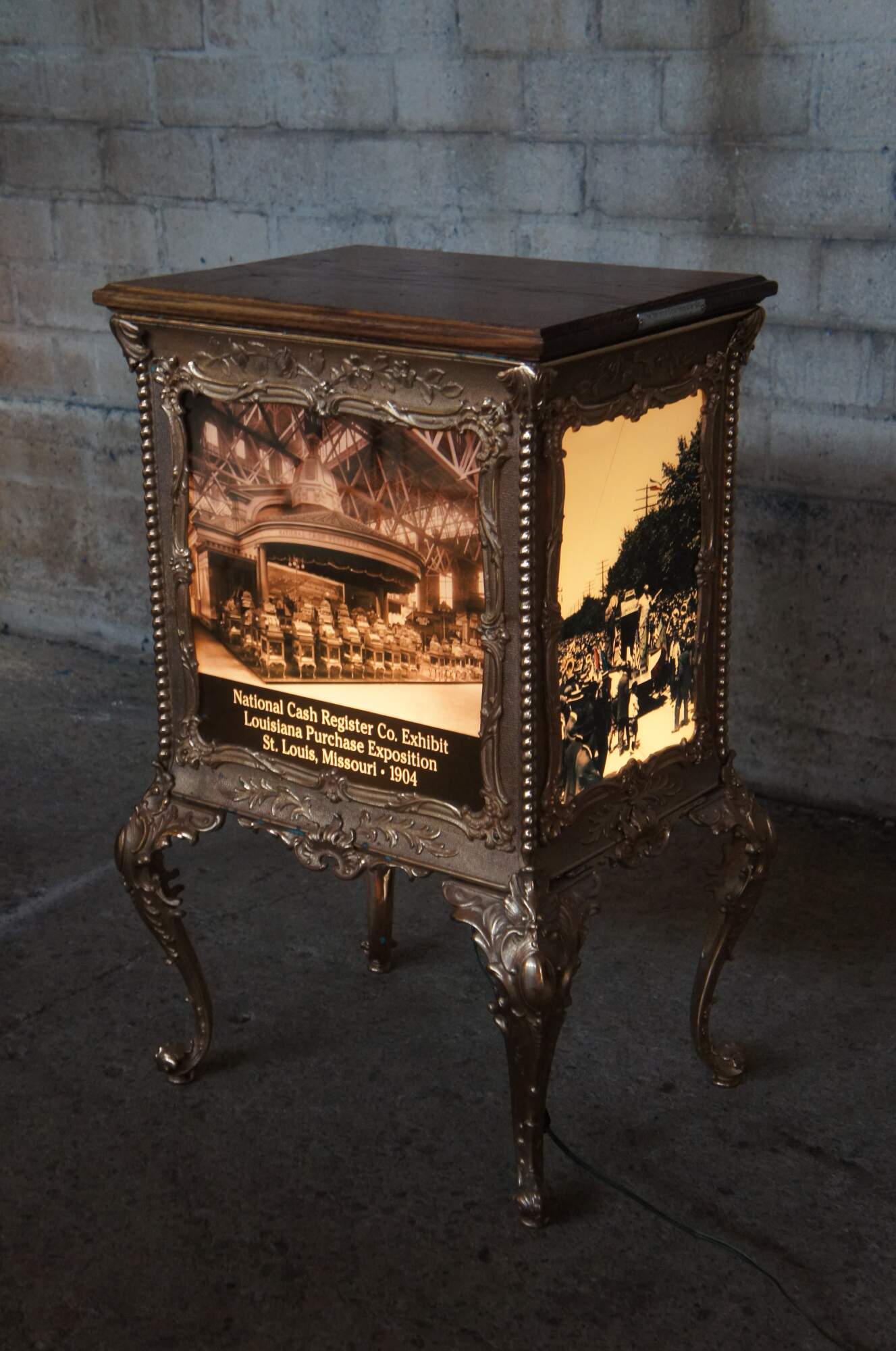 One of a kind Illuminated display table made for The National Cash Register in Dayton, Ohio. The table is designed in French Baroque styling with an oak top over an ornate brass frame centered around four back-lit commemorative scenes. The table was displayed in NCR headquarters with a 313 Special Register on top.