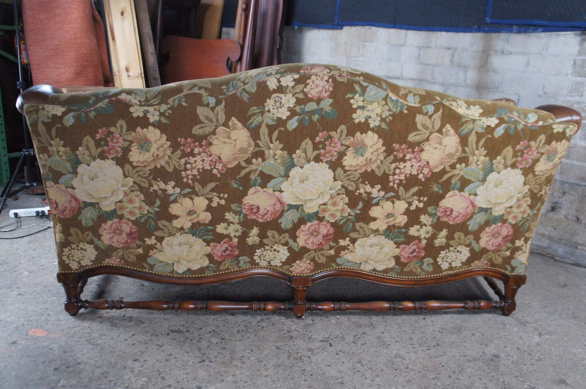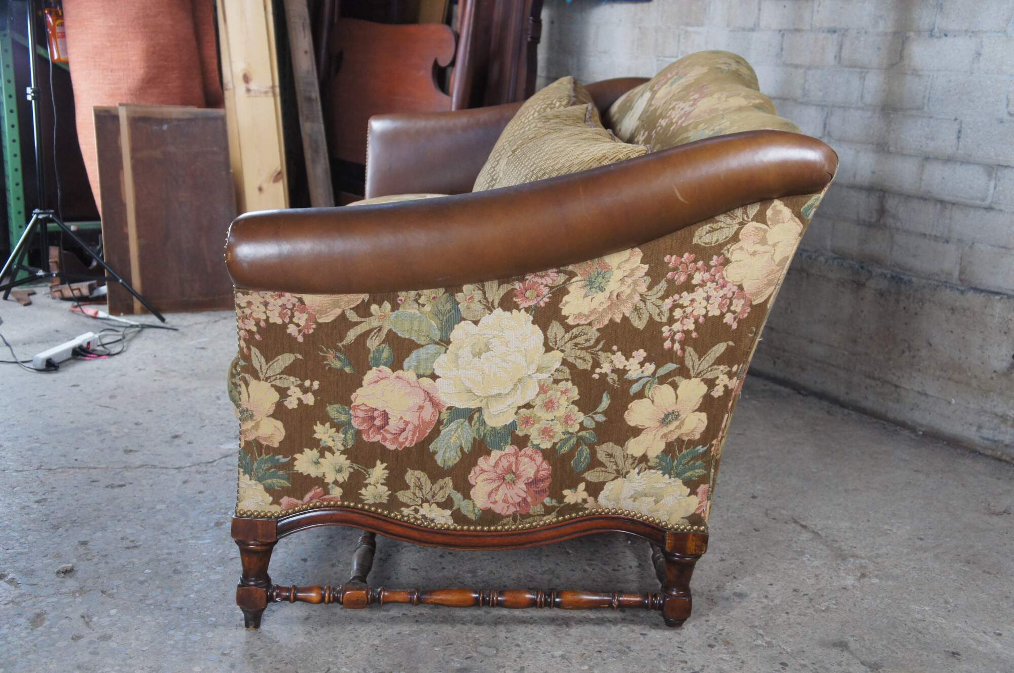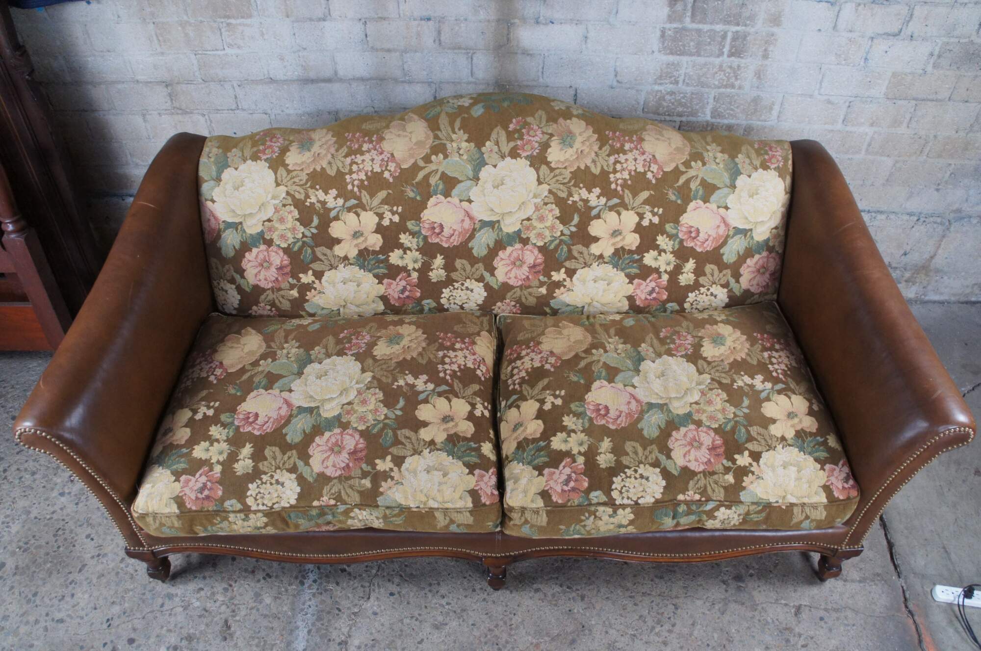 Late 20th Century Sherrill Furniture Traditional Camelback Sofa. Features a mahogany frame wrapped in brown leather and floral upholstery with brass nailhead trim. The sofa body is 80% polyester fiber batting and 20% urethan foam. Seat cushions are 60% urethane foam and 40% down blend. The sofa showcases a serpentine lower apront over turned and tapered connected by turned stretchers.