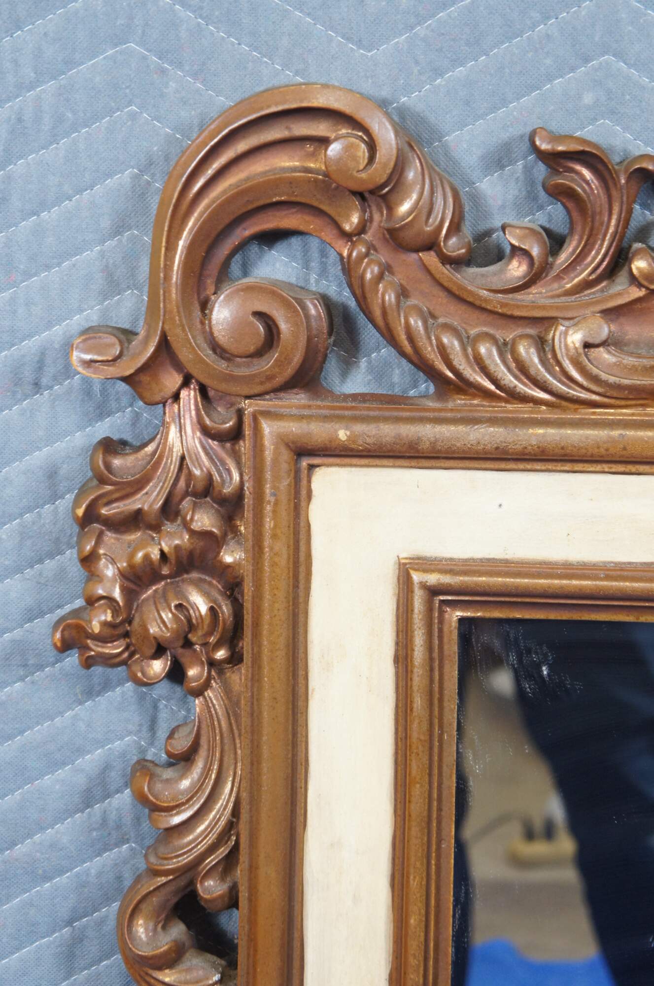 Late 20th century composite framed rectangular wall mirror featuring Baroque / French Provincial / Hollywood Regency style with a fountain urn surrounded by swirling foliates, acanthus, and white painted accent. Marked 110 on reverse.