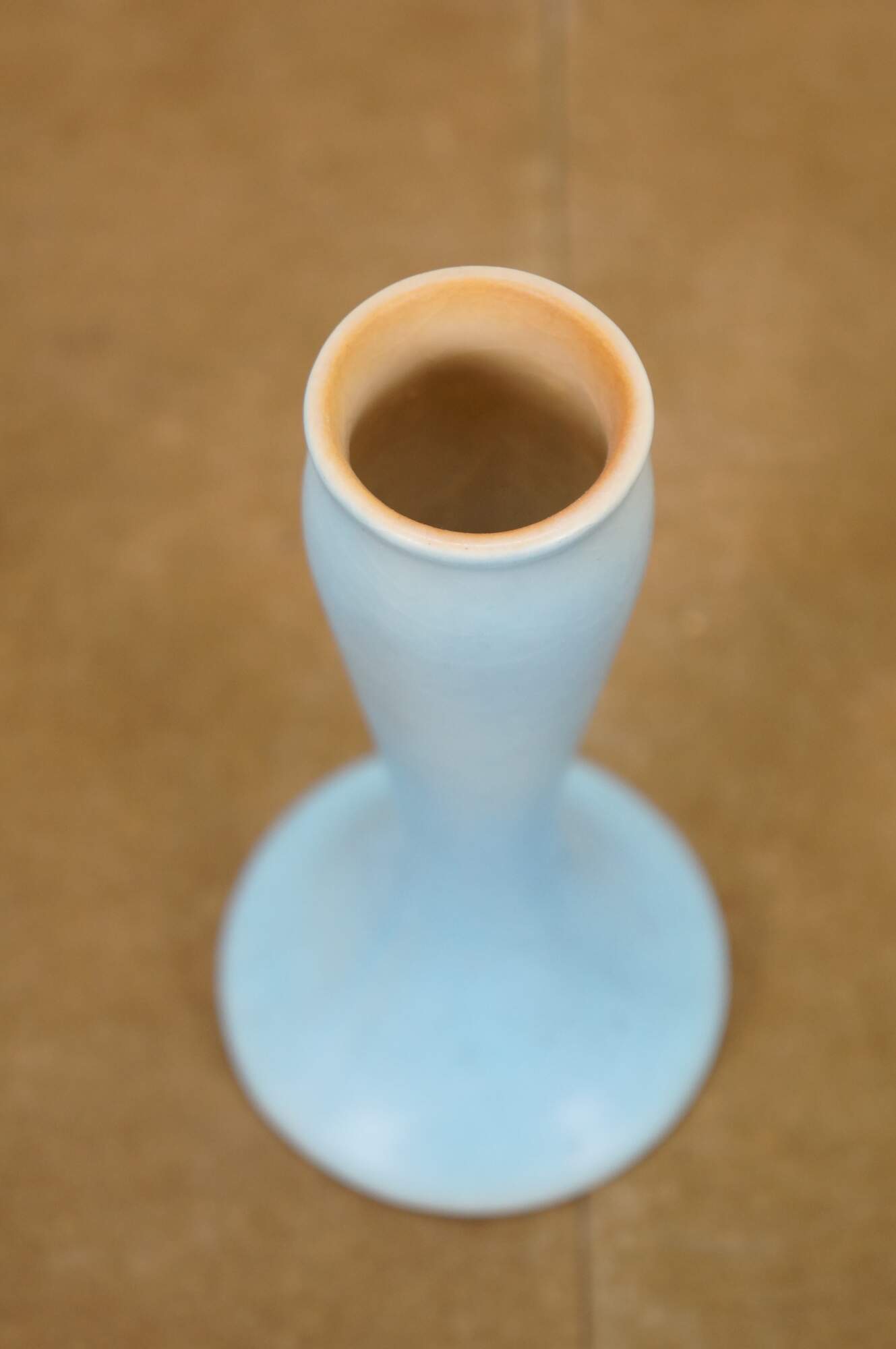 Circa 1940's Roseville art pottery Florane II 79-7 ceramic bud vase in light blue with golden brown interior.