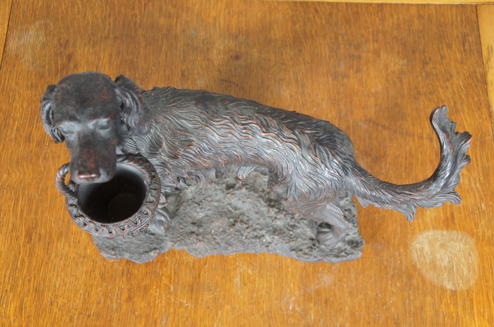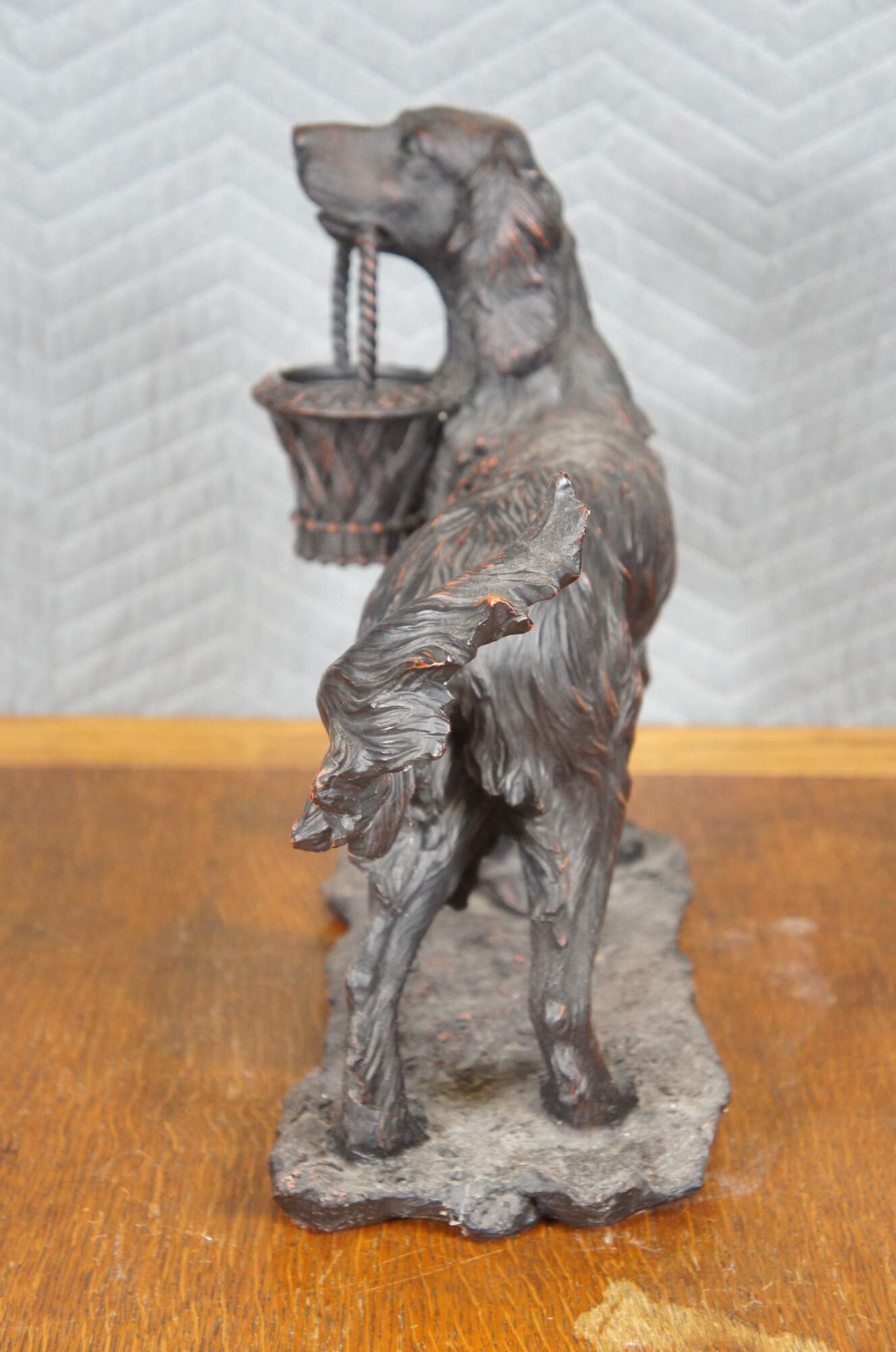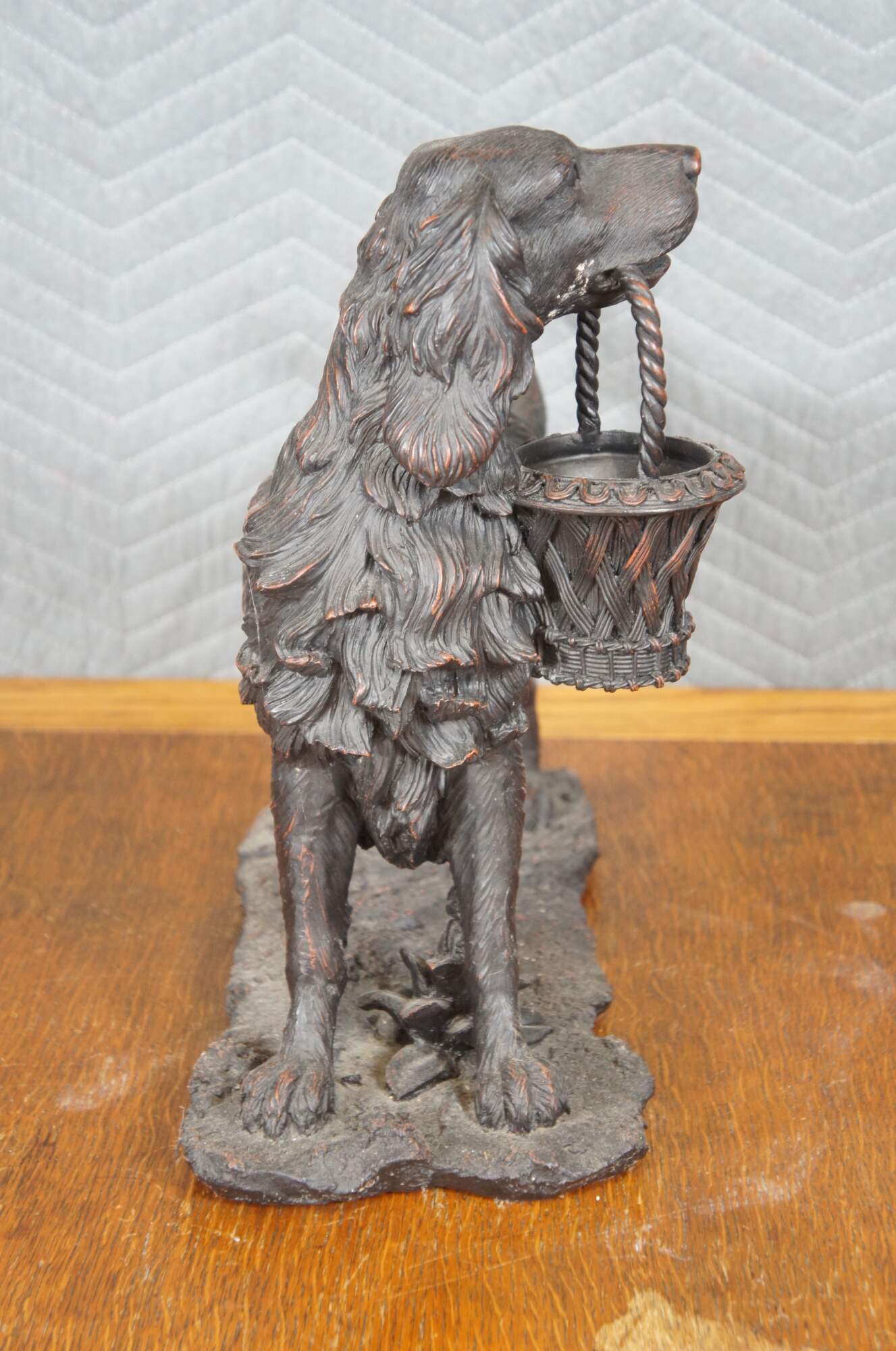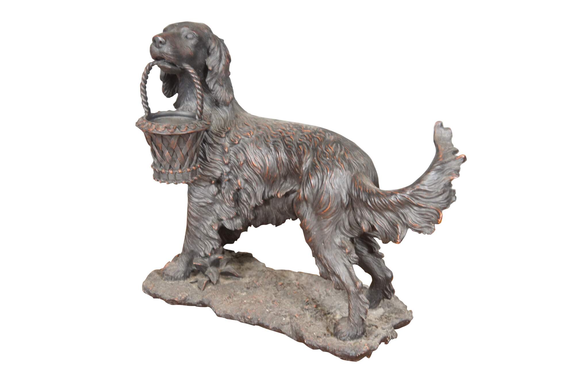 Vintage late 20th century faux bronze figurine / sculpture in the shape of an Irish / English Setter holding a decorative basket in its mouth. By Expo Inc. Composite / resin figurine with a reddish brown finish.