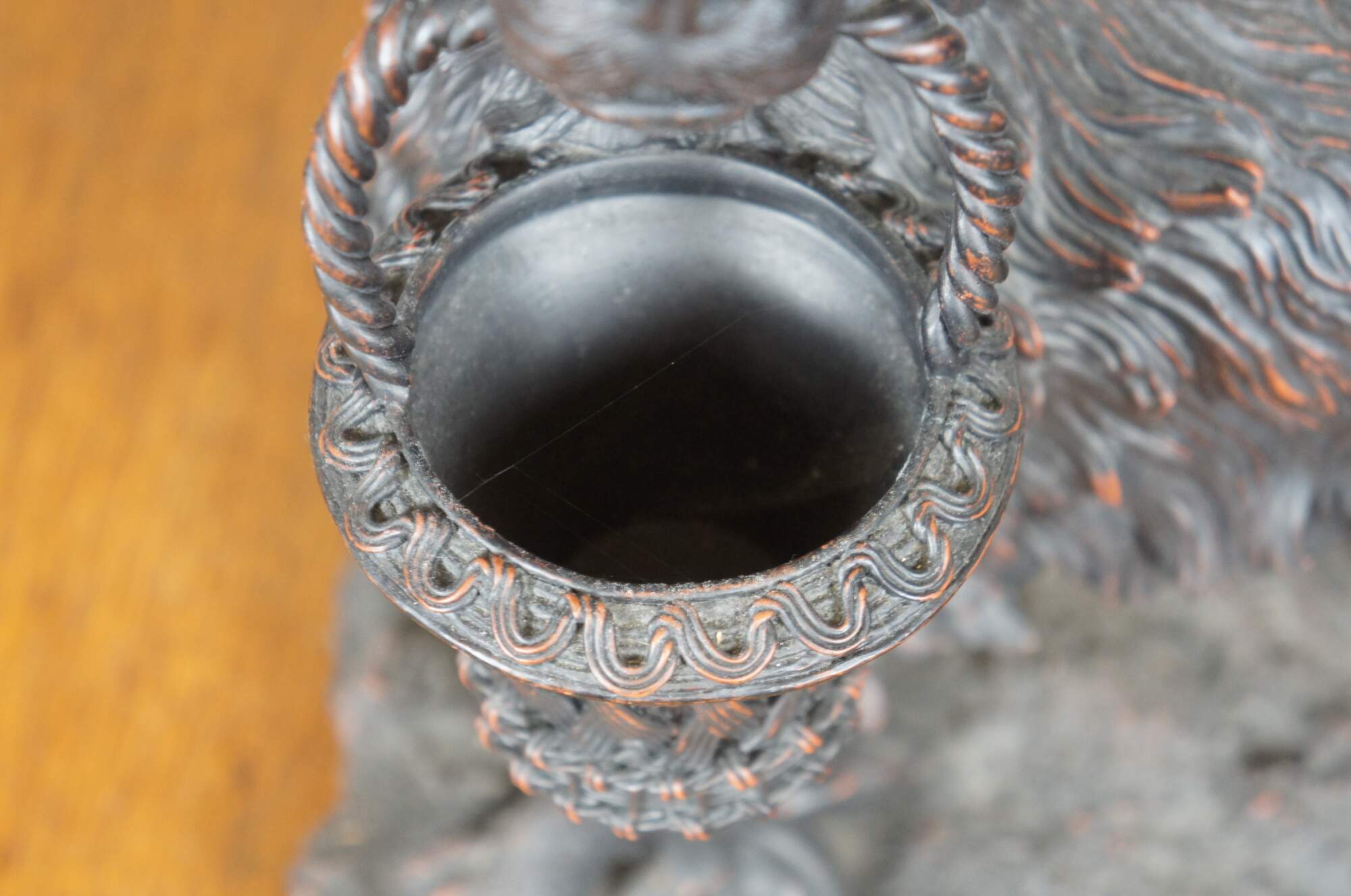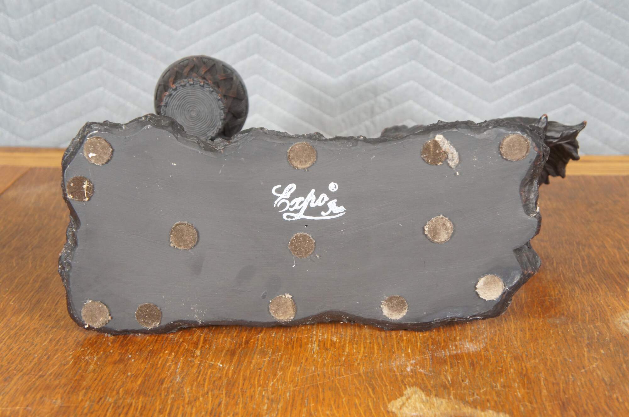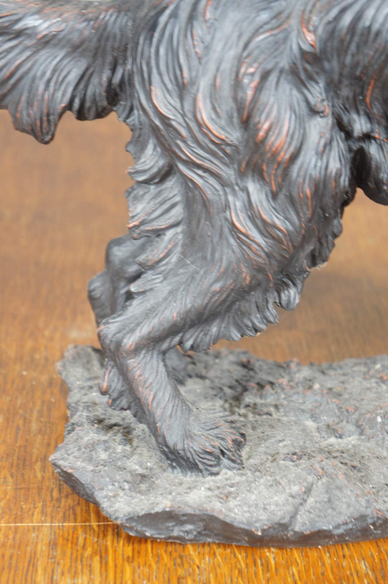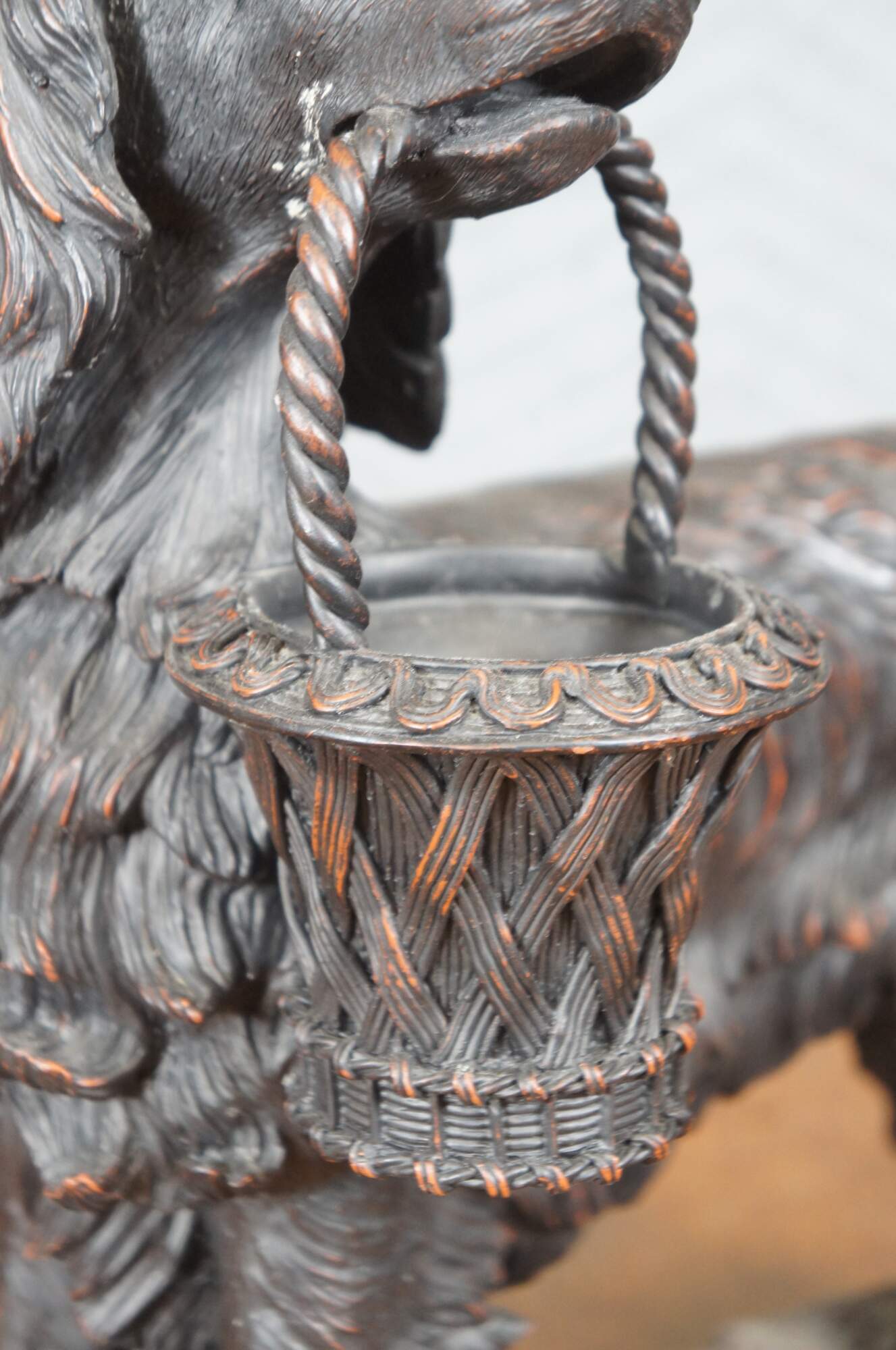 Vintage late 20th century faux bronze figurine / sculpture in the shape of an Irish / English Setter holding a decorative basket in its mouth. By Expo Inc. Composite / resin figurine with a reddish brown finish.