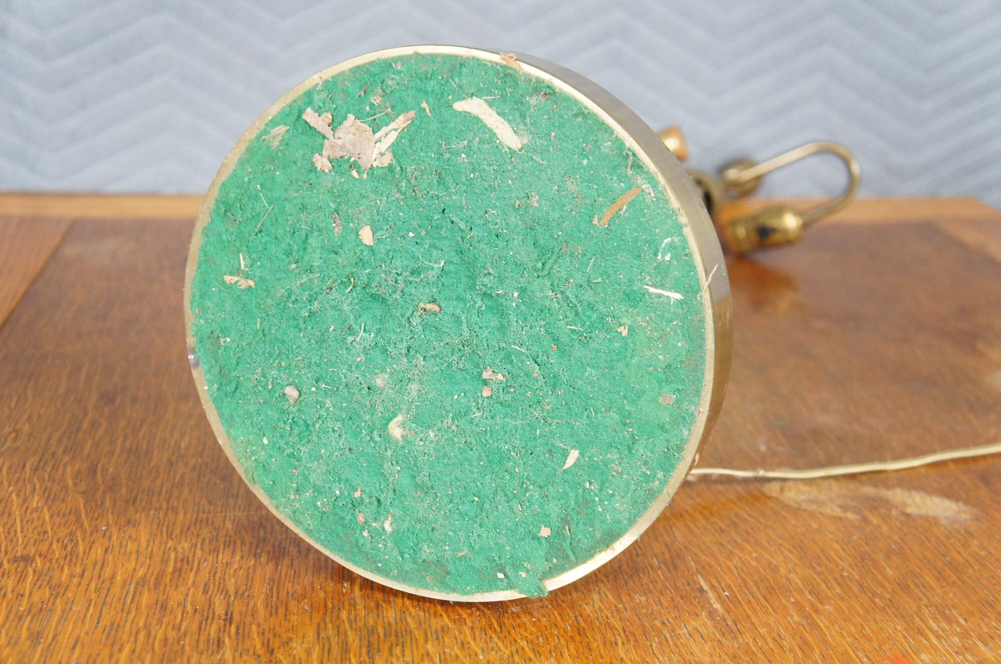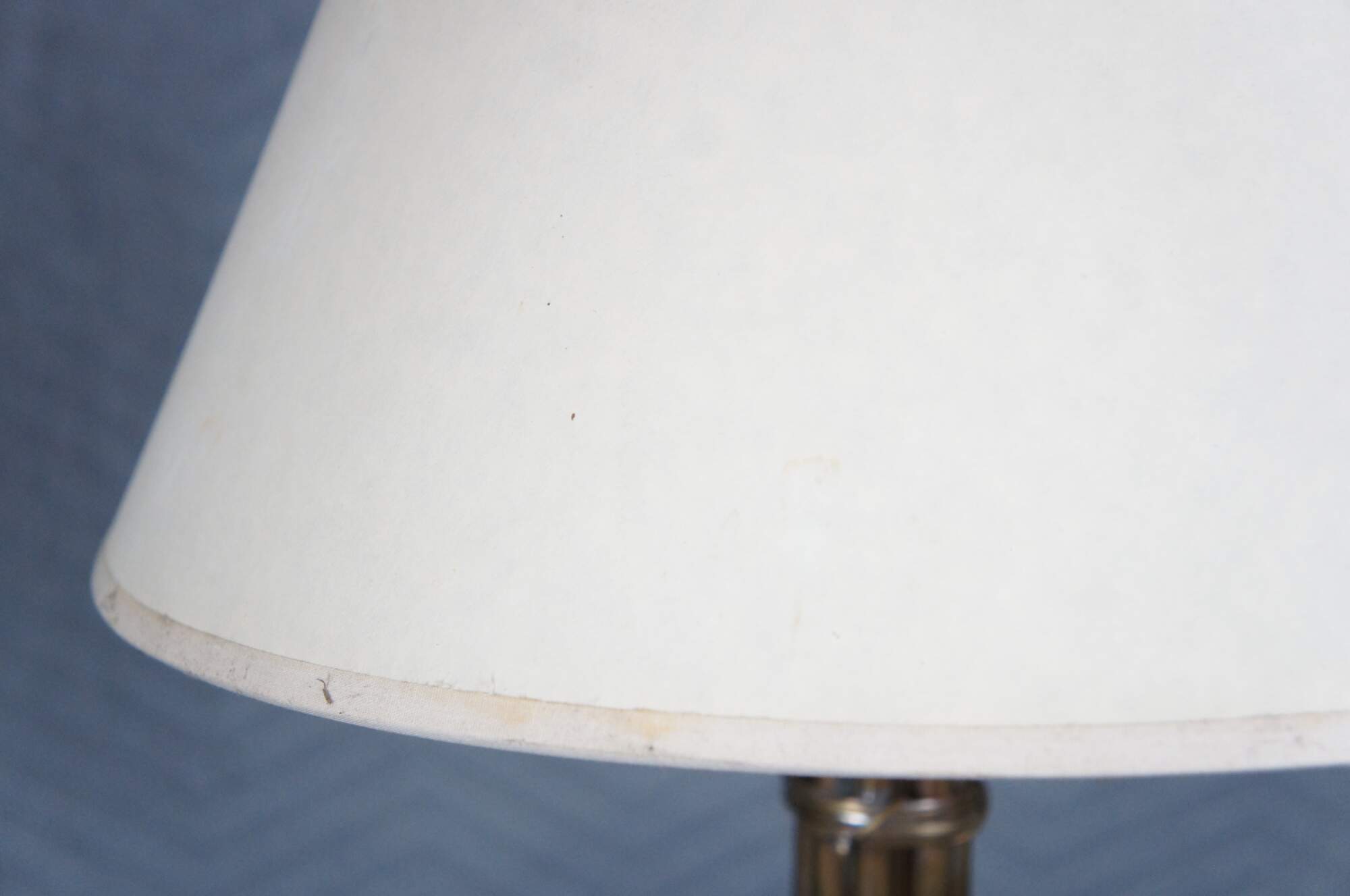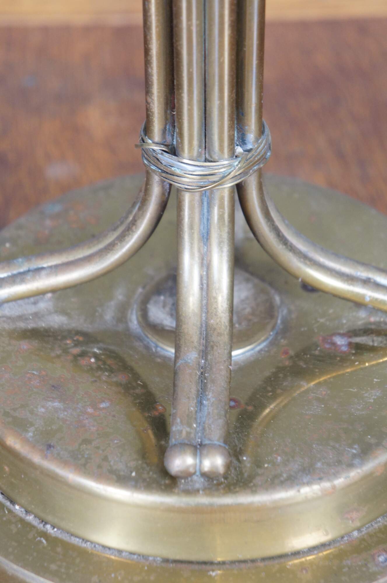 Circa mid 20th century Hart brass two light table lamp in the shape of bamboo or a bundle of rods with a splayed base, perched on around plinth. Includes paper shade and ball shaped finial.