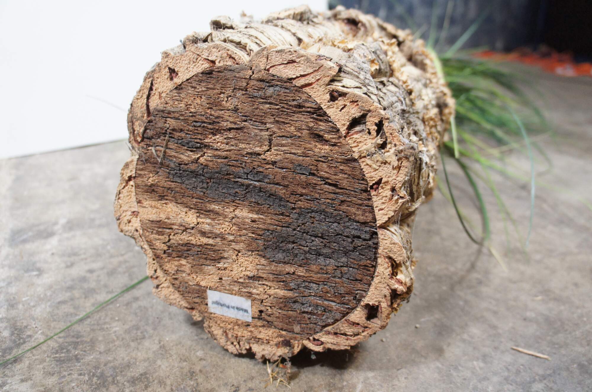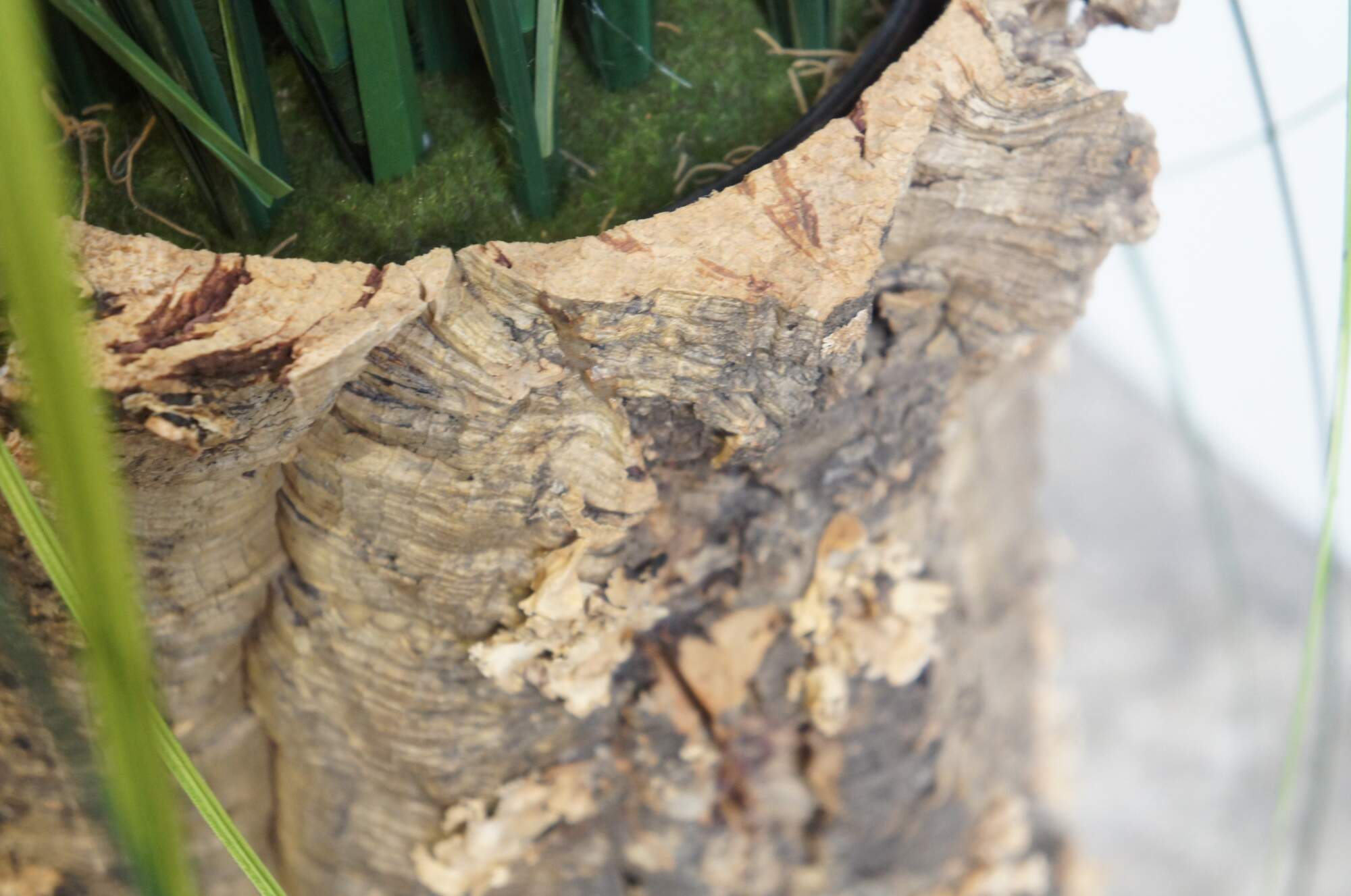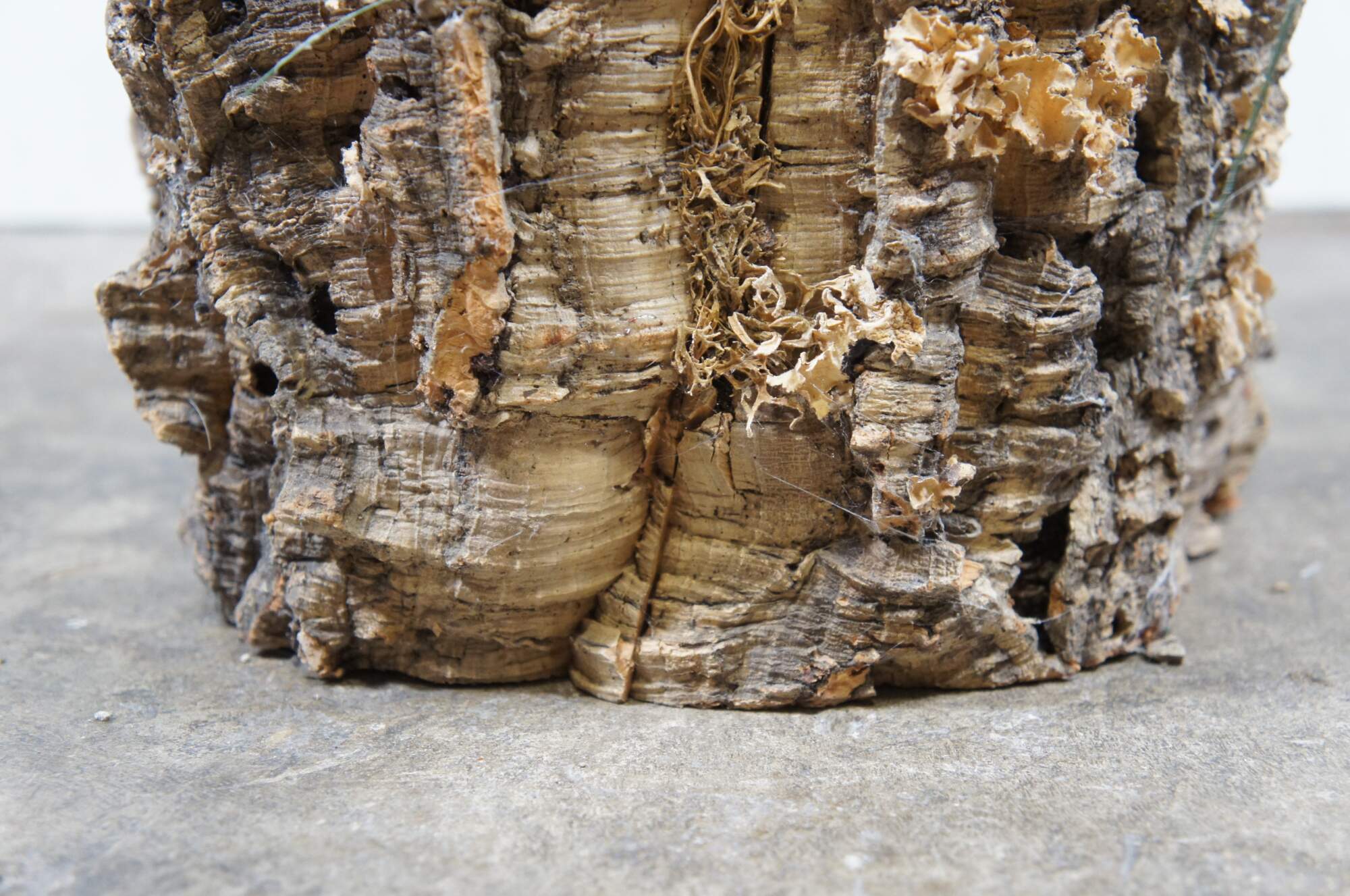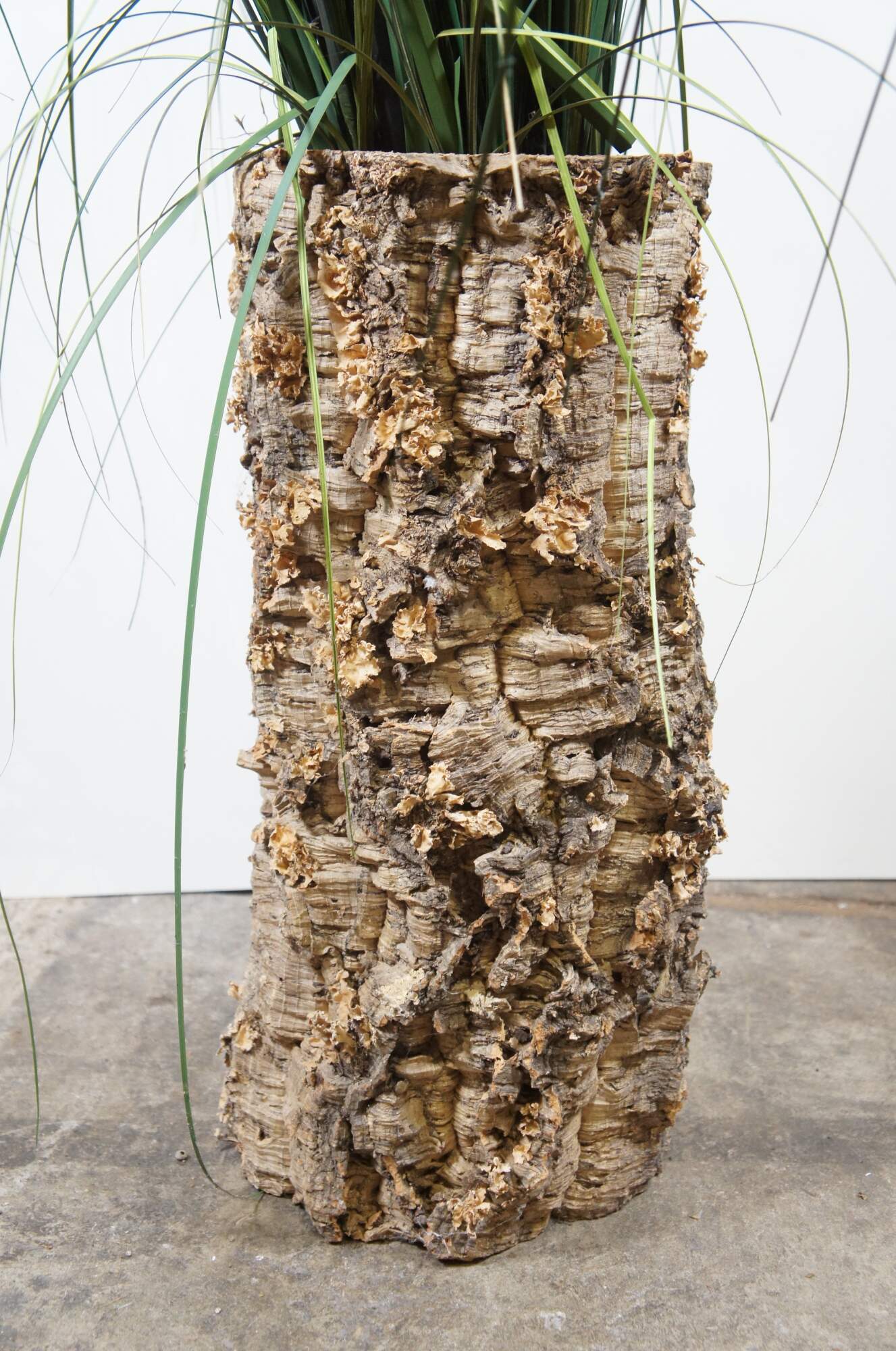Viintage 20th century natural cork wood cylindrical floor vase / umbrella stand. Crafted from a hollowed cork oak trunk / limb with bark. Made in Portugal. Includes snugly fitted faux grass and bamboo plant.