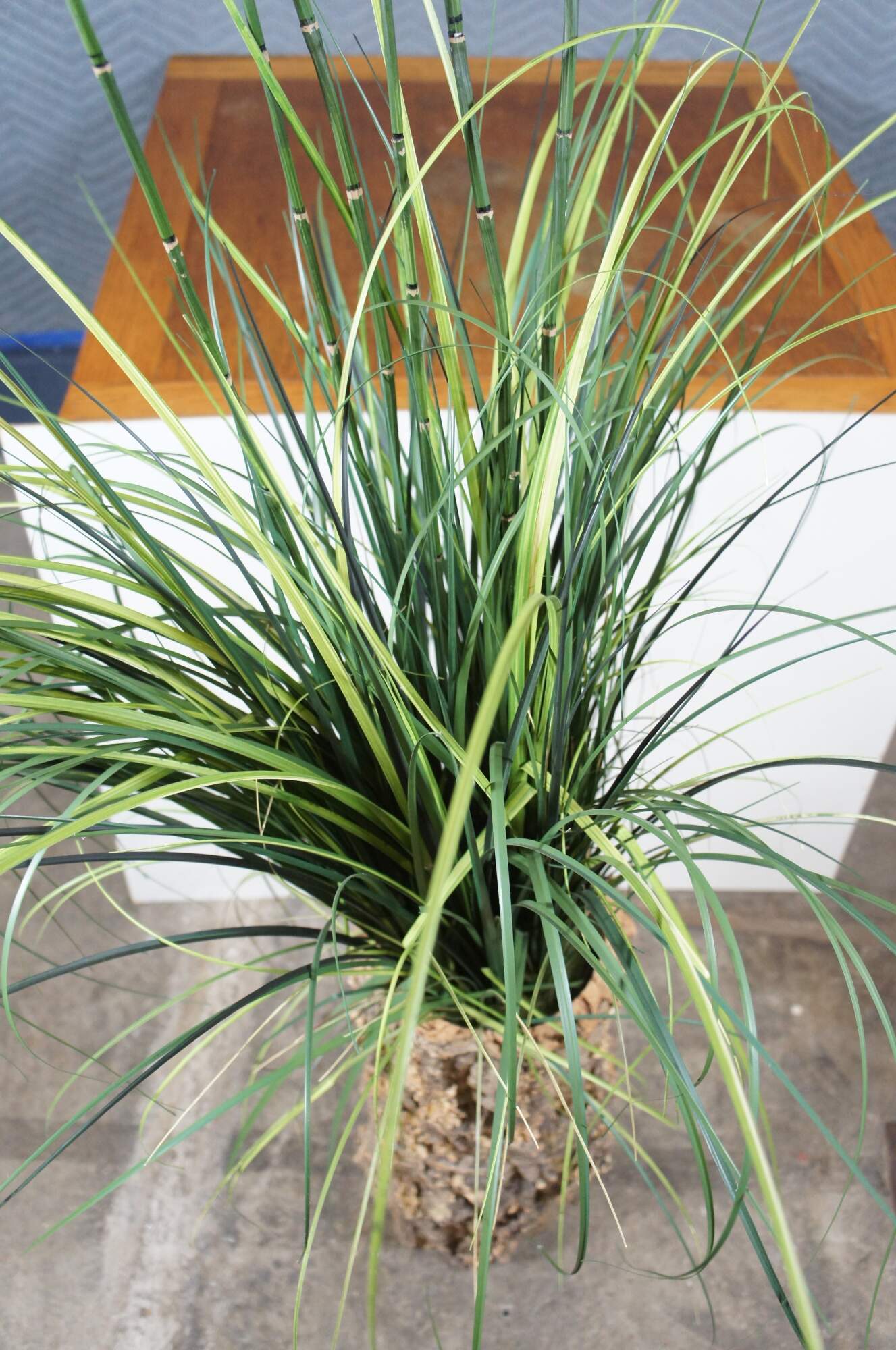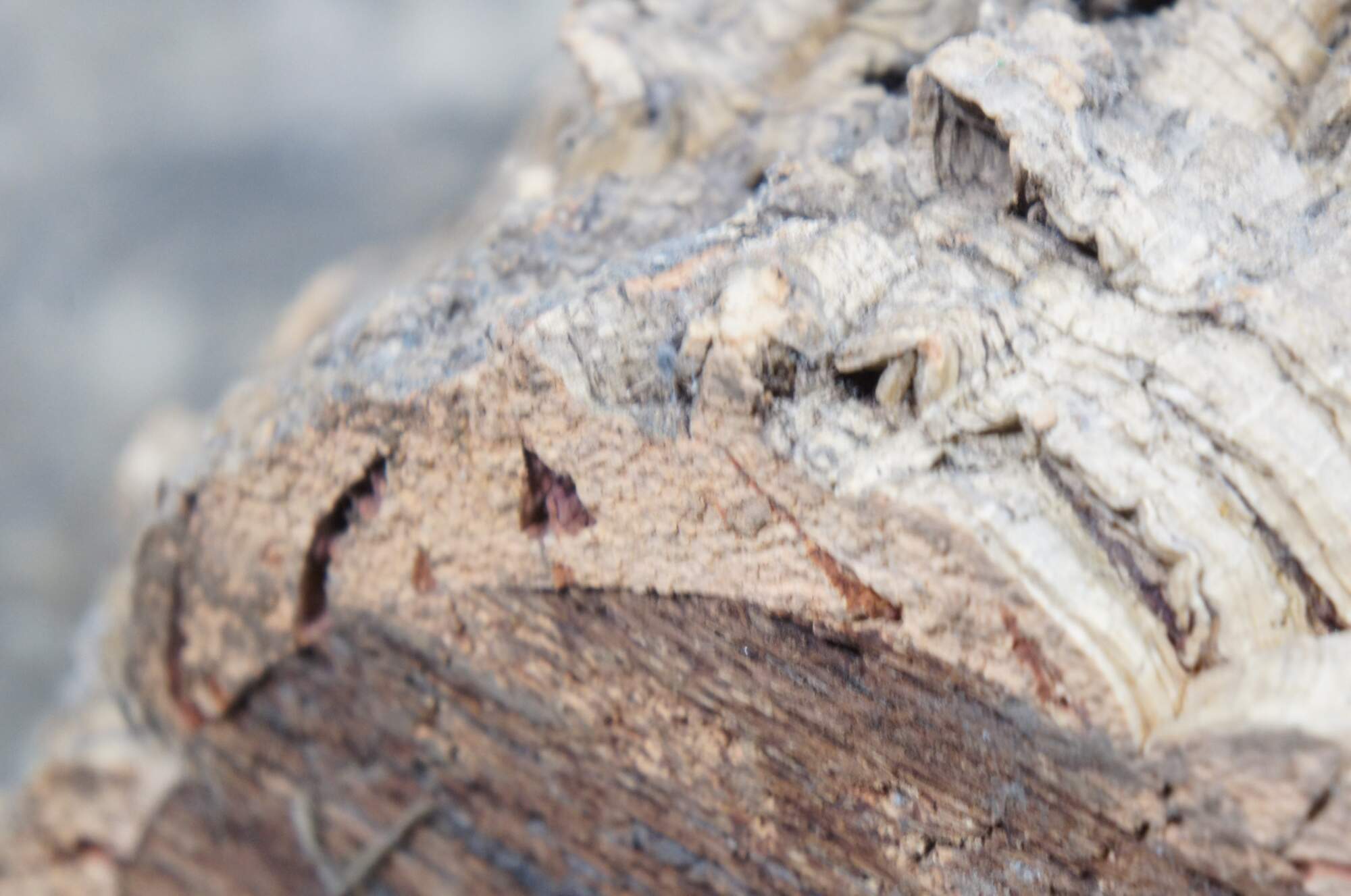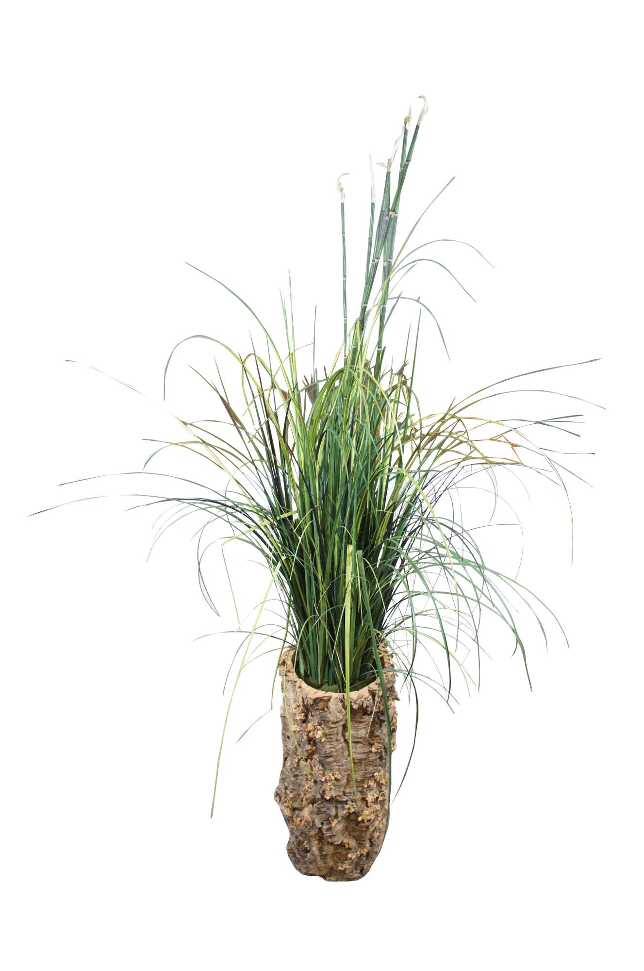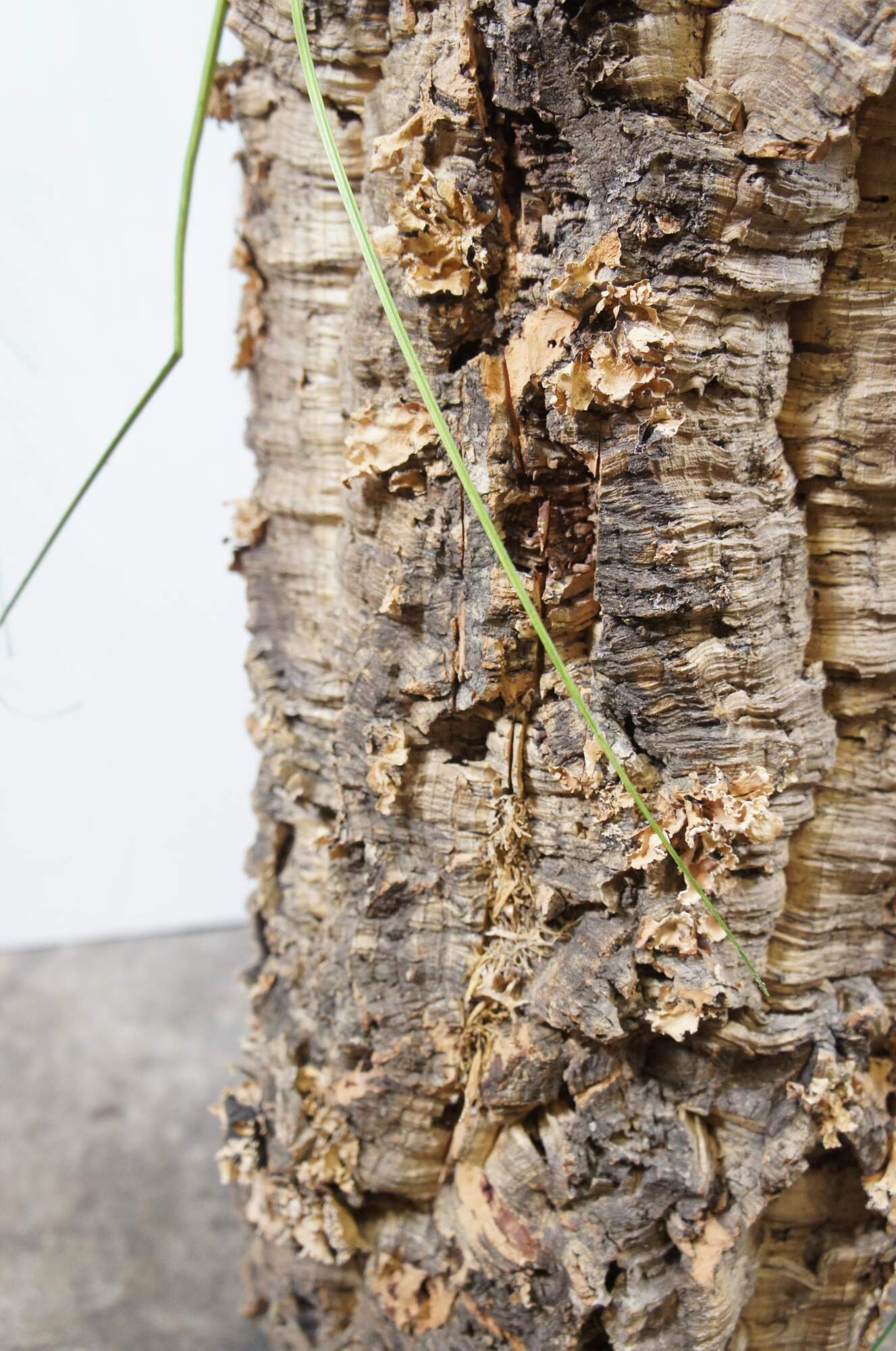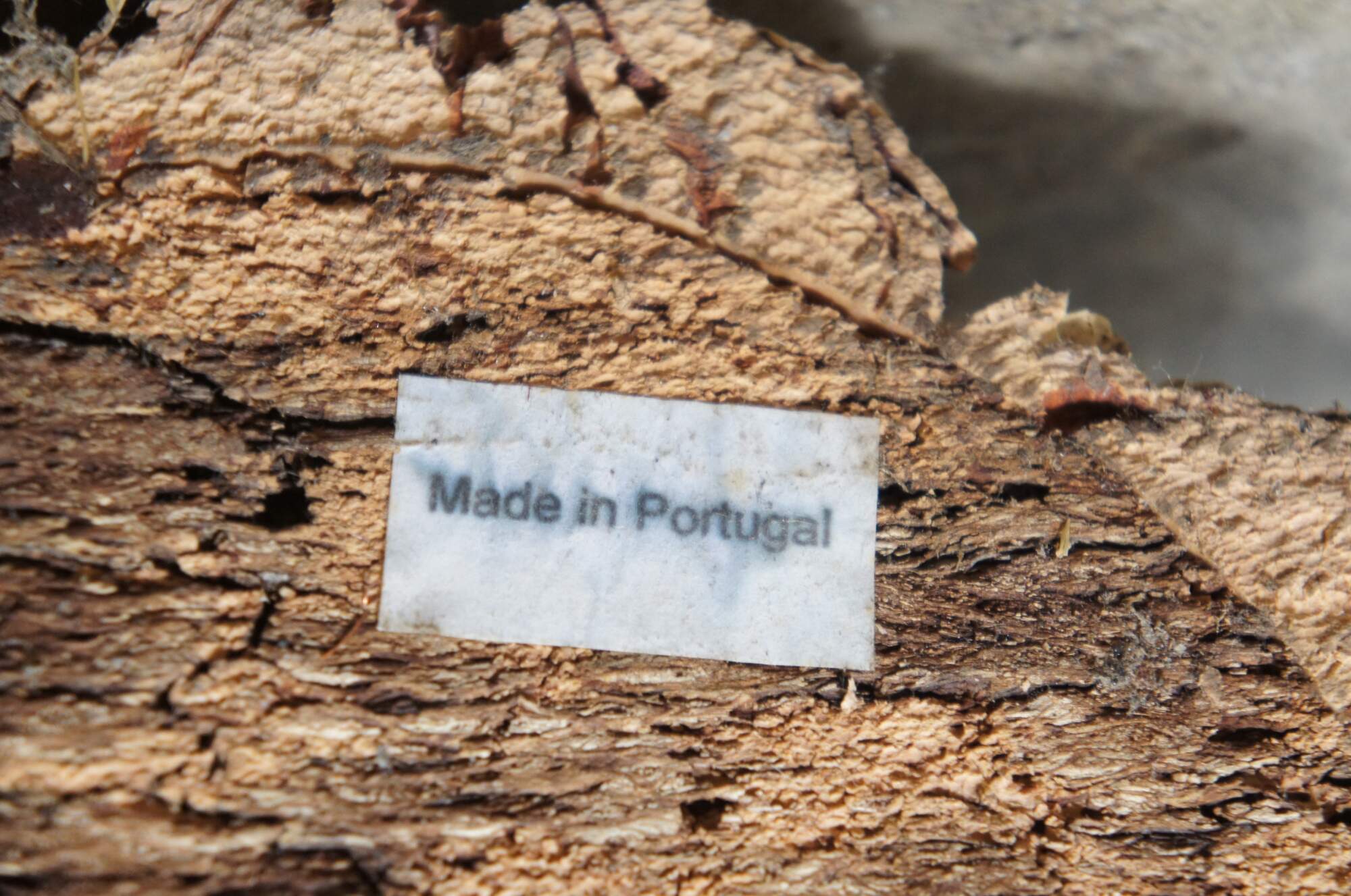 Viintage 20th century natural cork wood cylindrical floor vase / umbrella stand. Crafted from a hollowed cork oak trunk / limb with bark. Made in Portugal. Includes snugly fitted faux grass and bamboo plant.