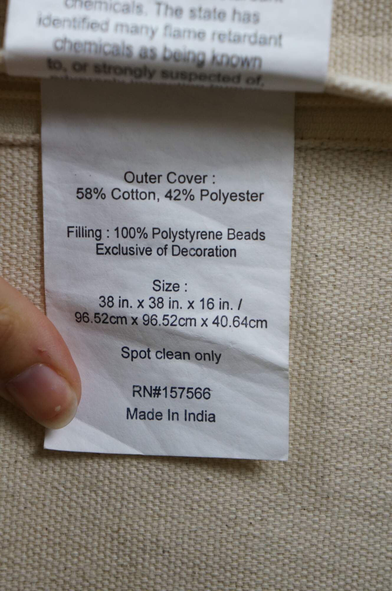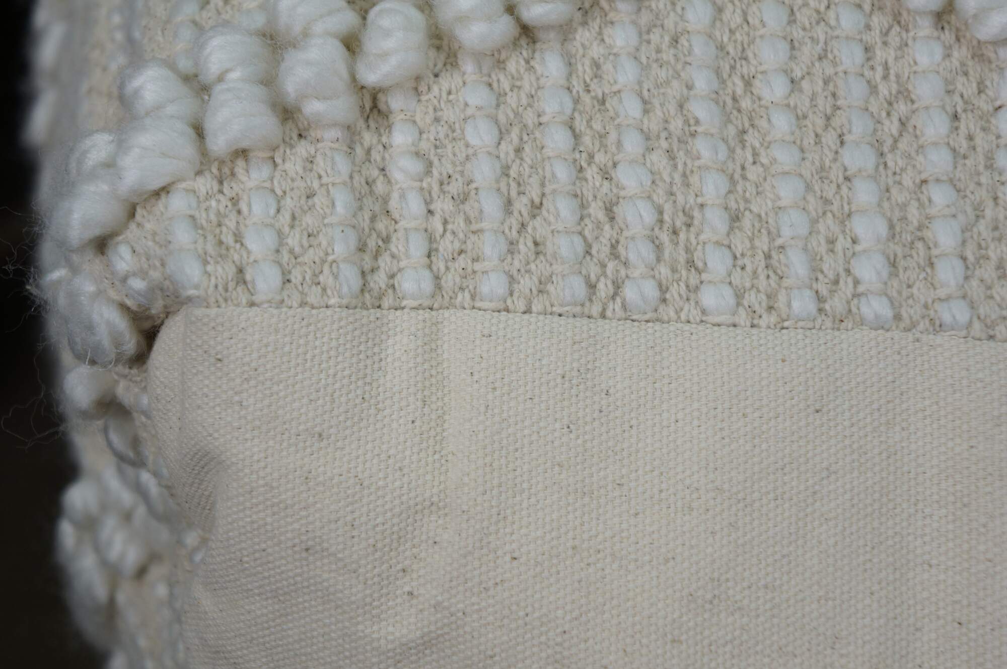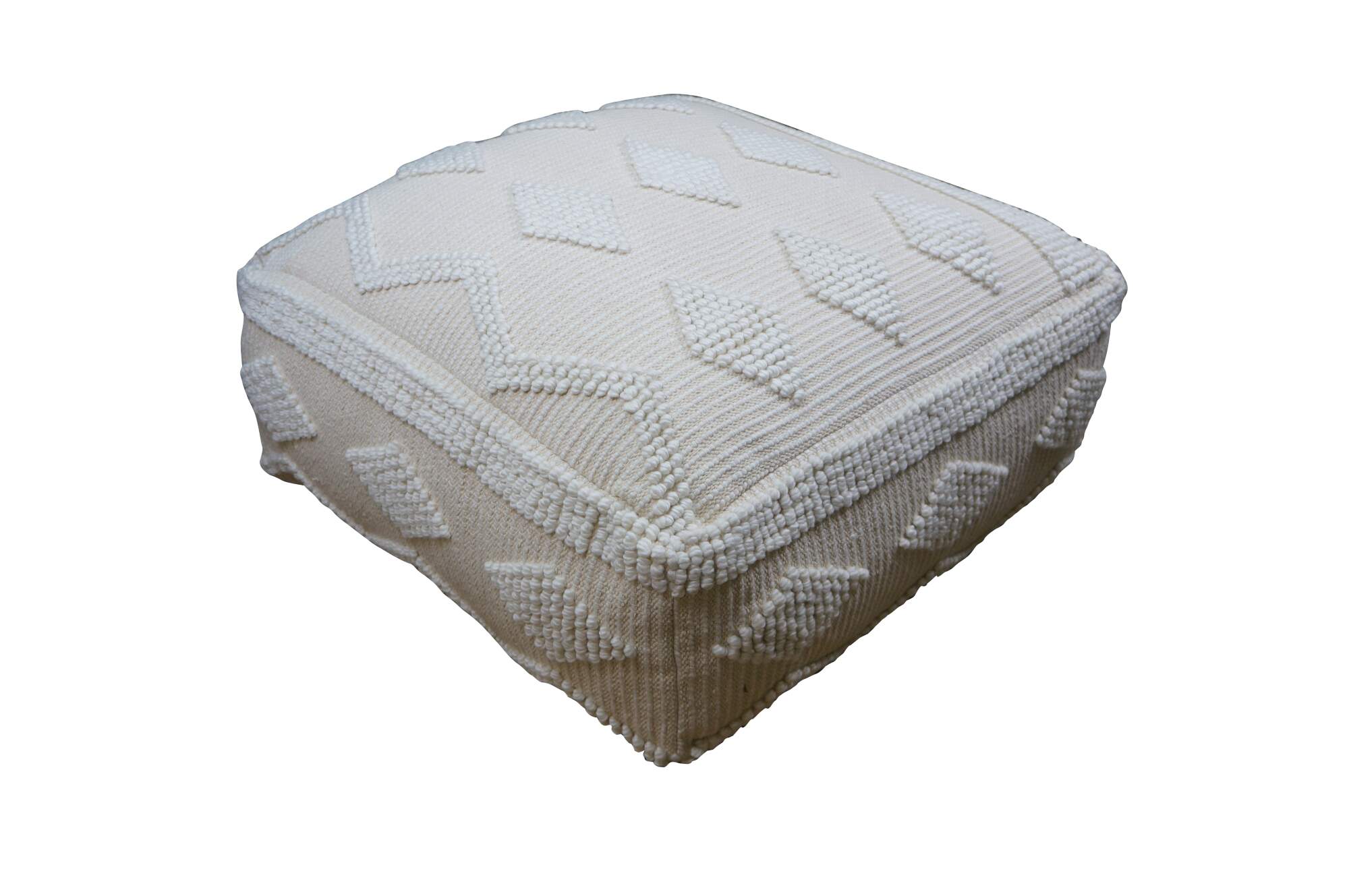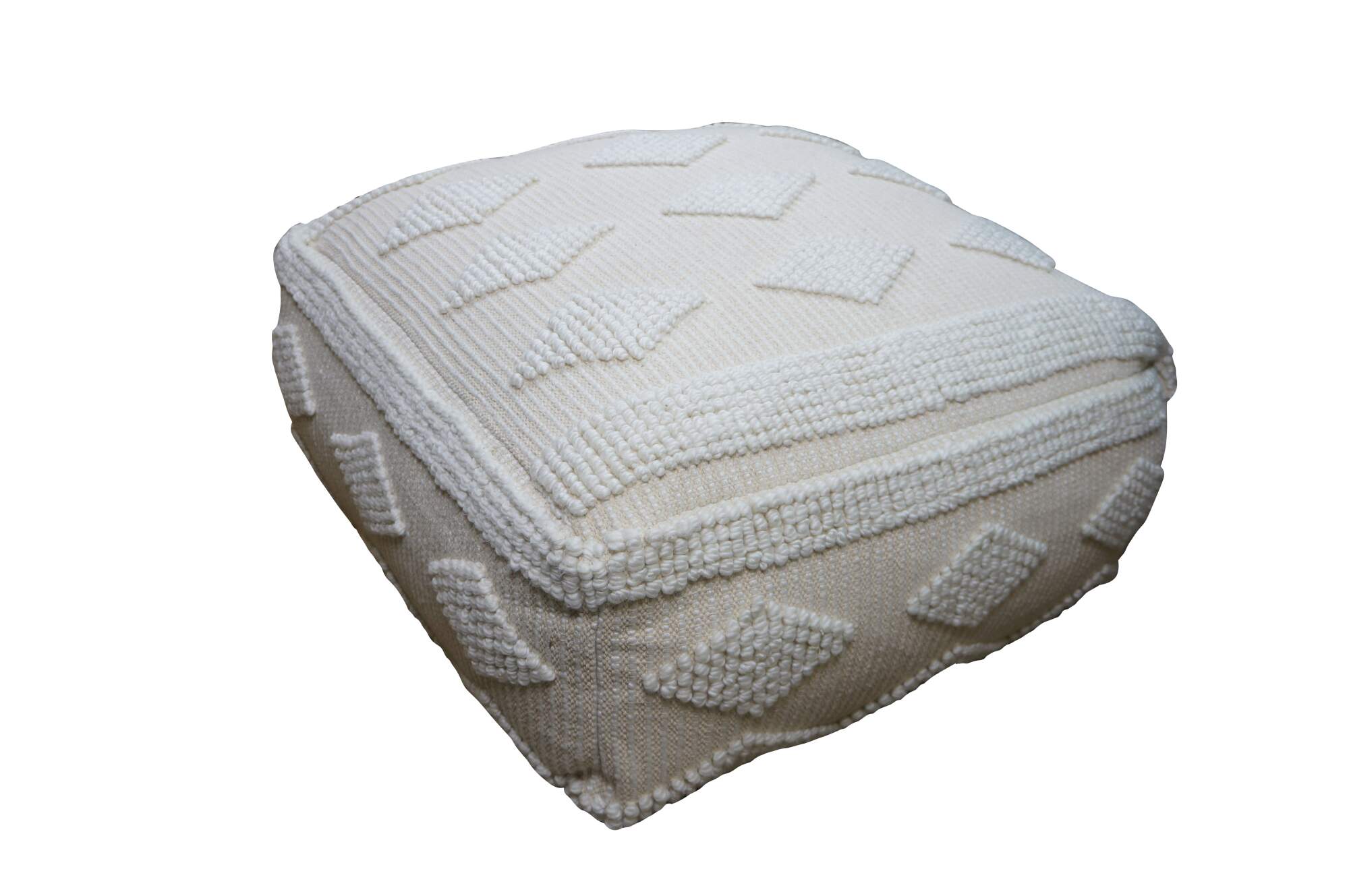Early 21st century Anji Mountain woven pouf. Cube-shaped bean bag / ottoman featuring off-white fabric woven with dimensional stripes, chevrons, and diamonds in white. Outer cover: 58% cotton / 42% polyester. Filling: 100% polystyrene beads. Made in India.