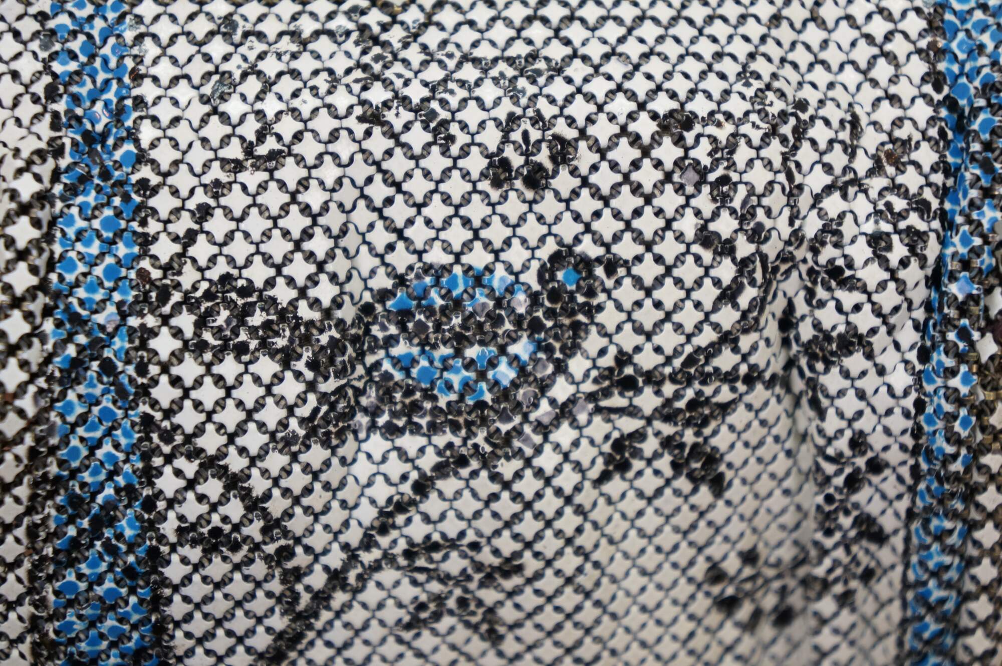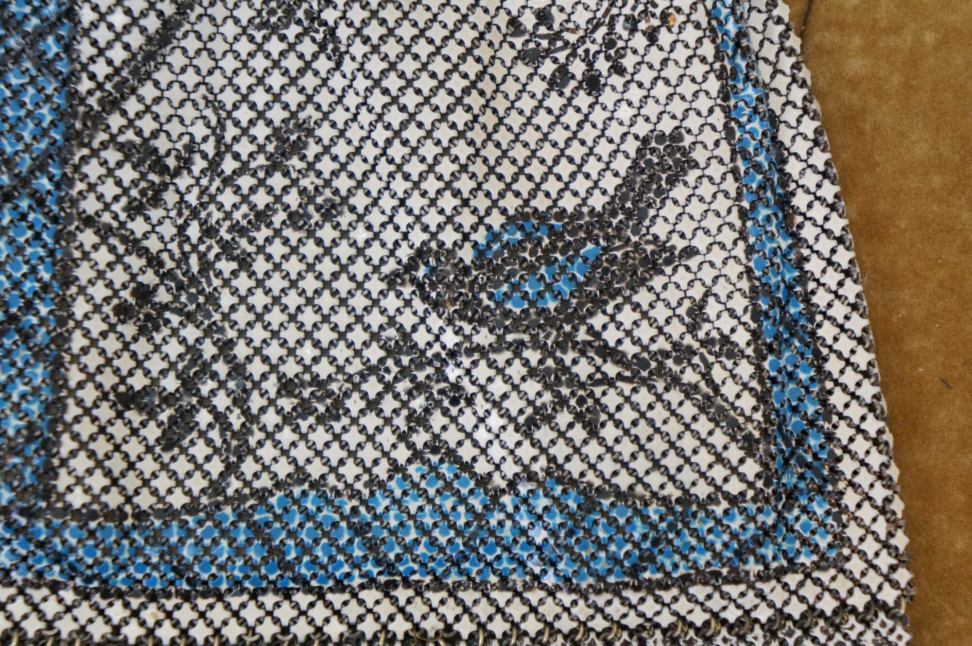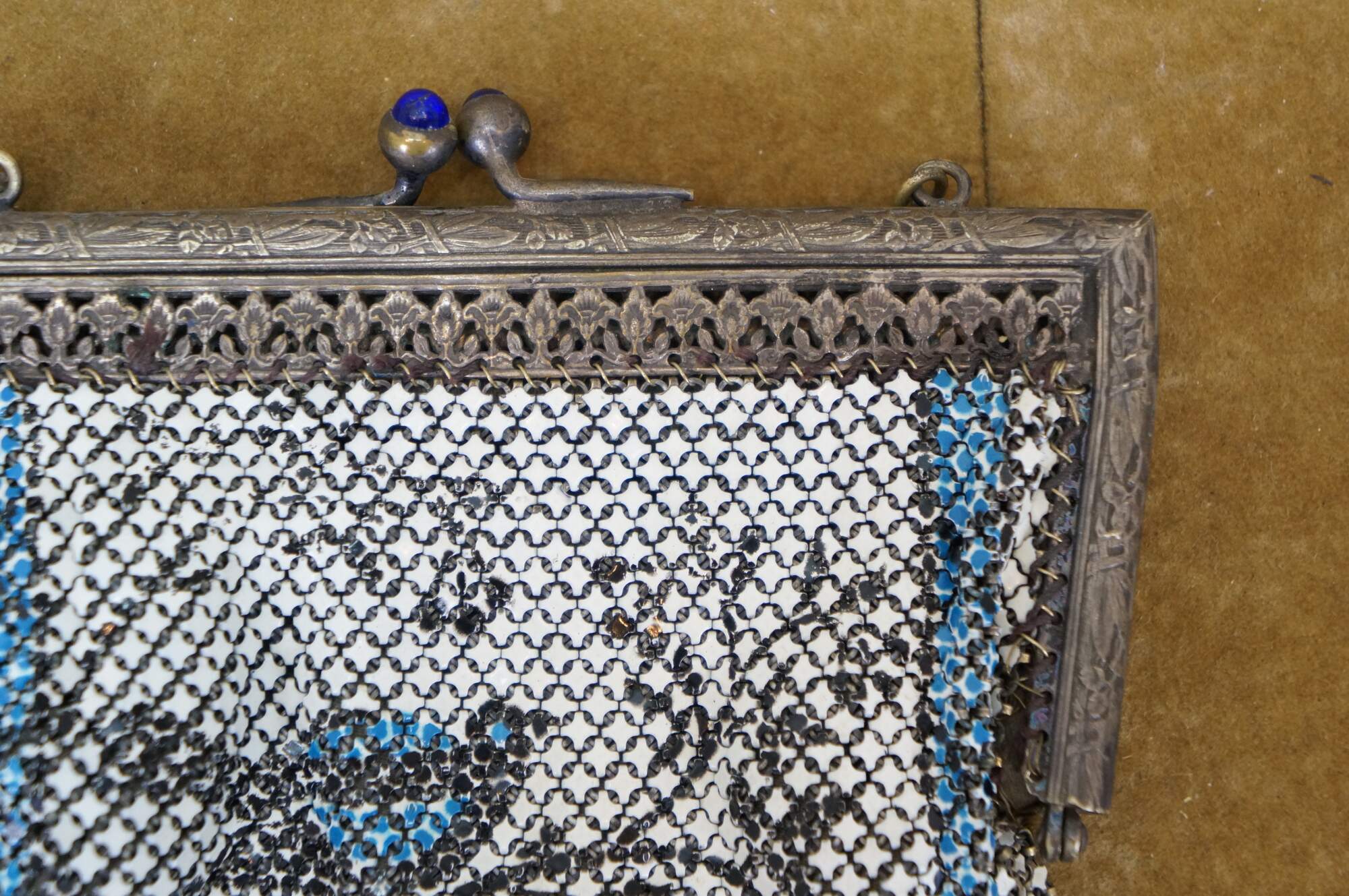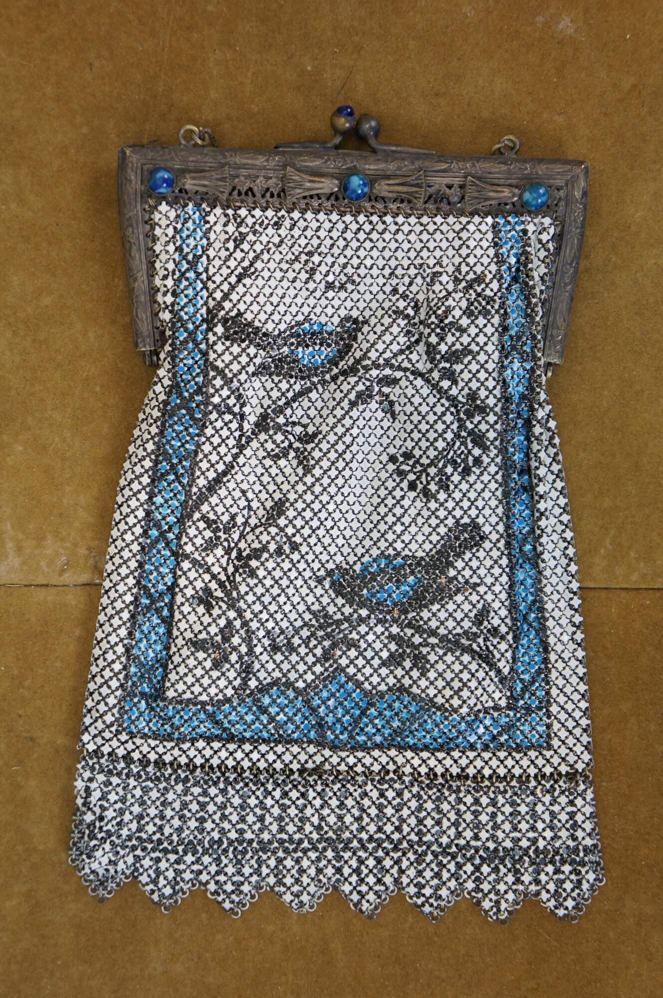 Antique circa 1920's Art Nouveau Whiting and Davis "Elsah" metal mesh evening bag / purse. Rectangular shape with scalloped fringe, painted in white with a design of birds and branches in blue and black. Art nouveau style clamshell clasp decorated with flowers and tassels, studded with lapis lazuli blue stones. Chain features textured links. Gray cloth interior.