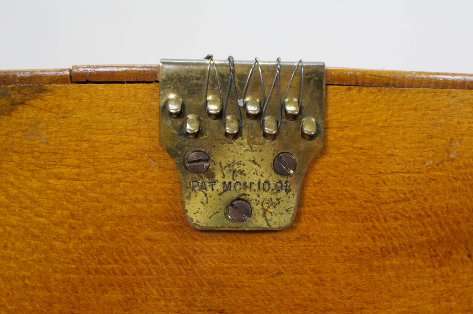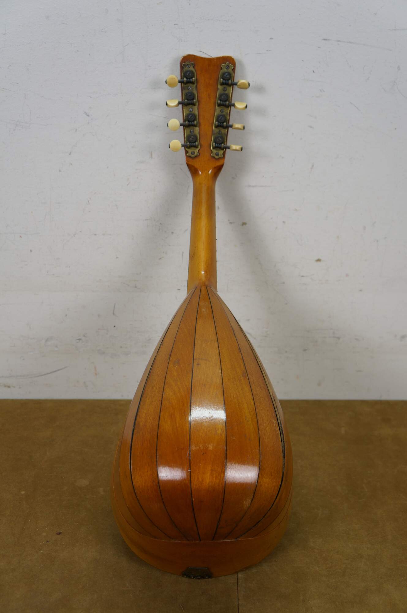 Late 19th to early 20th century Lakeside eight string, bowl back mandolin guitar by Lyon & Healy. Made of maple with angled cant and head, segmented bowl back. Ebonized oxbow shaped scratchplate / pickguard, fret / fingerboard, and bridge. Bone tuning pegs. Numbered 16561. Tail piece marked Pat Mch 10 91.