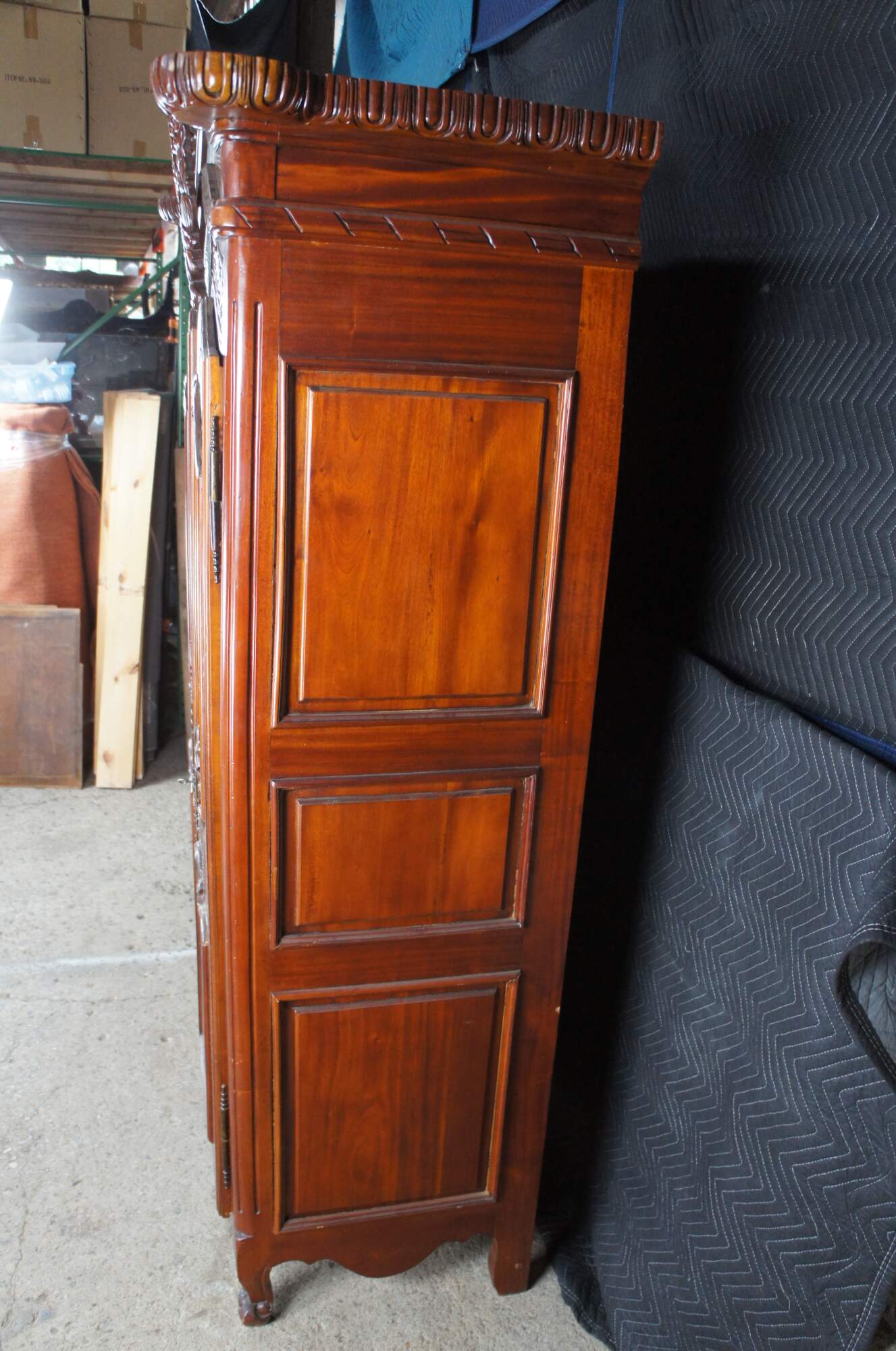 Vintage French Louis XV / Provincial style wedding armoire / wardrobe / linen press or display cabinet, circa last quarter 20th century. Made of mahogany featuring baroque styling with a carved crown over a floral bird theme. The armoire has paneled doors with beveled glass top allowing for use as a display cabinet. The central portion of the doors have oval carved floral catouches. The cabinet opens to two wooden shelves. The shelves could be removed allowing the cabinet to be used as a hanging wardrobe. The cabinet is supported by short cabriole legs at the front and straight legs along the rear.