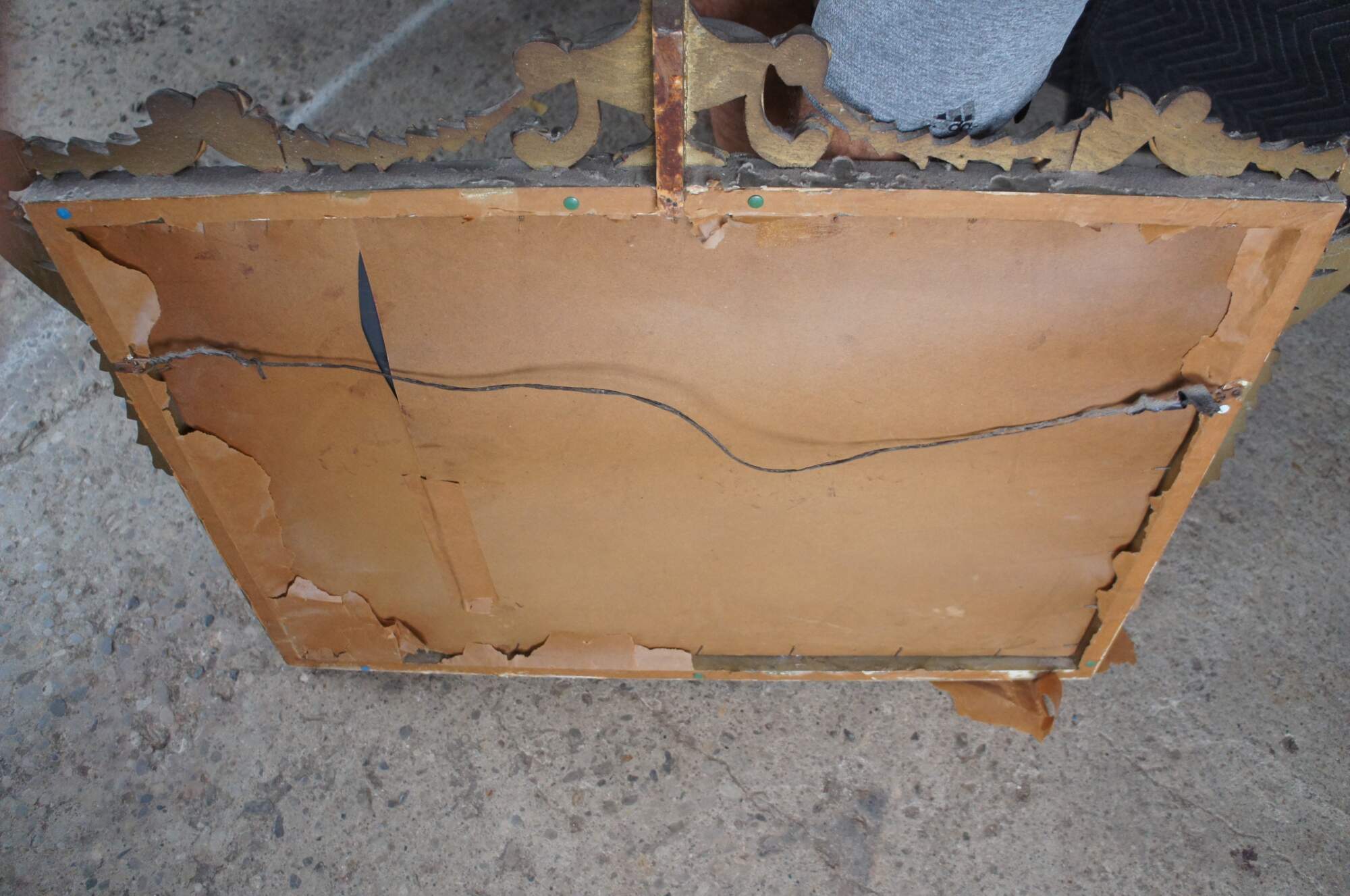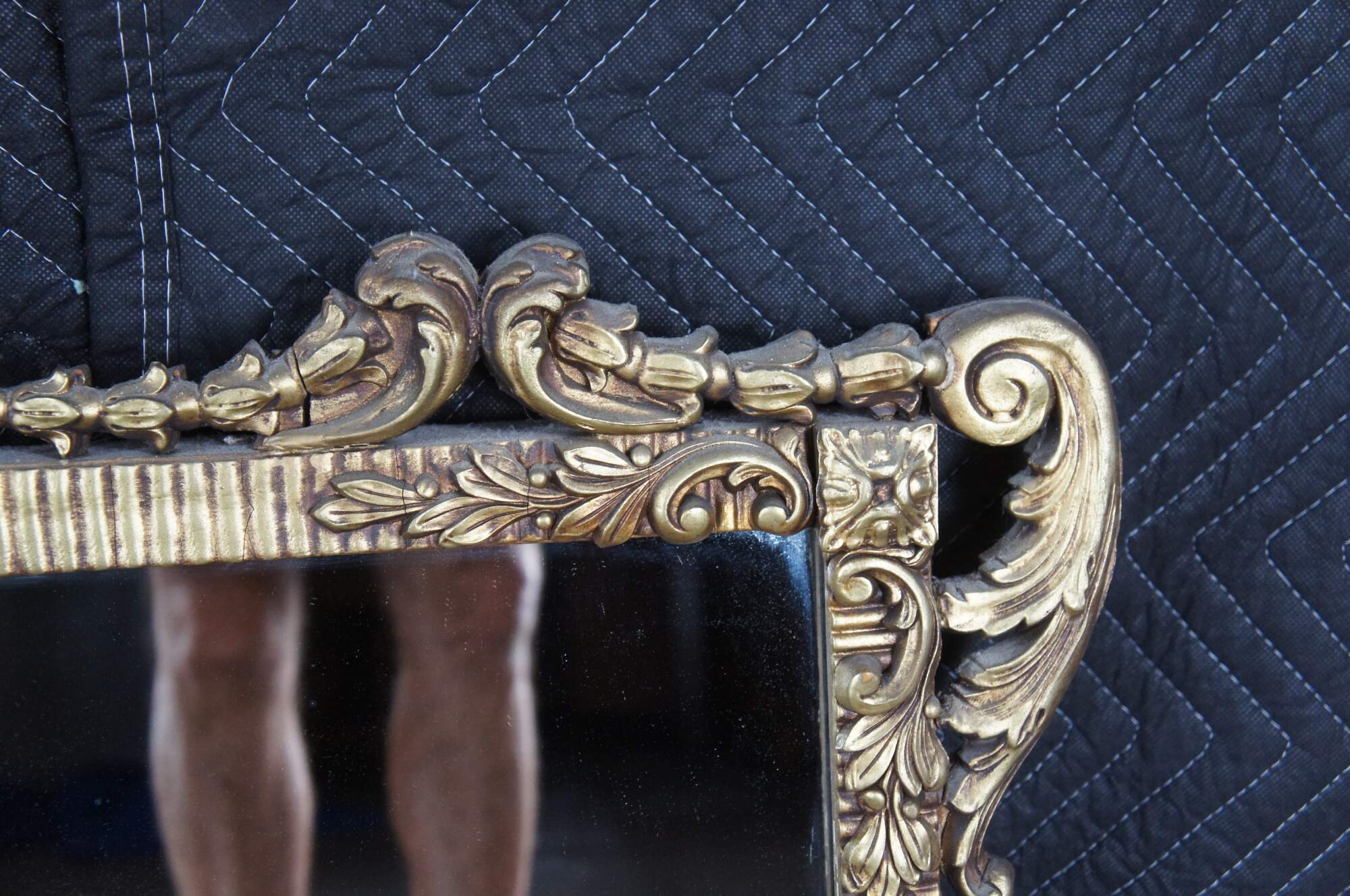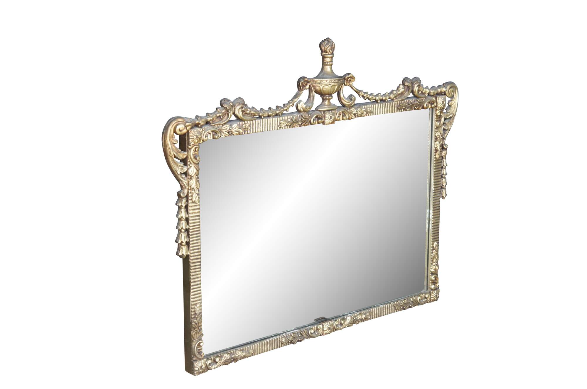 A charming early 20th-century French Neoclassical-inspired mirror. Features a Greek urn-shaped crown with Neoclassical swags and foliate detail. The rectangular frame showcases French medallions, foliate vine detail, 'C' scrolled accents, and ribbing.