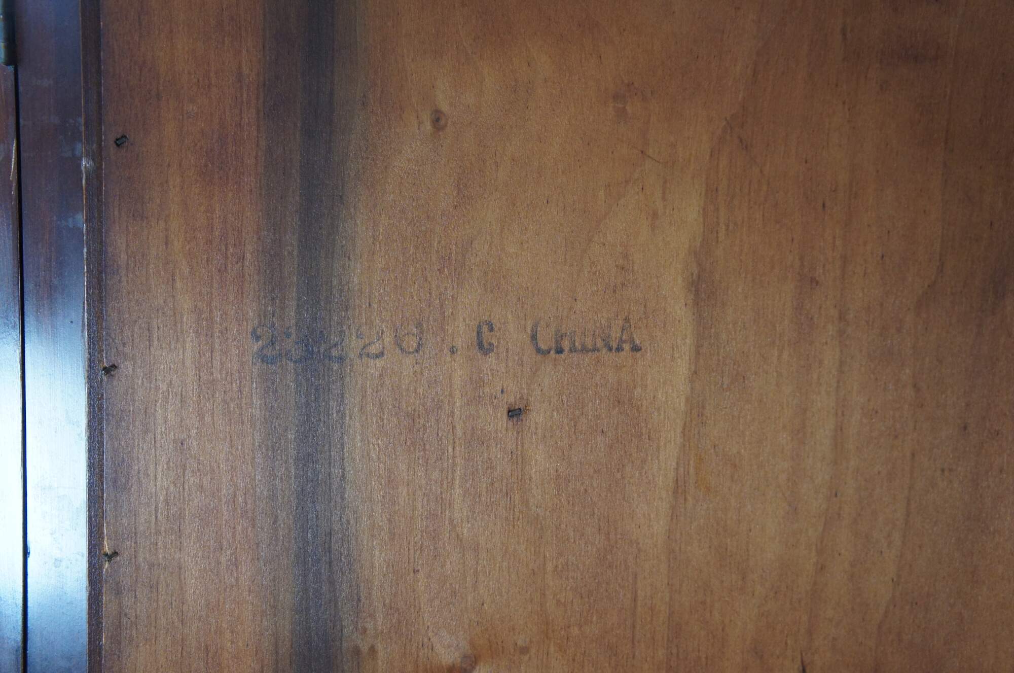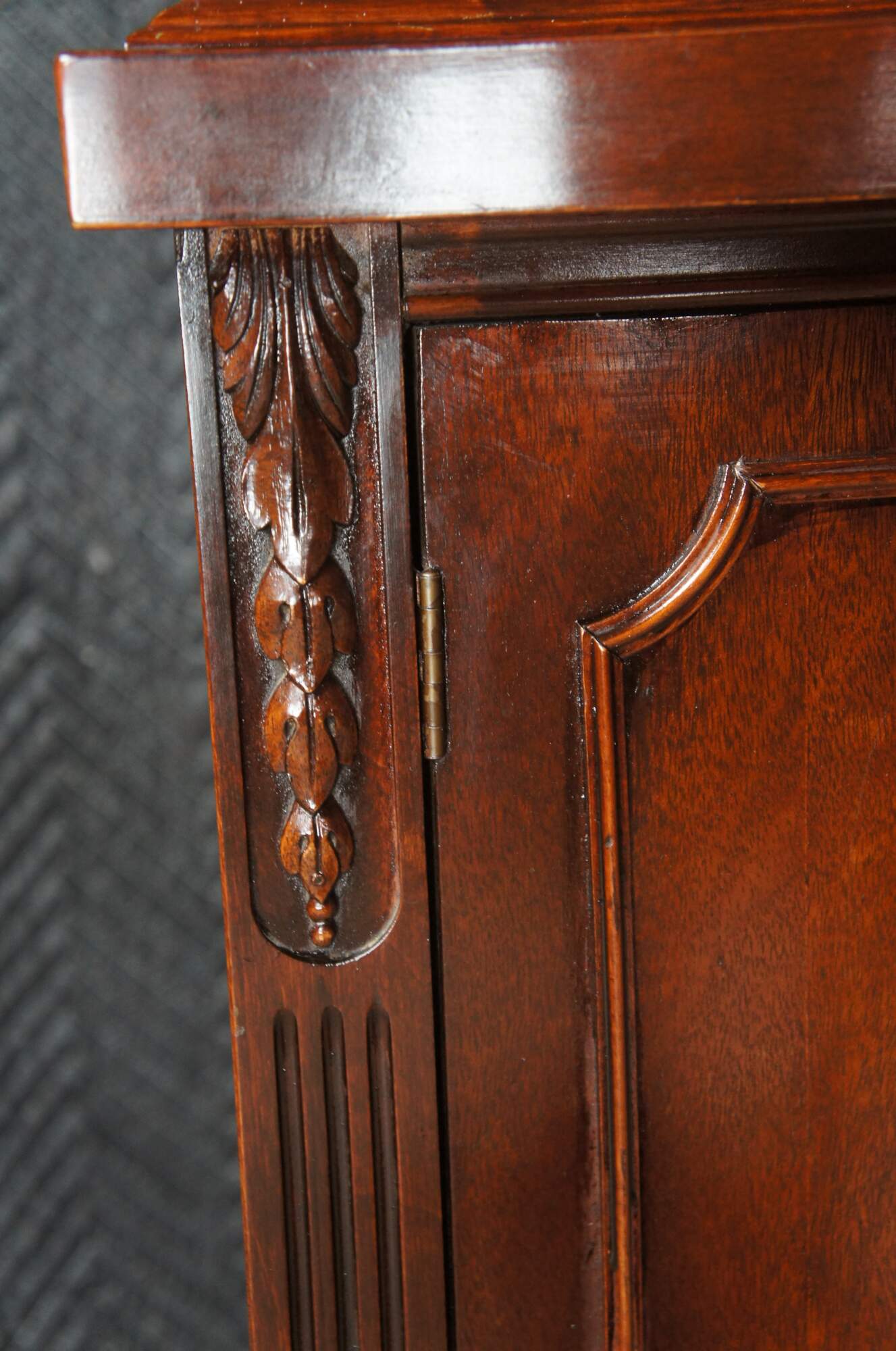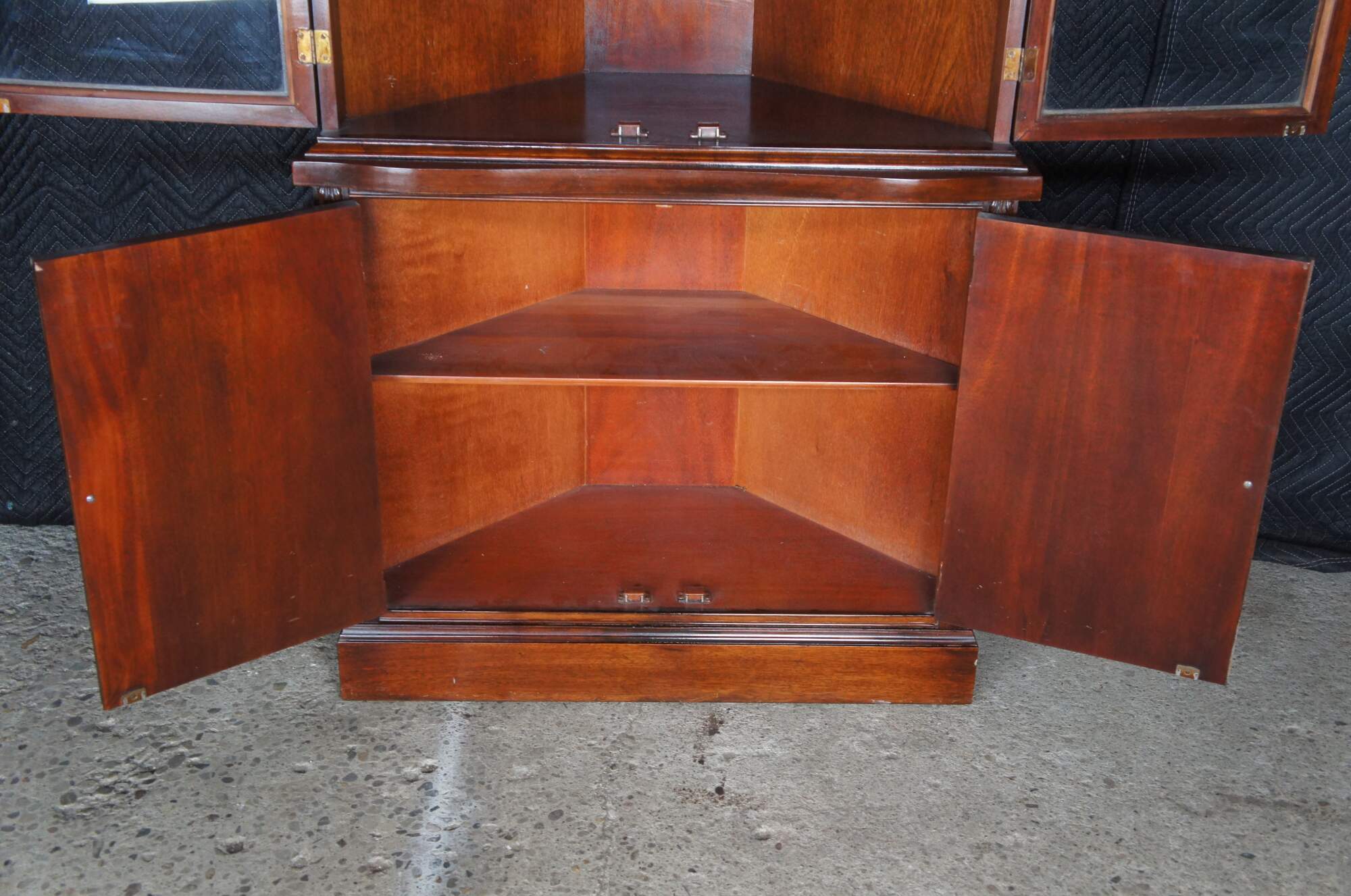 Traditional glass front corner cabinet, c. 1940s. Features a mahogany case with two glass covered doors along the front. The cabinet opens to two shelves with plate grooves along the top over a lower cabinet with shelf for accessory storage. Marked 23226 C. China along the back.