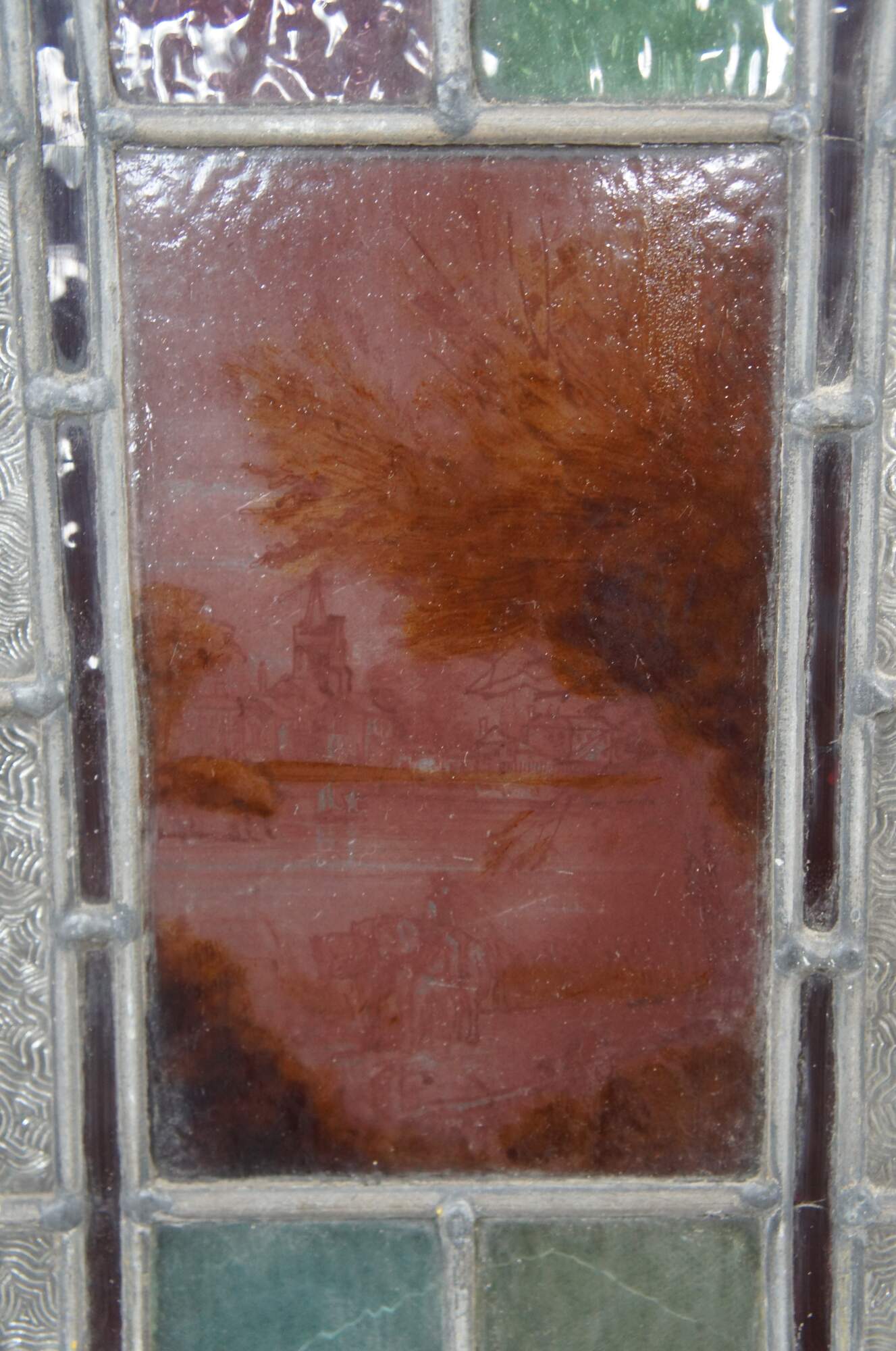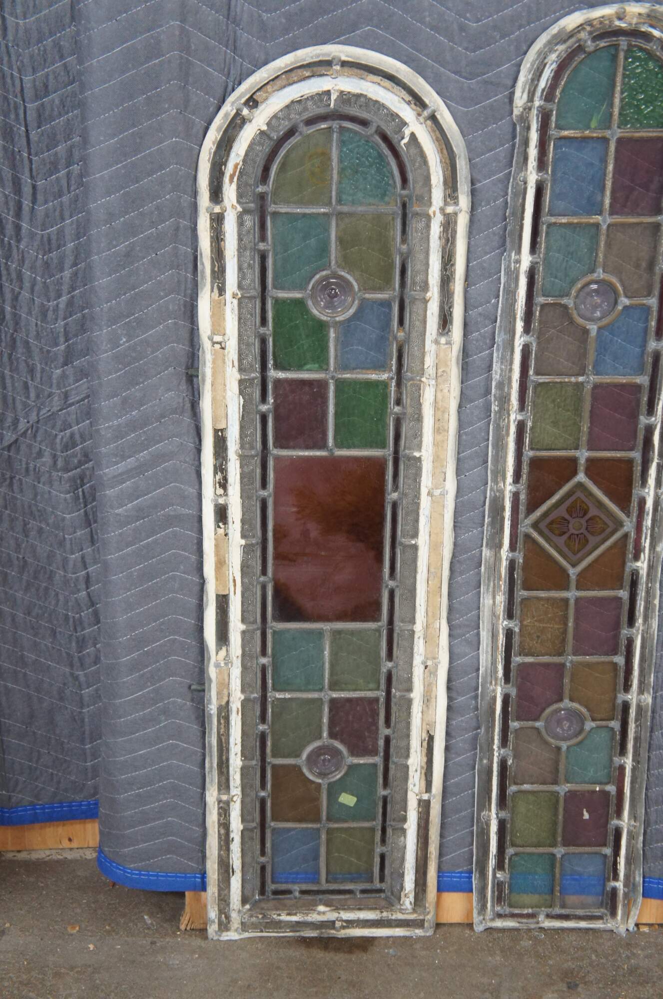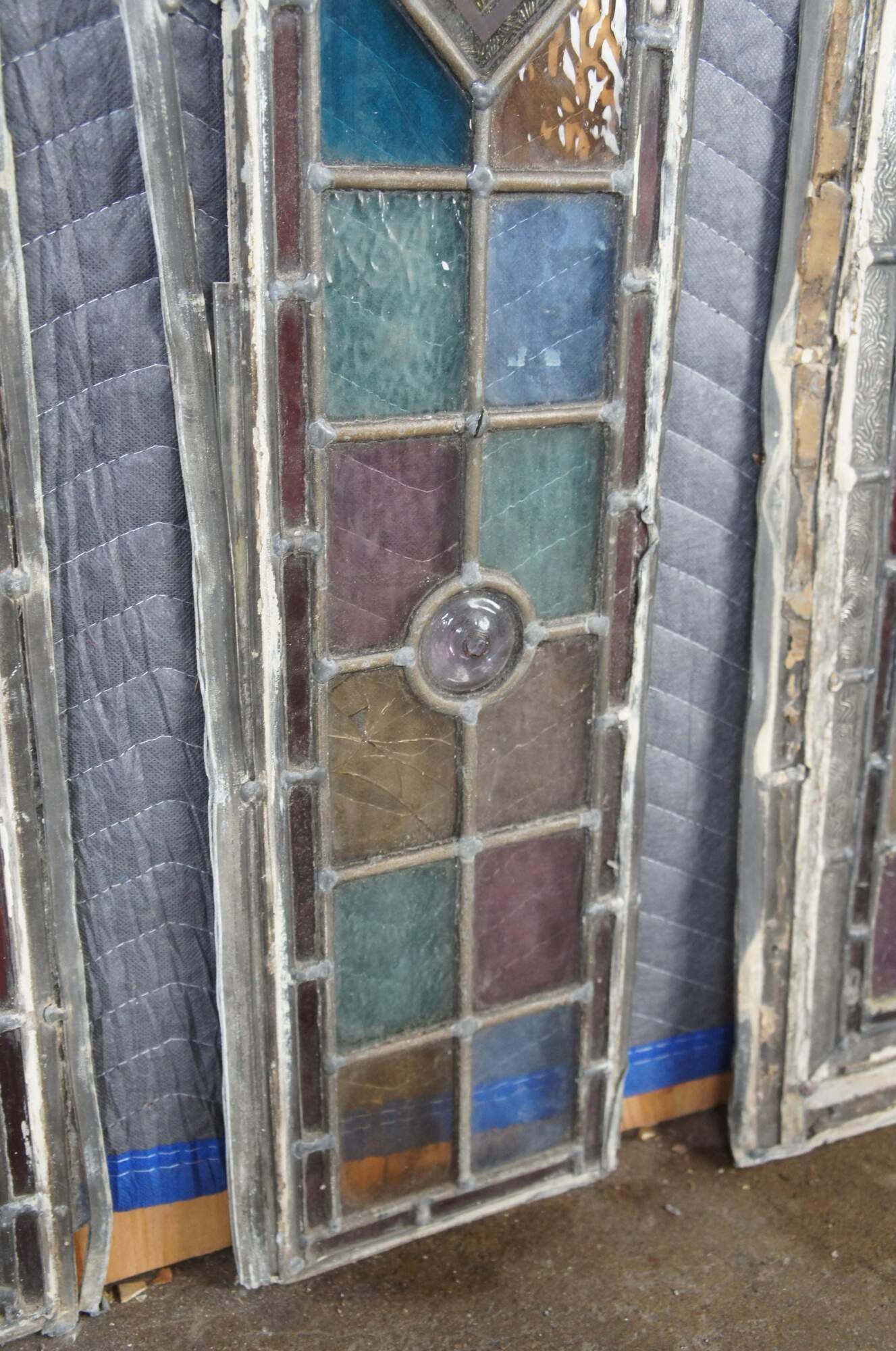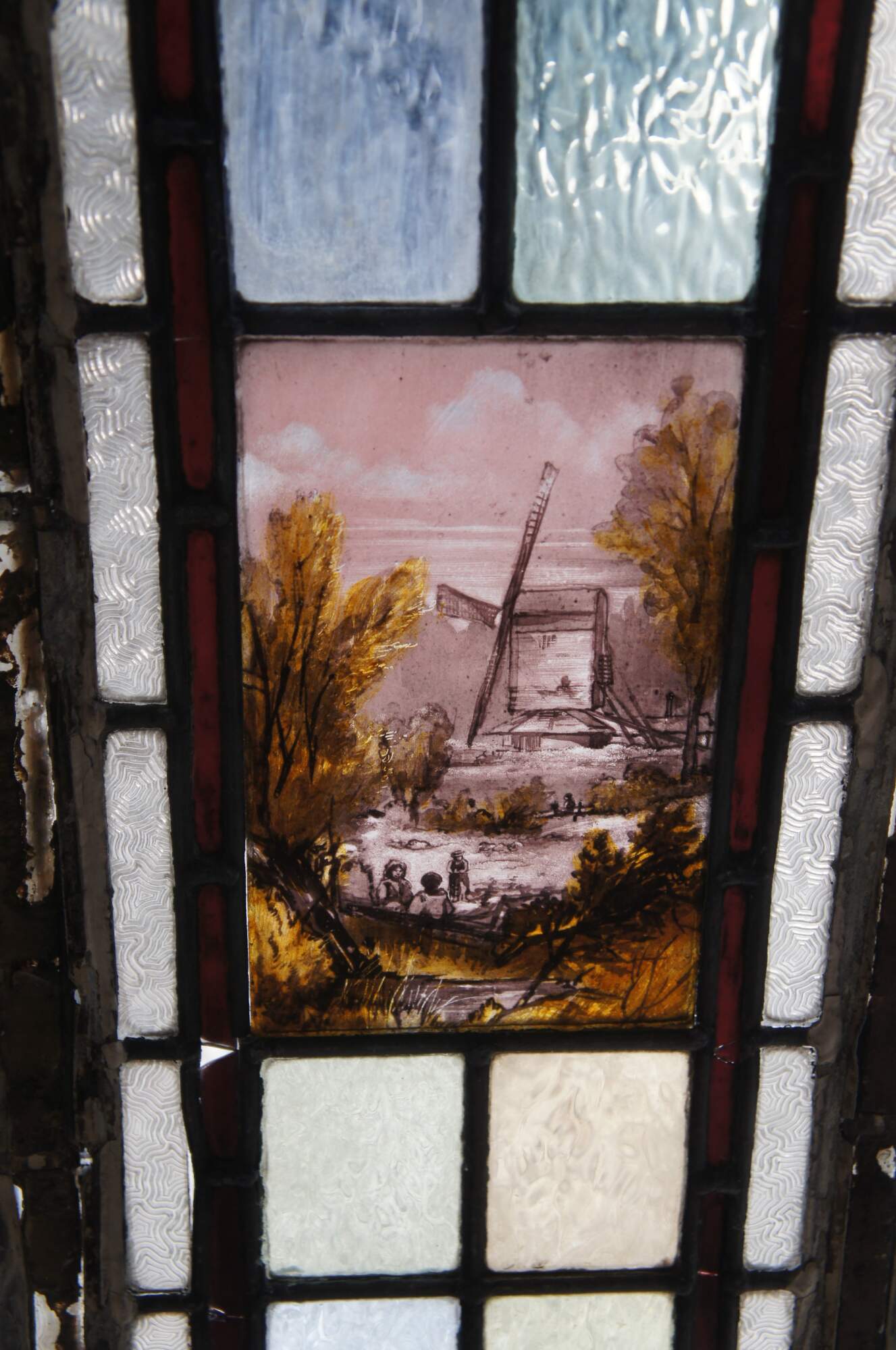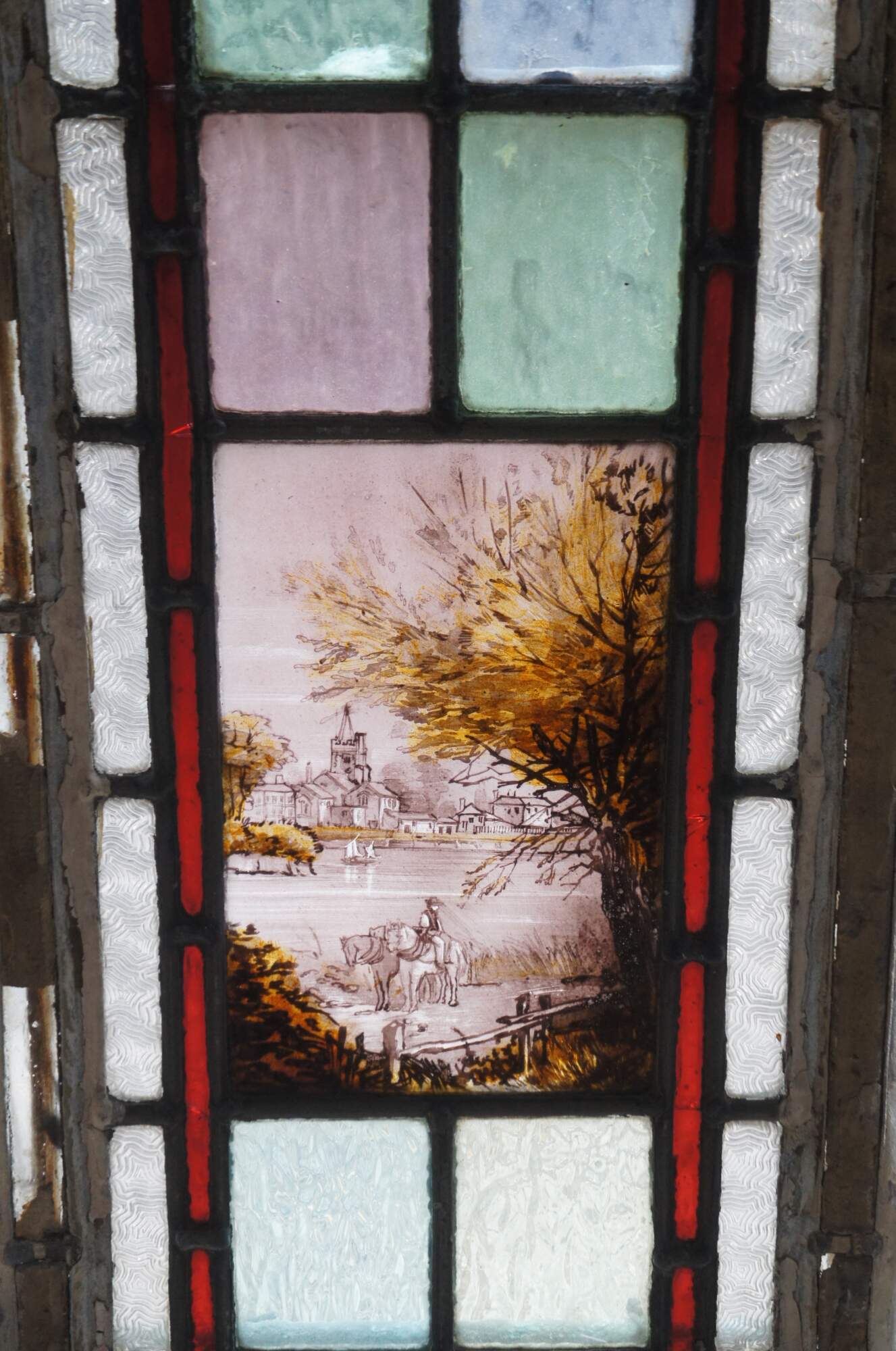 A charming set of four Early 1900s Edwardian reclaimed, leaded hand painted stained glass windows. Features a multicolored geometric glass pattern set around hand painted and fired scenes and floral detail. the two larger windows showcase landscape scenes. One has a windmill with figures and the other is a riverscape with horses across the water from a town and boat. The two skinnier windows have a diamond pattern center wit ha flattened four petal flower. A beautiful set for any space.