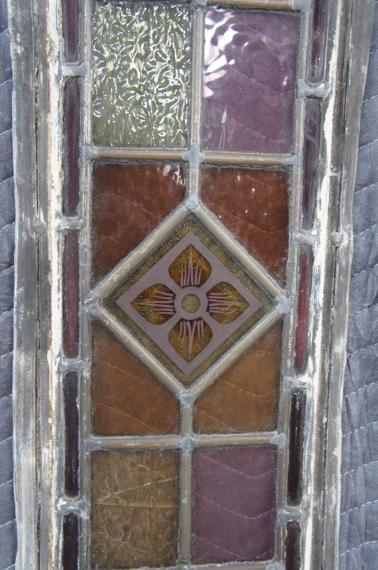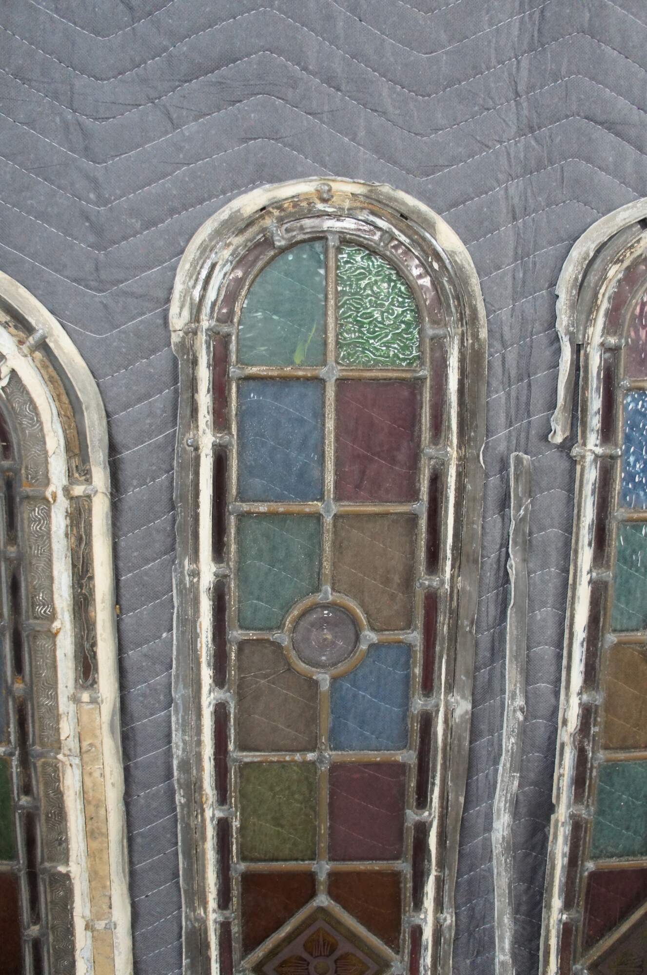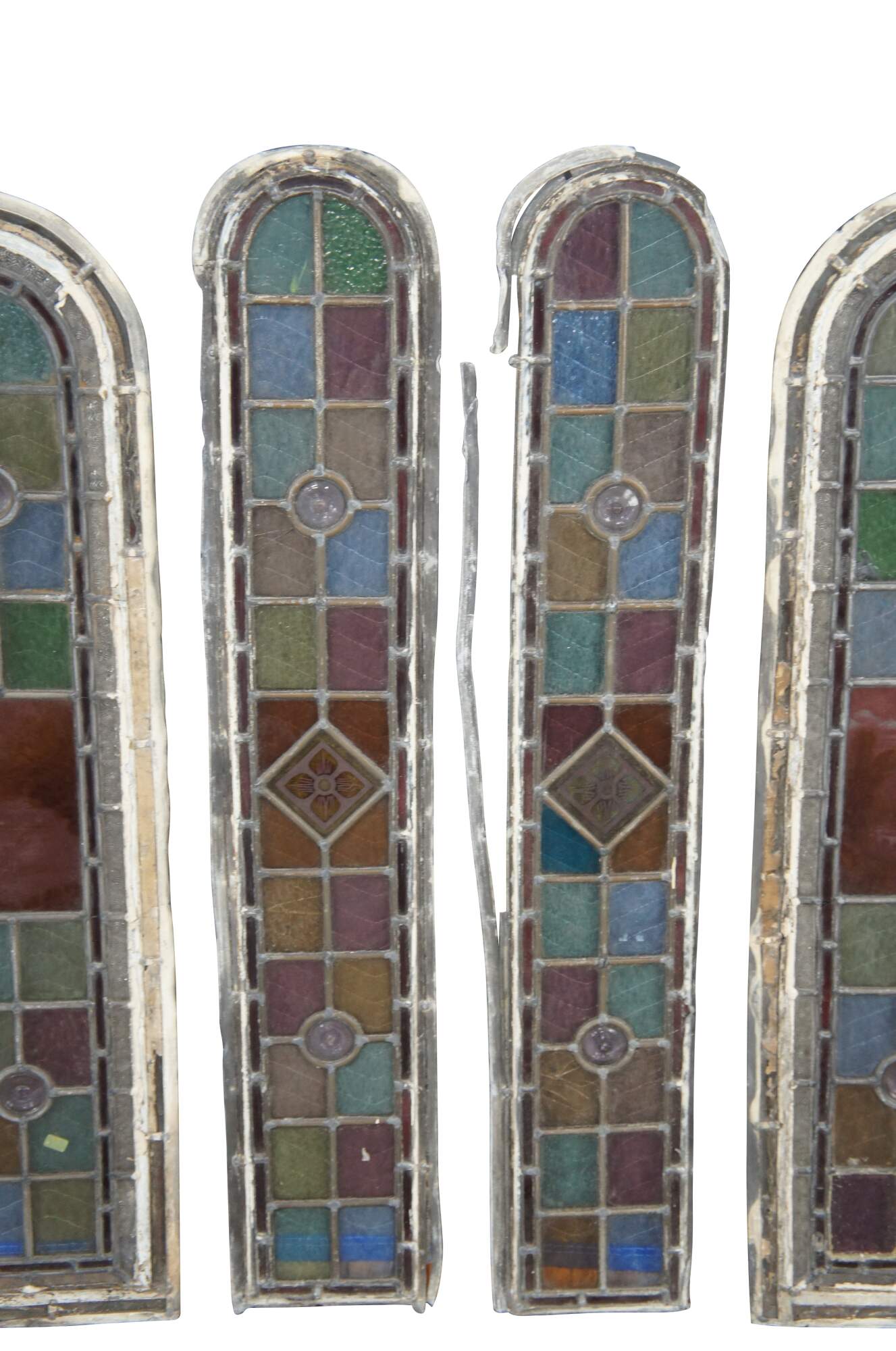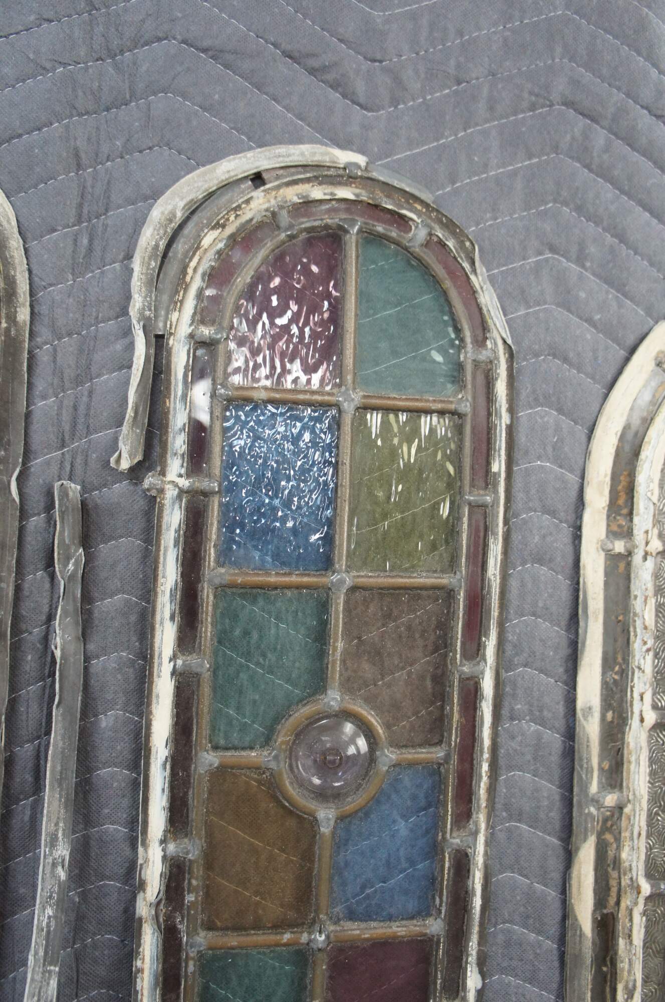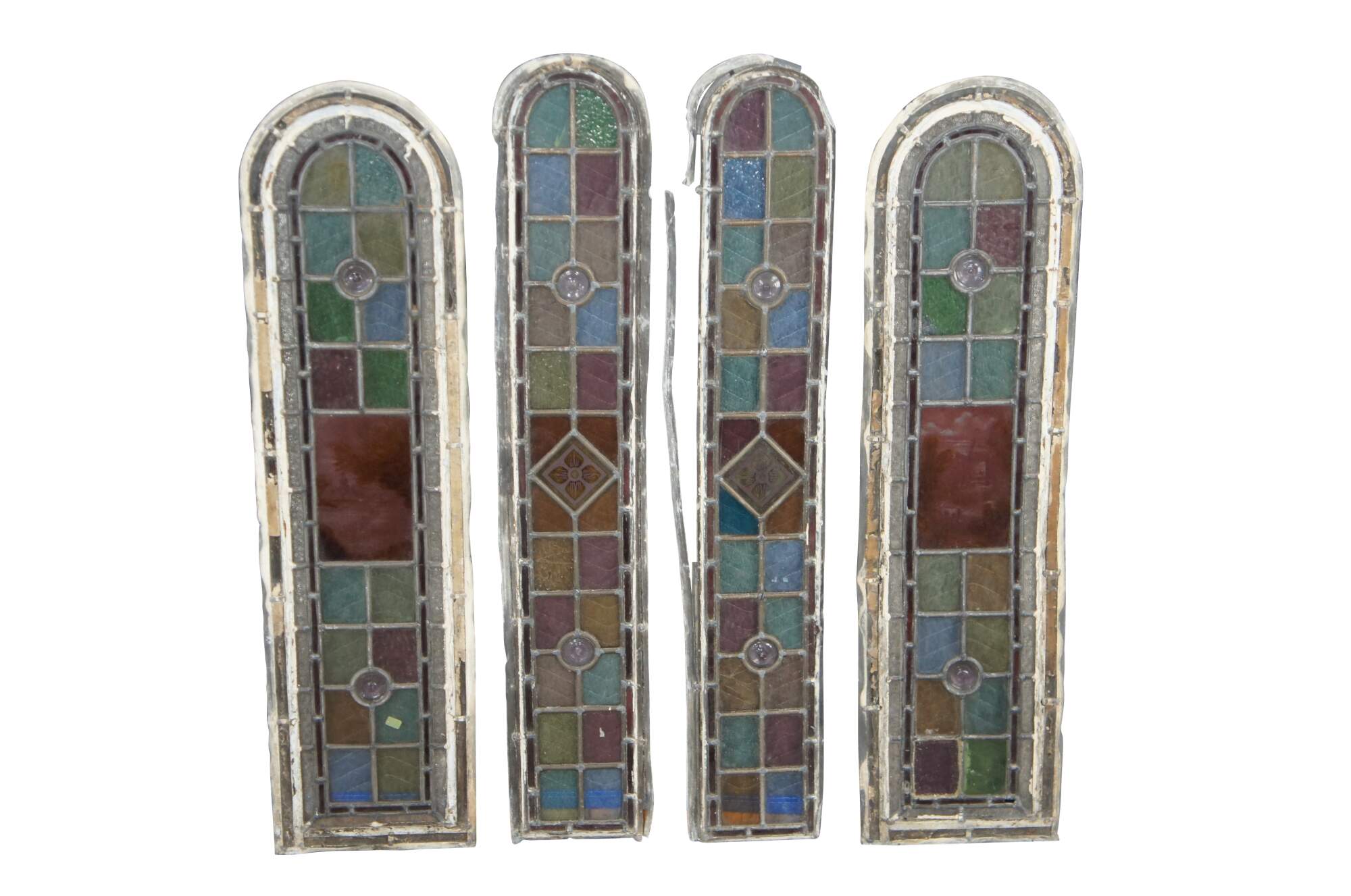 A charming set of four Early 1900s Edwardian reclaimed, leaded hand painted stained glass windows. Features a multicolored geometric glass pattern set around hand painted and fired scenes and floral detail. the two larger windows showcase landscape scenes. One has a windmill with figures and the other is a riverscape with horses across the water from a town and boat. The two skinnier windows have a diamond pattern center wit ha flattened four petal flower. A beautiful set for any space.