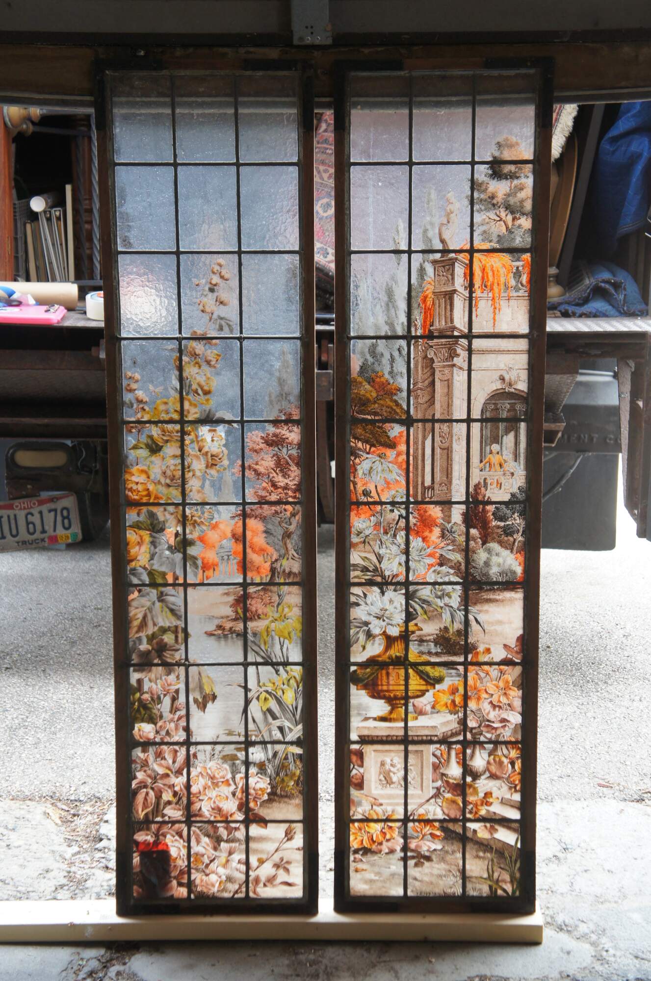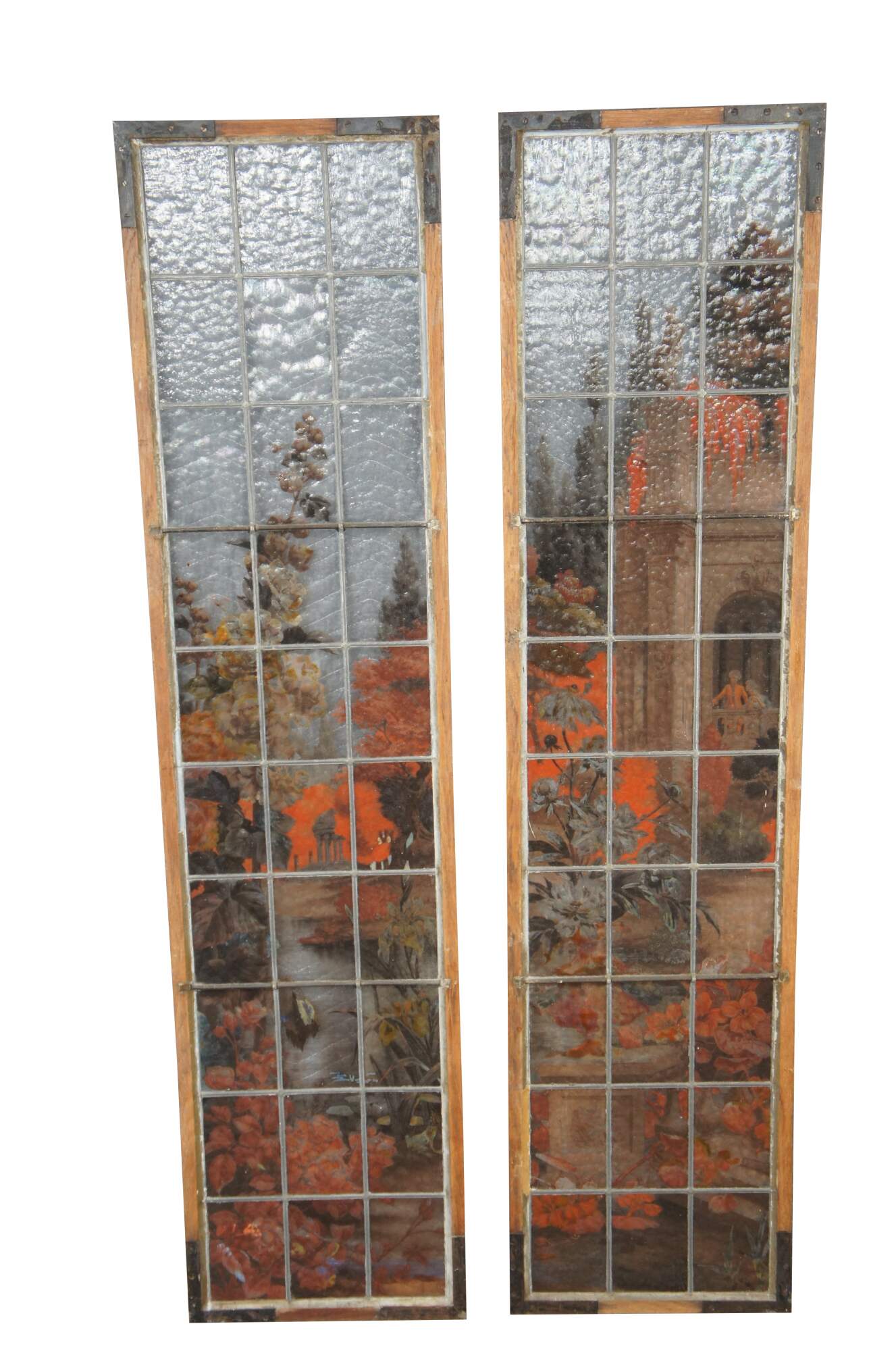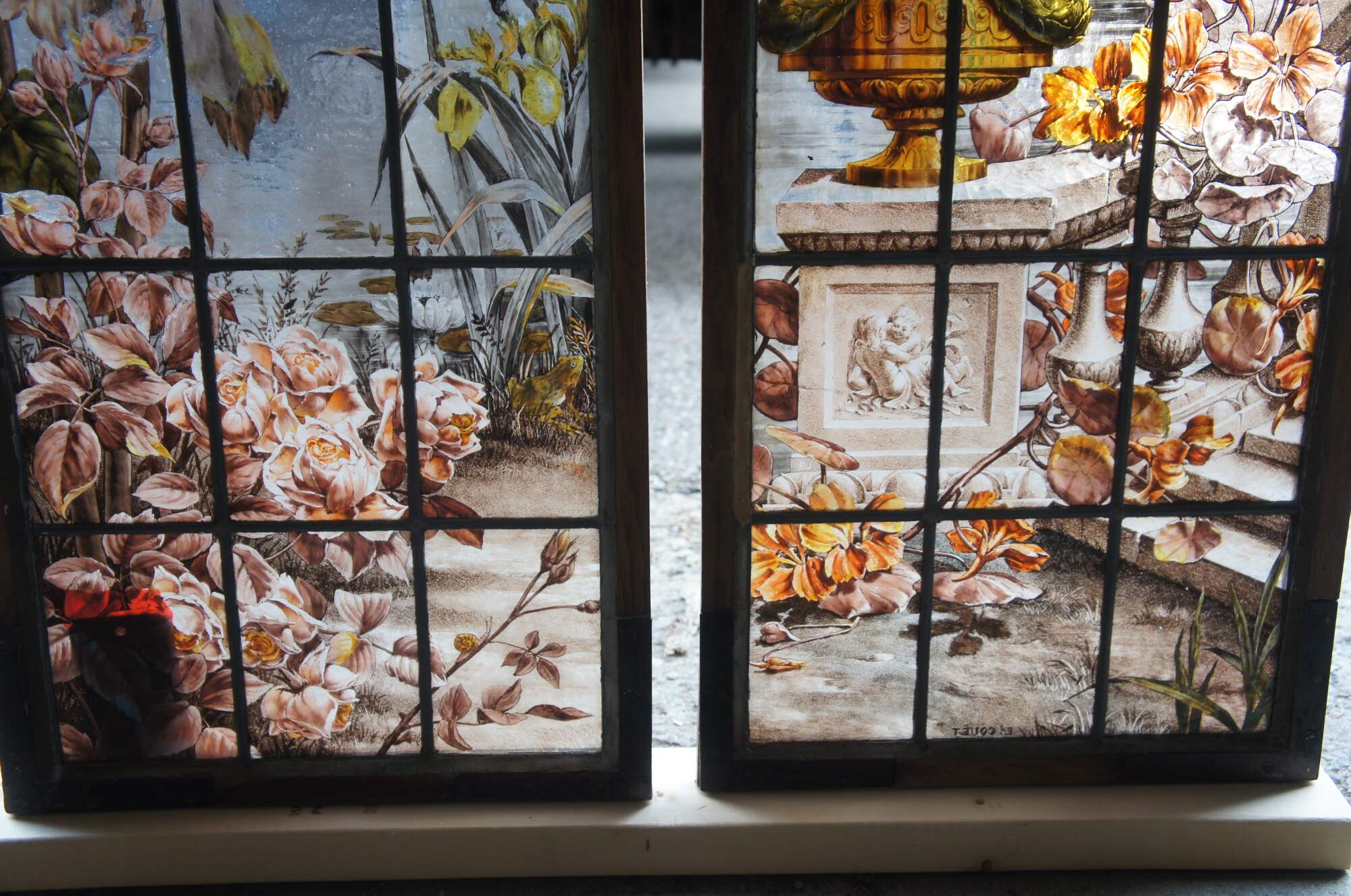 2 Vintage reclaimed French painted and fired leadedstained glass windows. Features a Neoclassical botanical garden scene with vinbrant flowers and architecture. Signed E Couet along lower side of one.