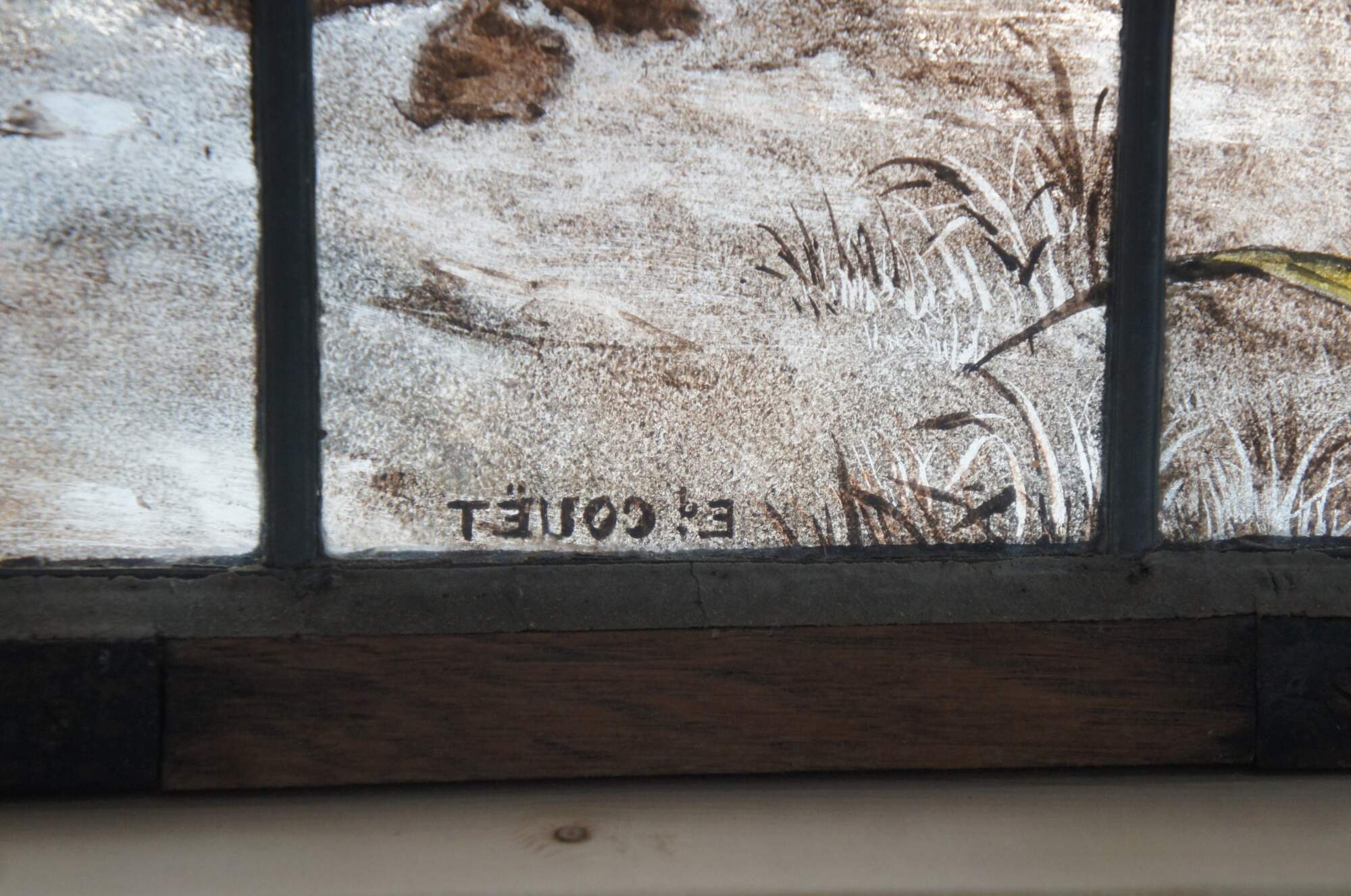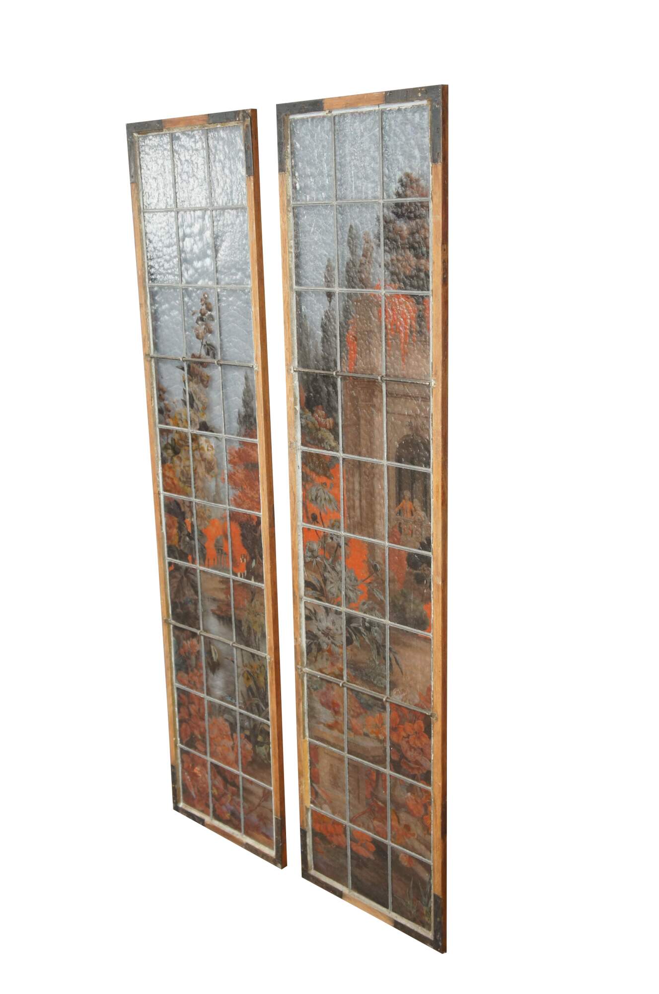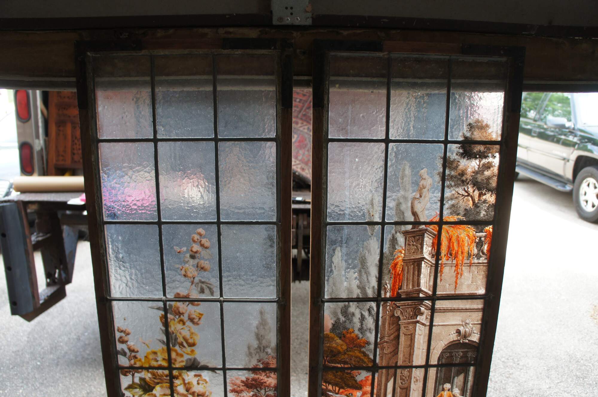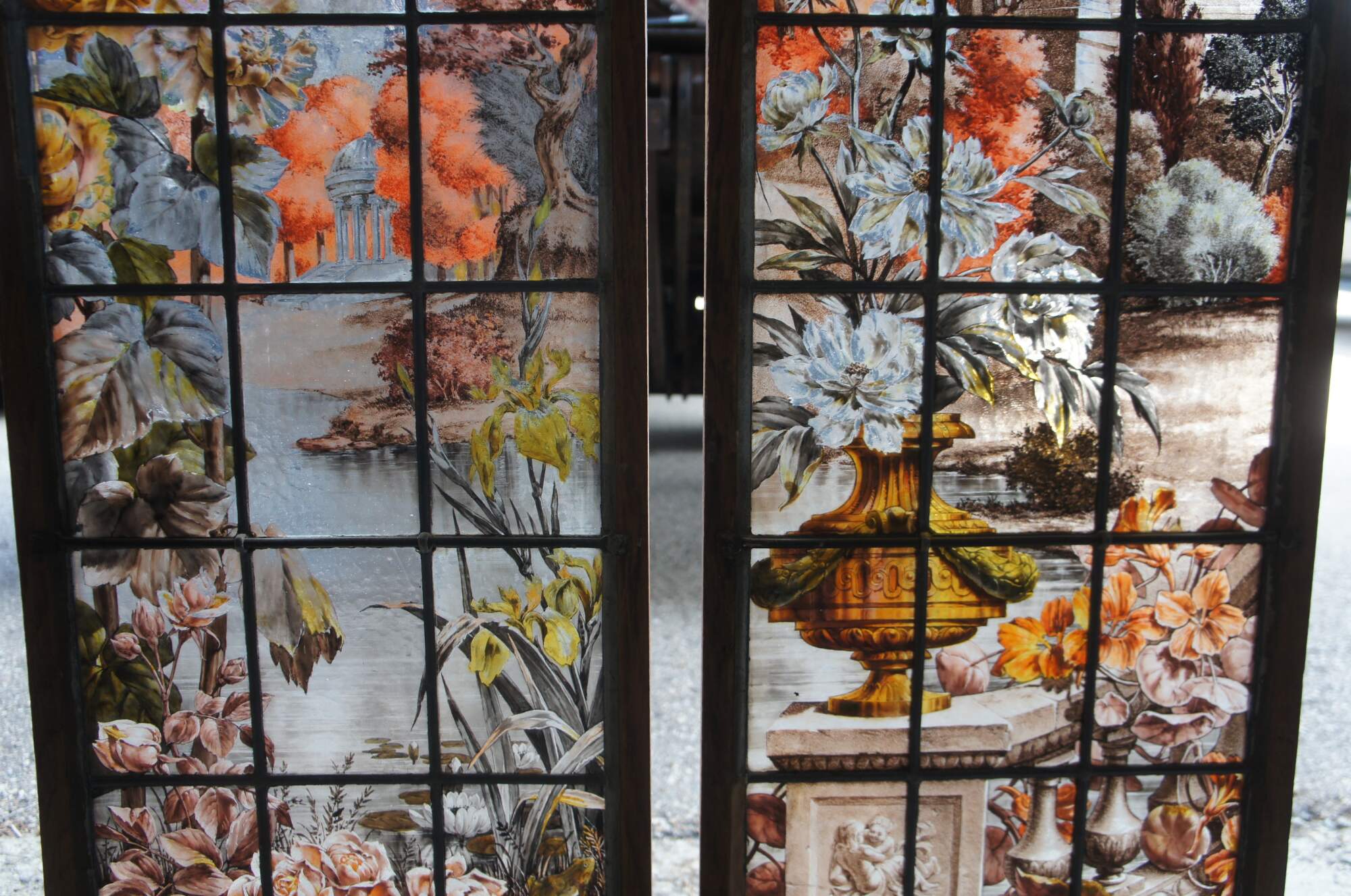 2 Vintage reclaimed French painted and fired leadedstained glass windows. Features a Neoclassical botanical garden scene with vinbrant flowers and architecture. Signed E Couet along lower side of one.