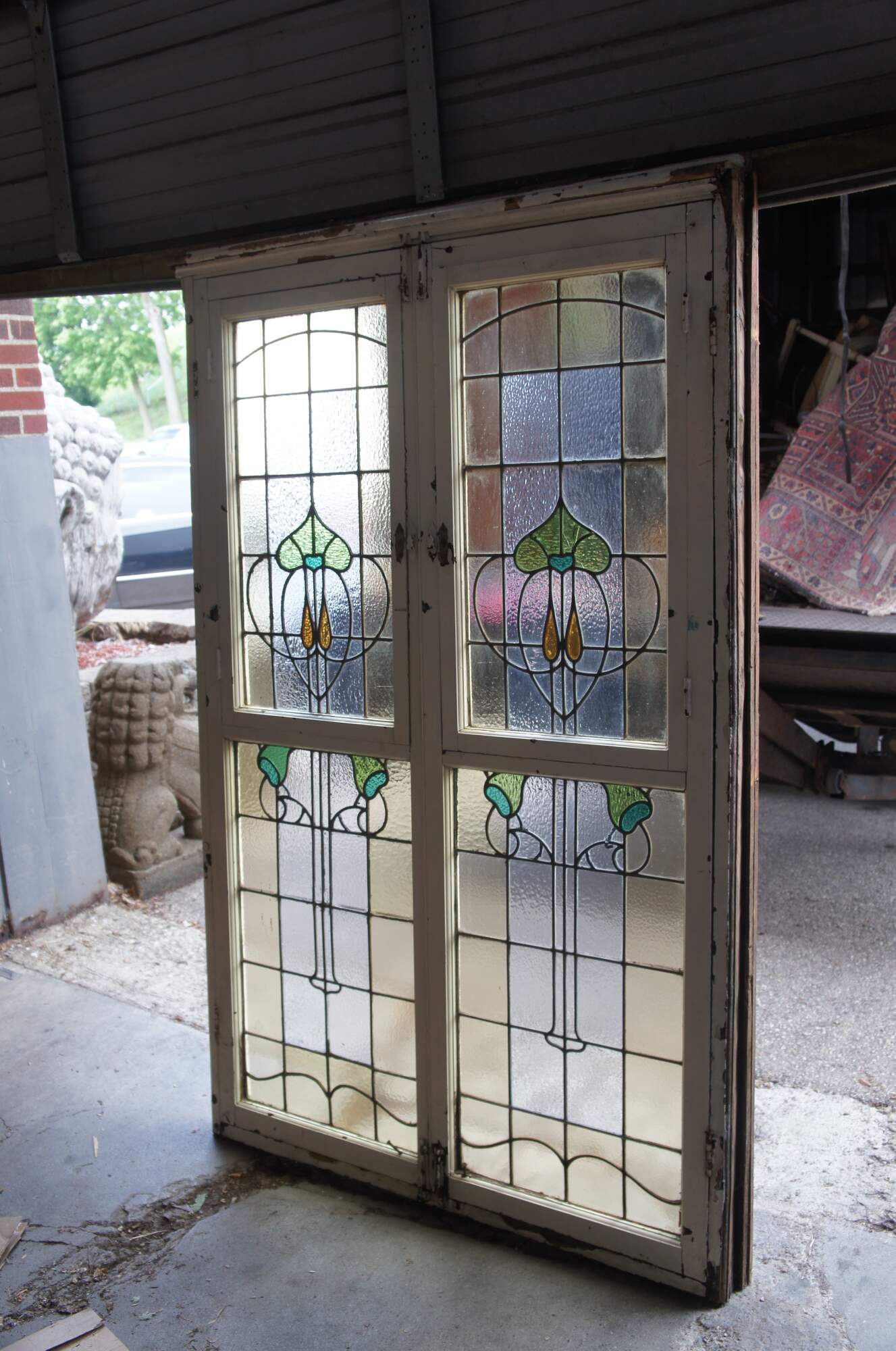 A rare and exceptional reclaimed large two part leaded stained glass French Door / Window. Features a large rectangular frame with two 2-part hinged doors with separte operating windows. Each window is designed with clear, pebbled and textured glass set around ornate floral designs showcasing colors of blue, green, and amber. The glass is set within large original salvaged wooden frames. Tthe perfect addition to any space.