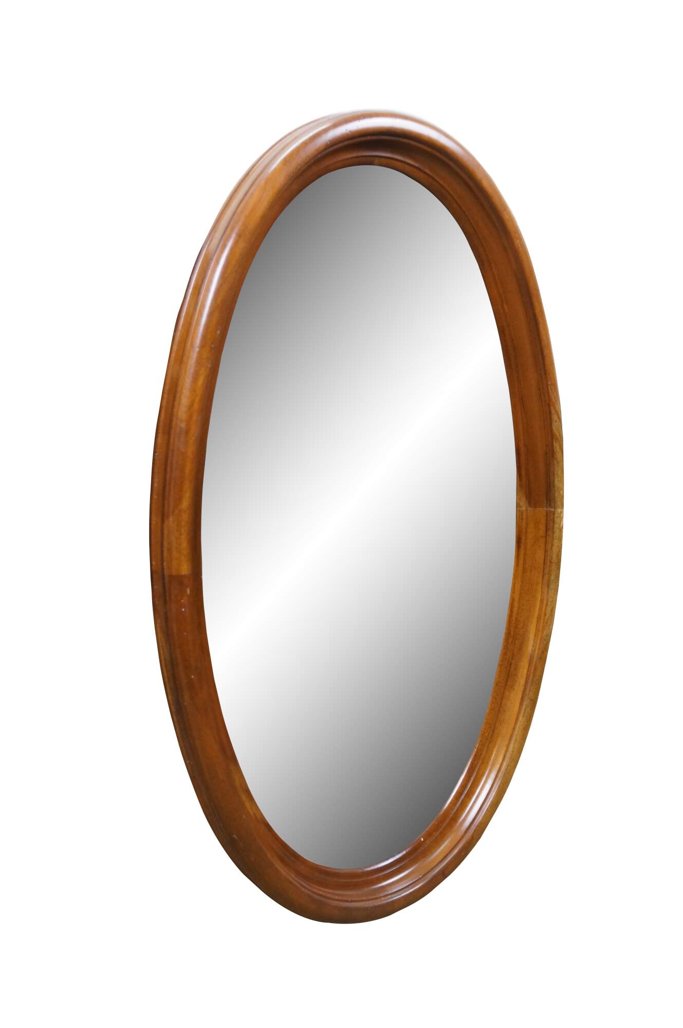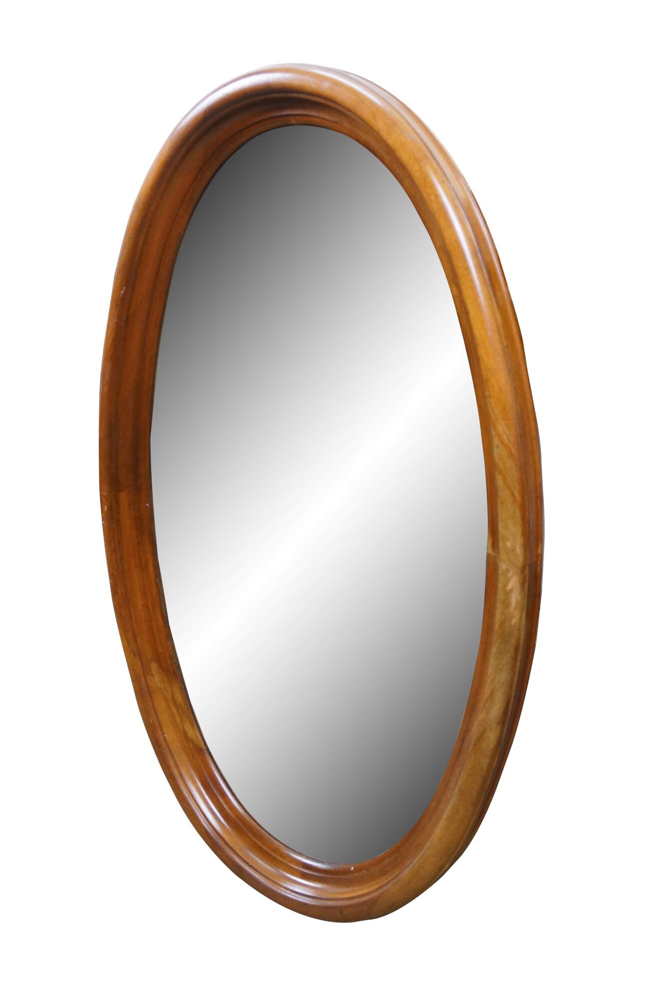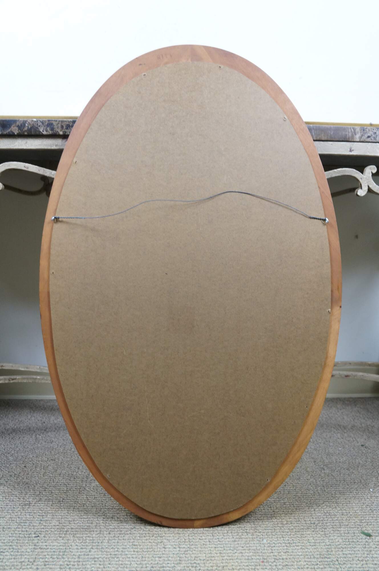 Long, oval, vintage wall mirror with beveled hardwood frame and beveled glass. Numbered 1118 on reverse.