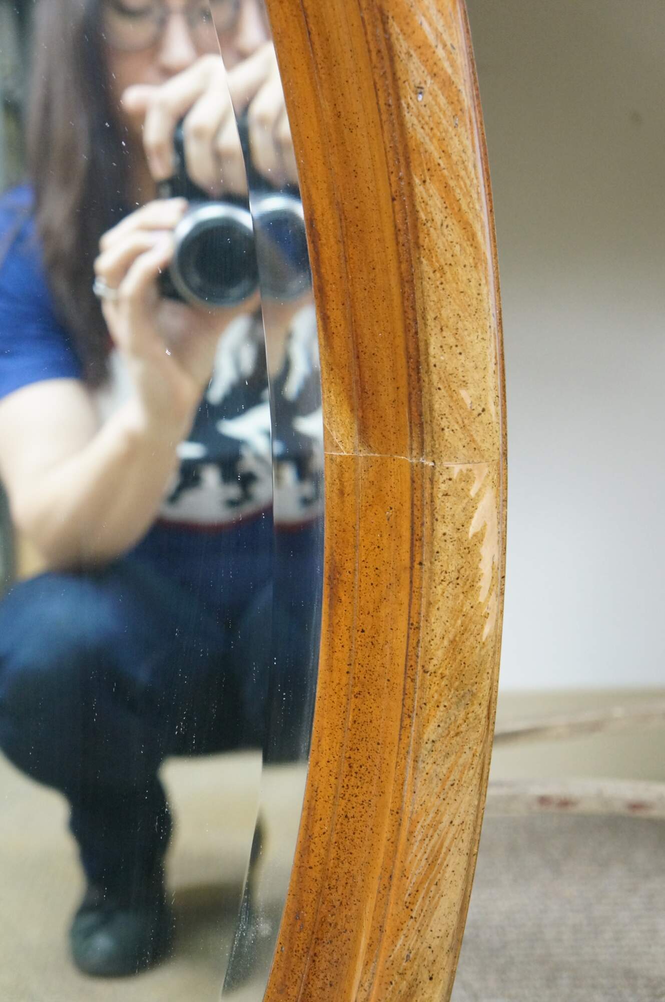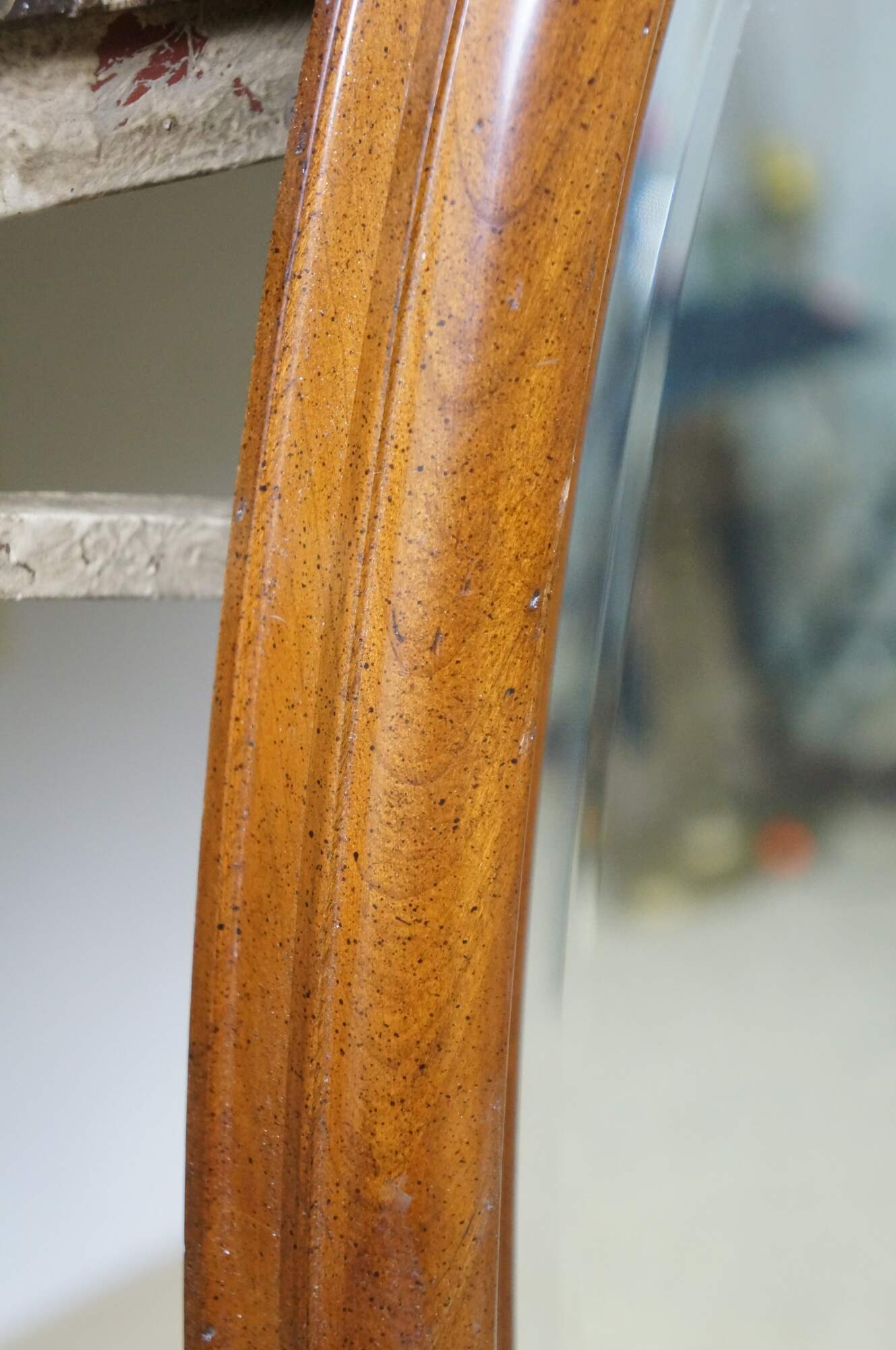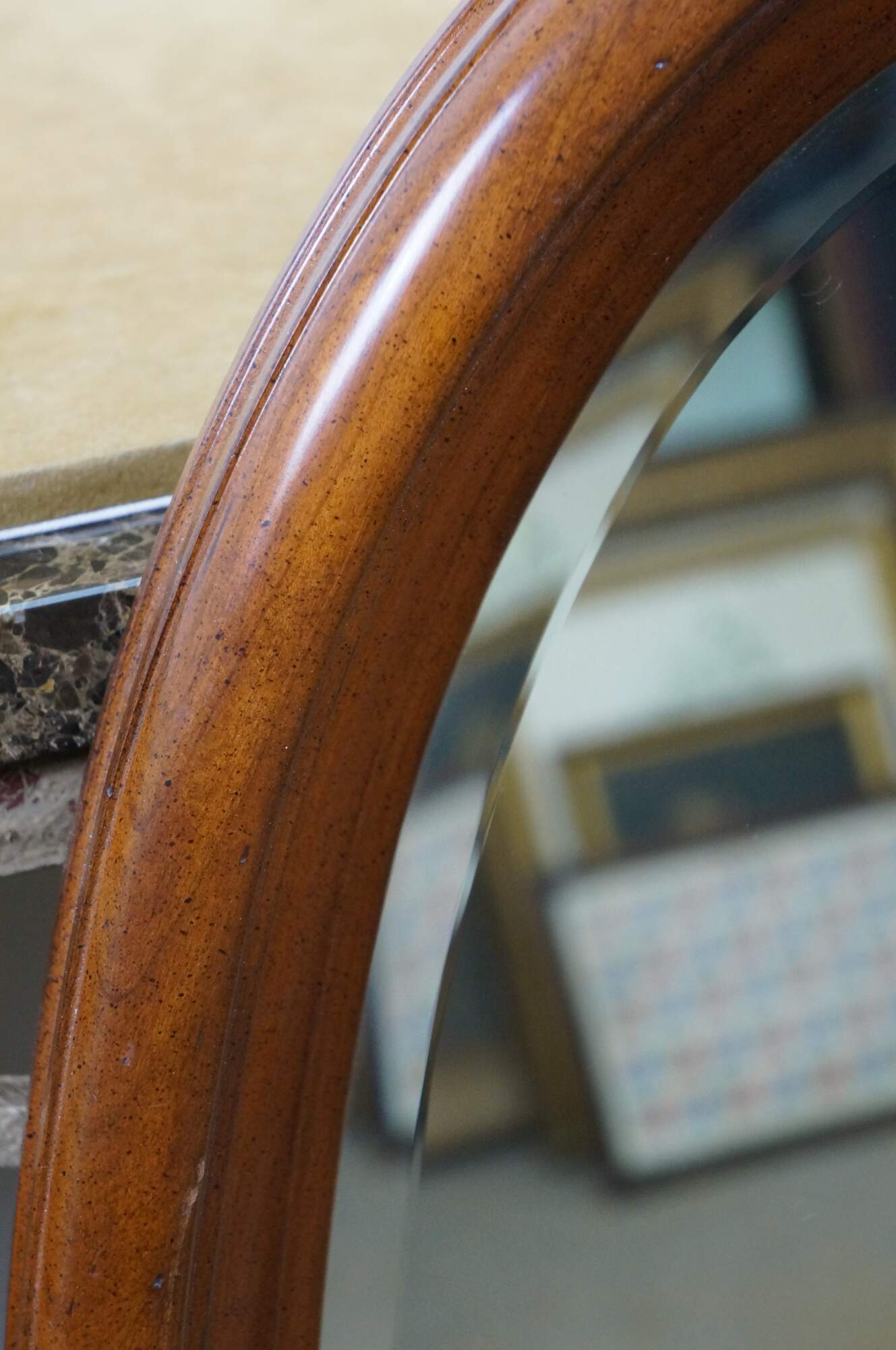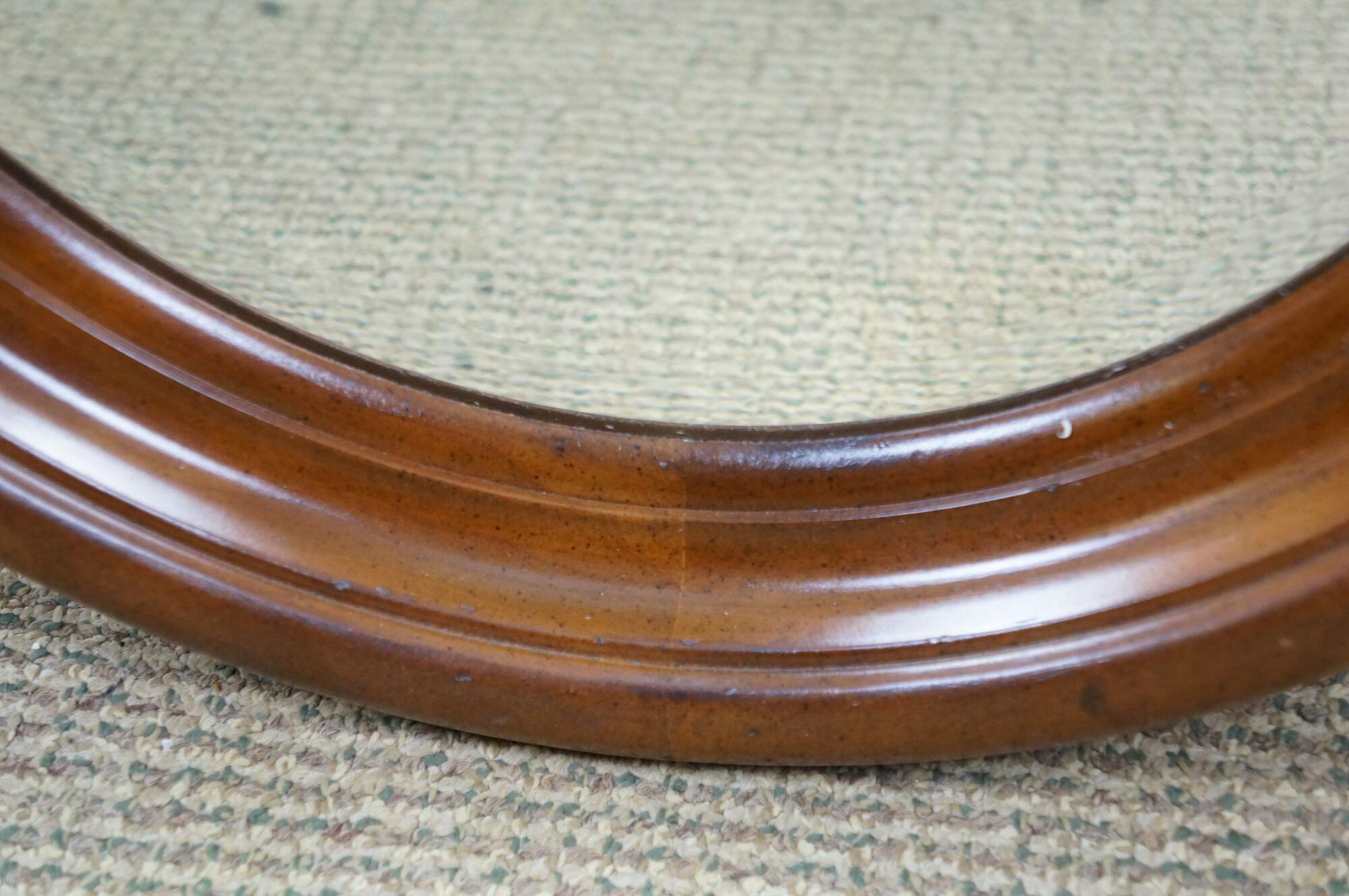 Long, oval, vintage wall mirror with beveled hardwood frame and beveled glass. Numbered 1118 on reverse.