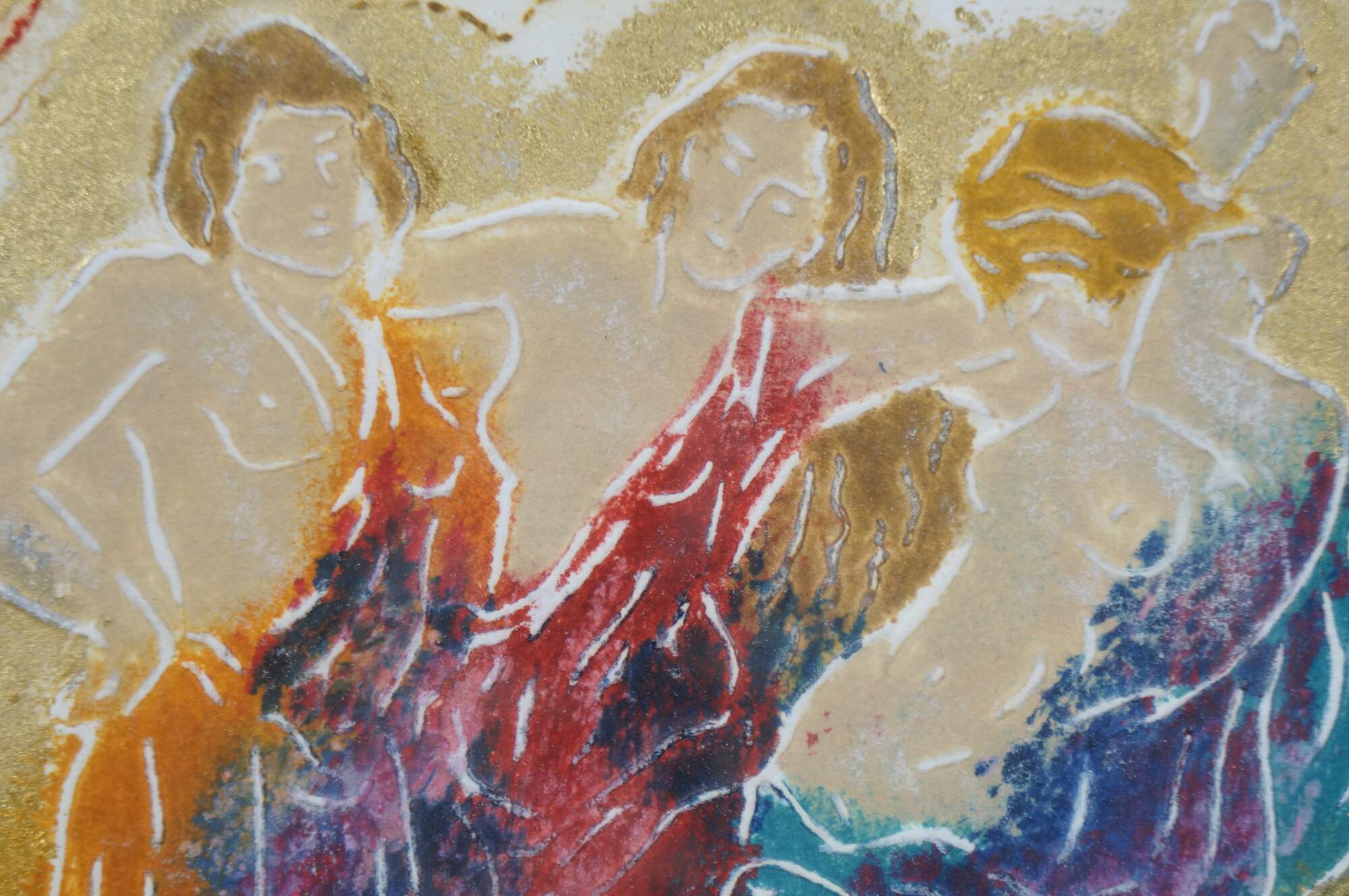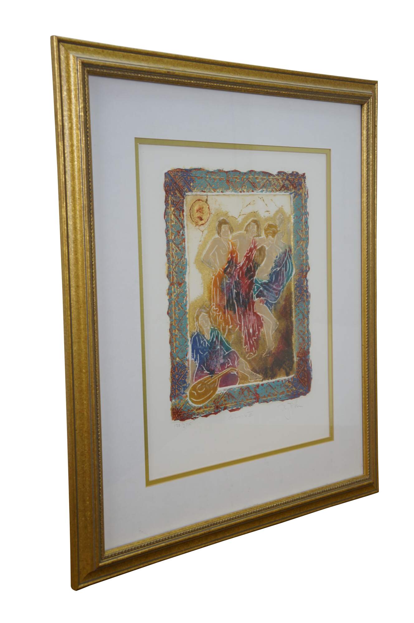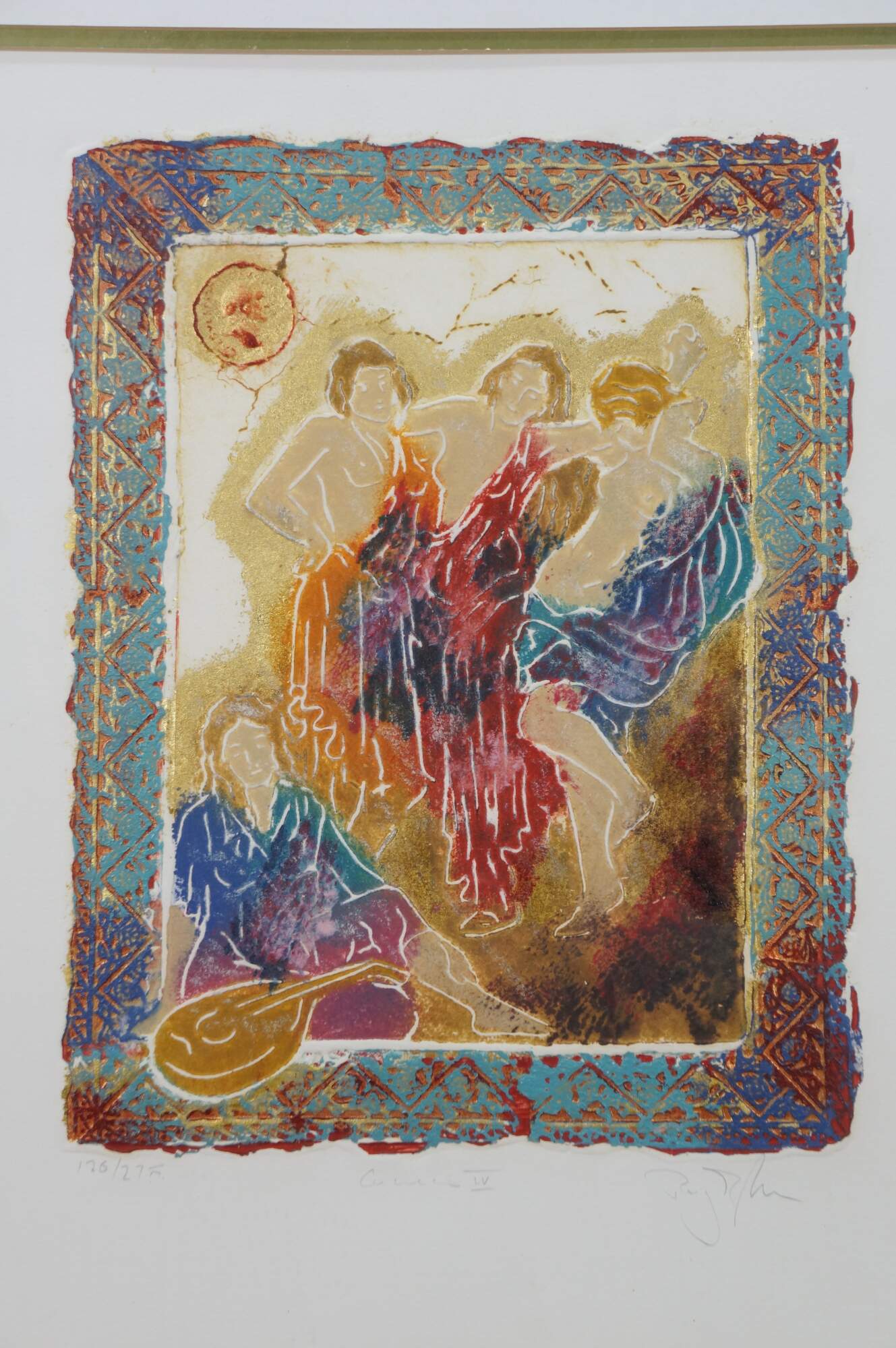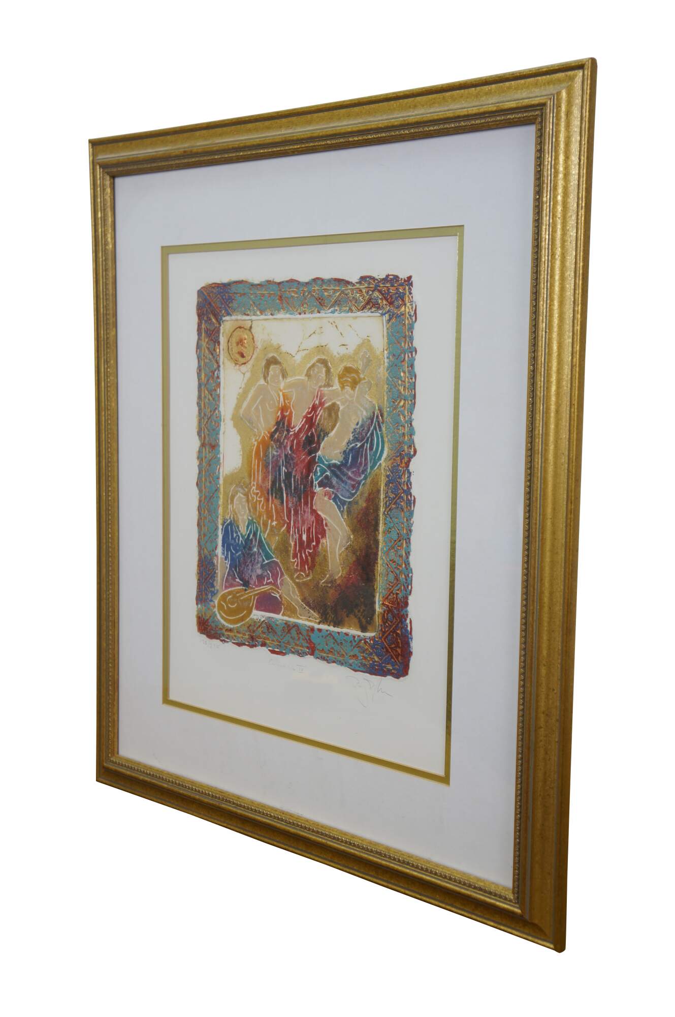 Limited edition carborundum etching titled "Graces IV" by Roy Tonkin. Brightly colored, textured scene showing a trio of three partially nude muses in togas, dancing to the sounds of a mandolin. Pencil signed, titled, and numbered 120/275, lower edge. Beveled gilt frame; white and gold layered mat.