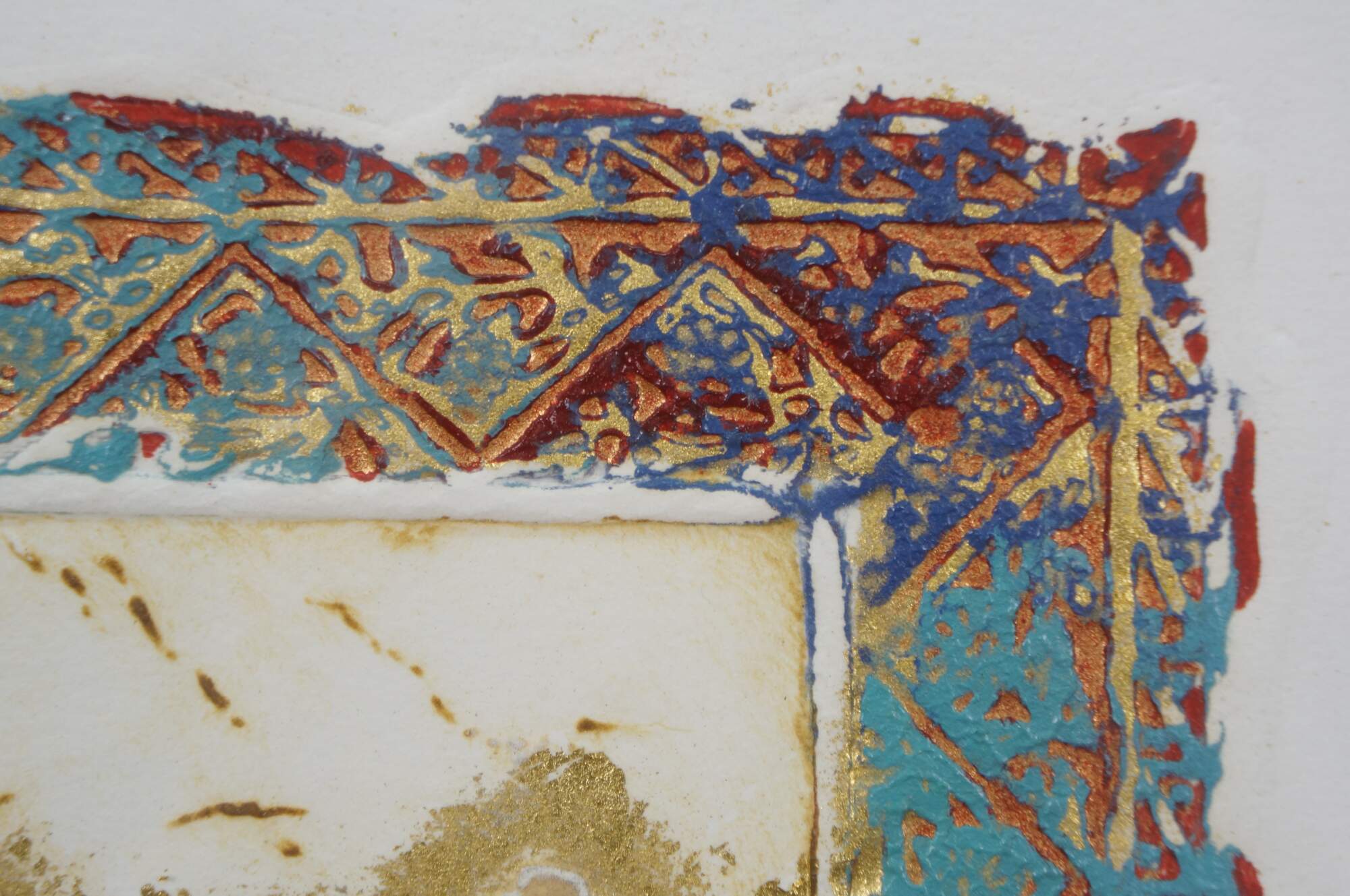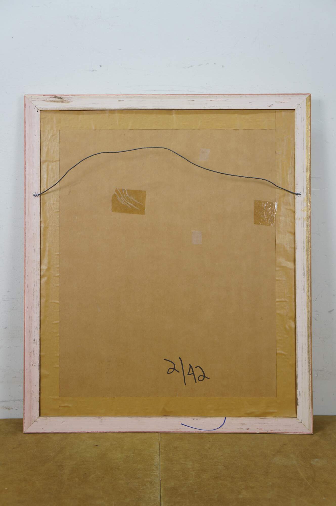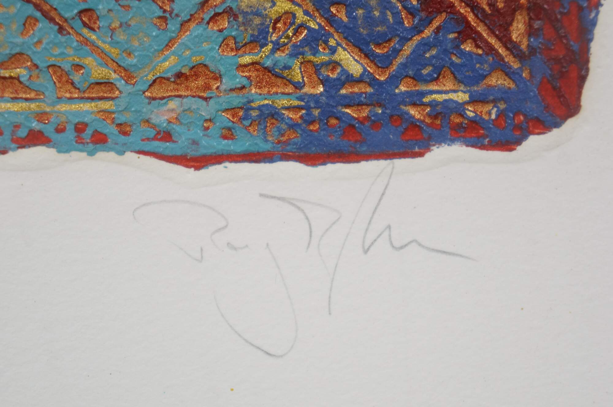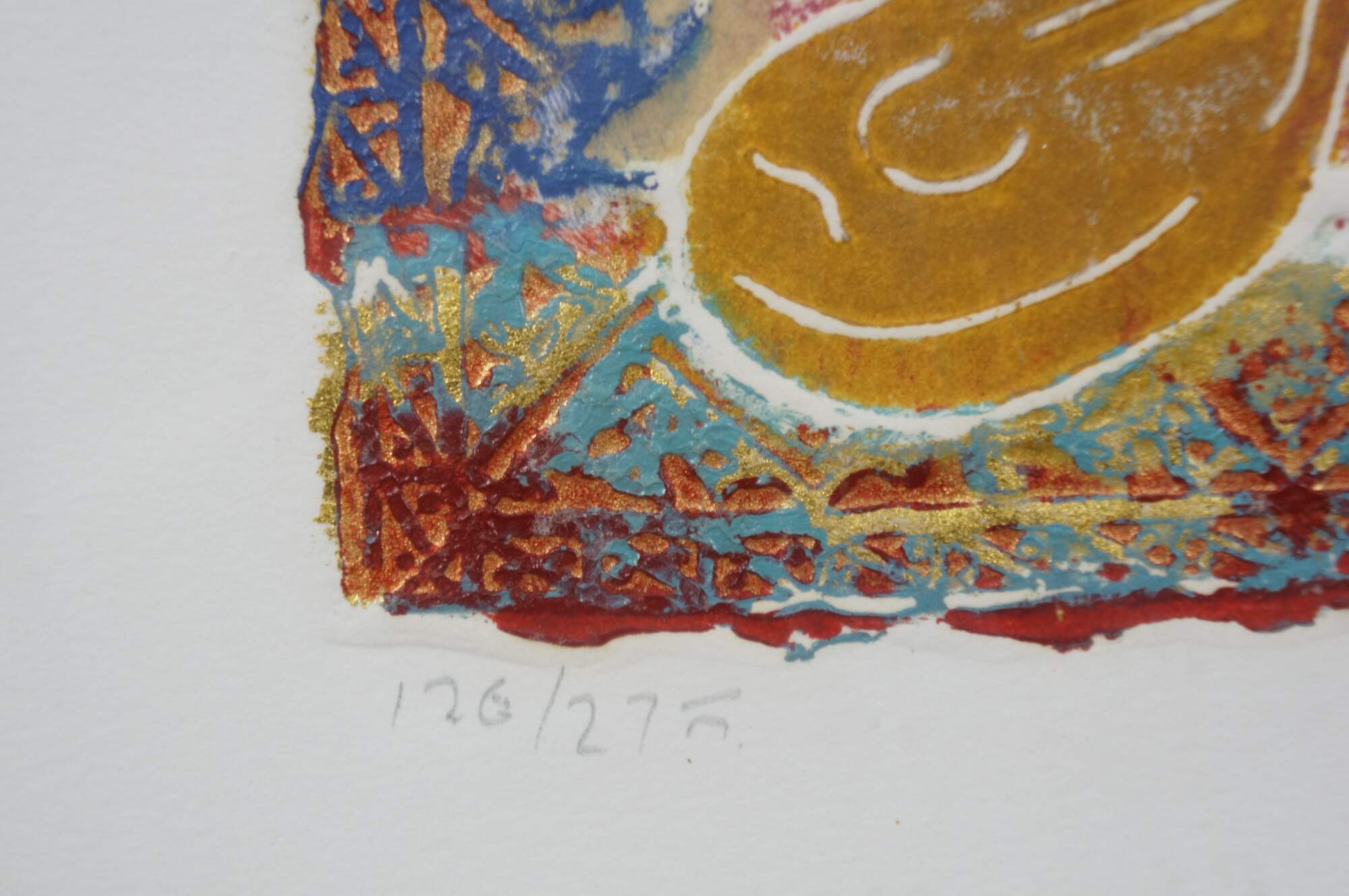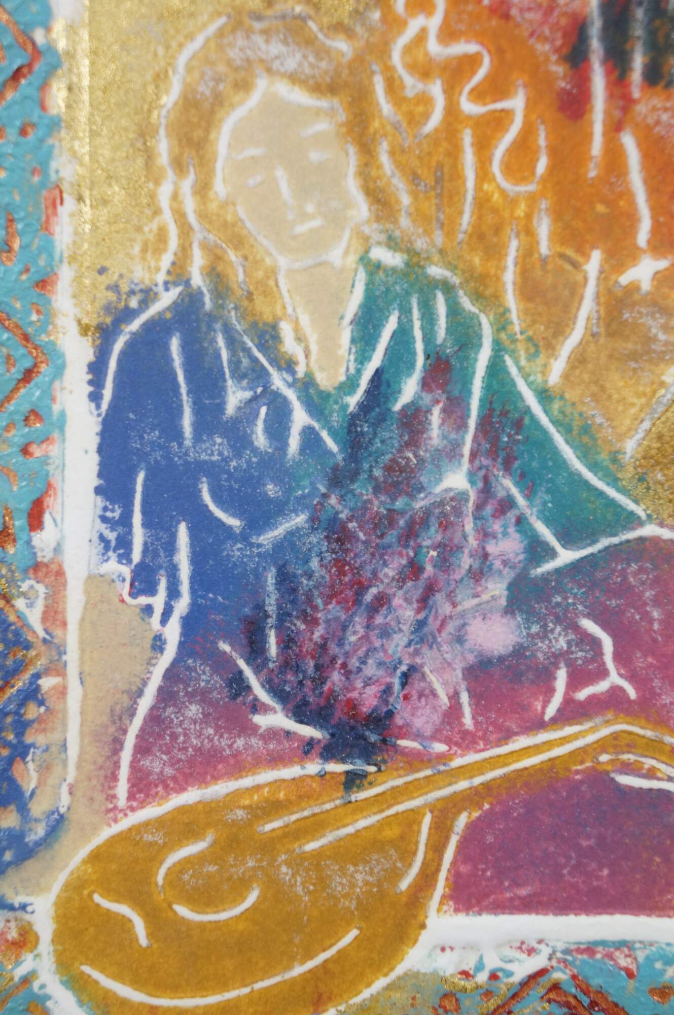 Limited edition carborundum etching titled "Graces IV" by Roy Tonkin. Brightly colored, textured scene showing a trio of three partially nude muses in togas, dancing to the sounds of a mandolin. Pencil signed, titled, and numbered 120/275, lower edge. Beveled gilt frame; white and gold layered mat.