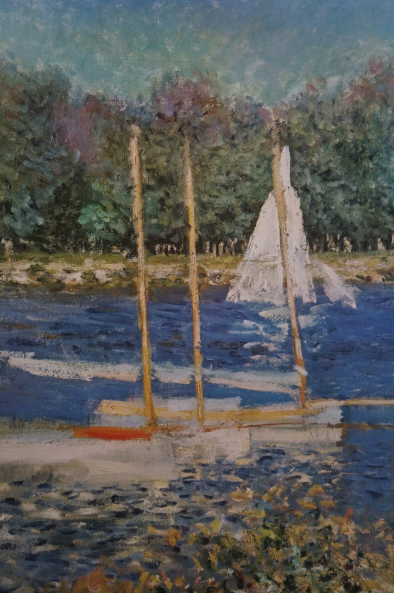 Mid century, circa 1962 lithograph print of Claude Monet's "The Seine at Argenteuil," originally painted circa 1874. A picturesque impressionist view of sailboats on water and a the treelined shore. Signed in plate, lower left. Gold metal frame; blue and beige layered mat.