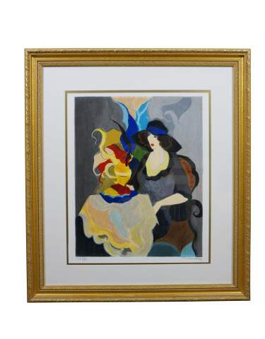 Itzchak Tarkay serigraph print titled "Quiet Moments #1." An elegantly dressed woman in gray and a large hat, seated at a full cafe table. Pencil signed and numbered EA (Épreuve d'Artiste - artists proof) 29/75. Itzchak Tarkay (1935-2012) was an Israeli artist known for his post-impressionist work. Beveled giltwood frame with foliate details; white and brown layered mat.