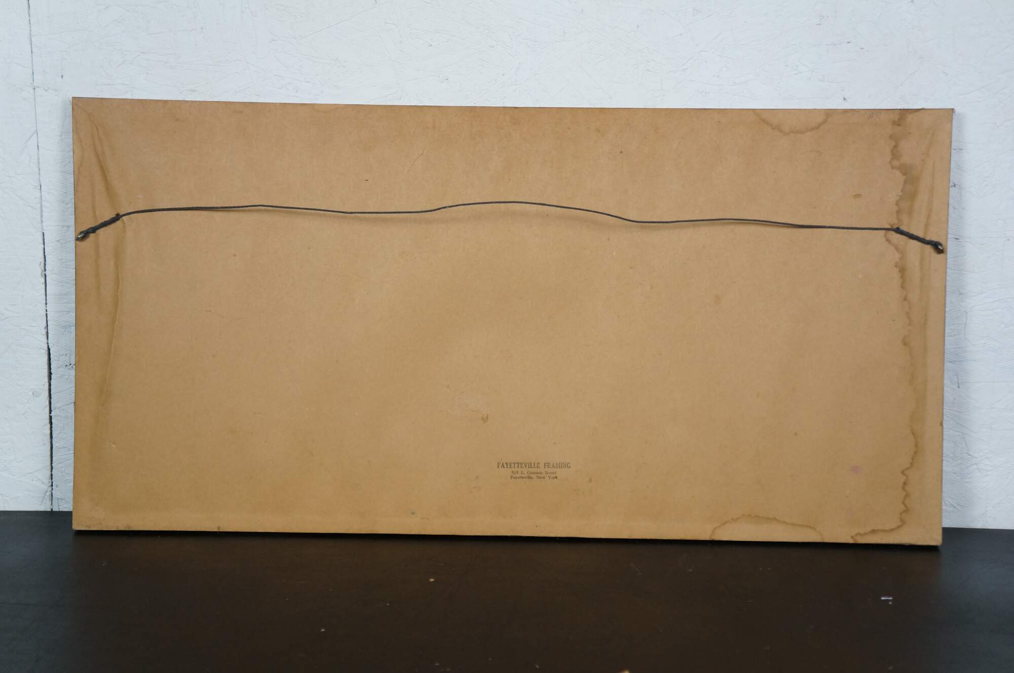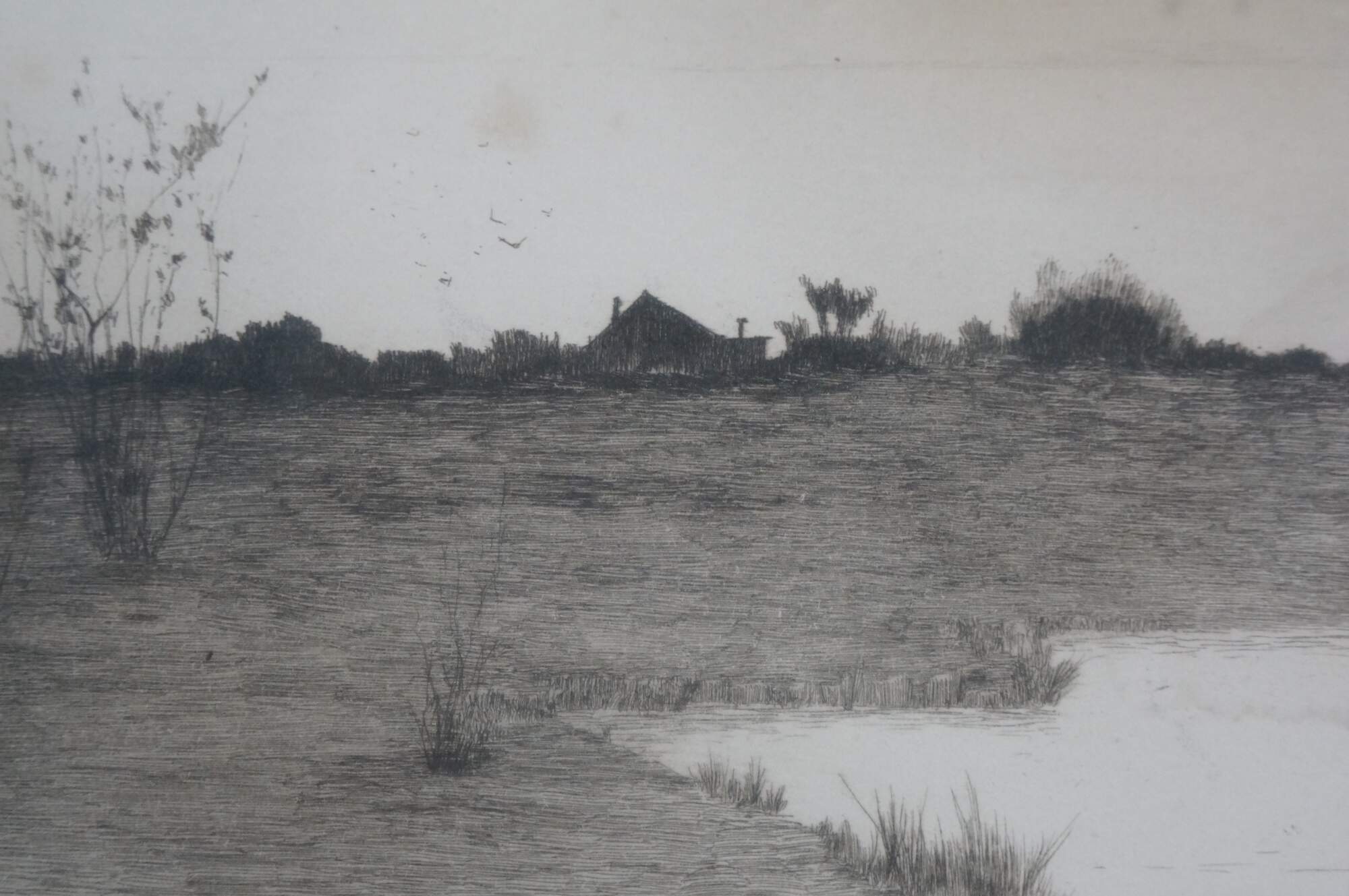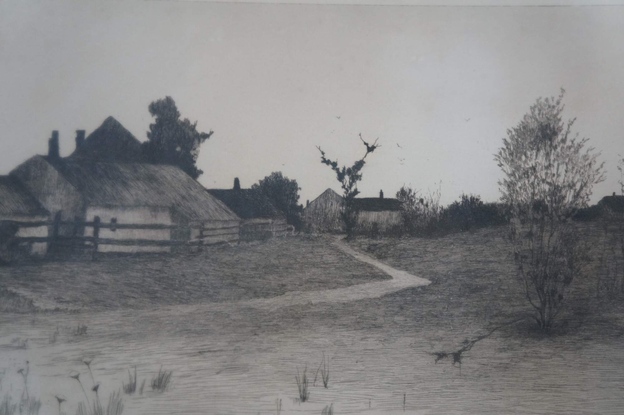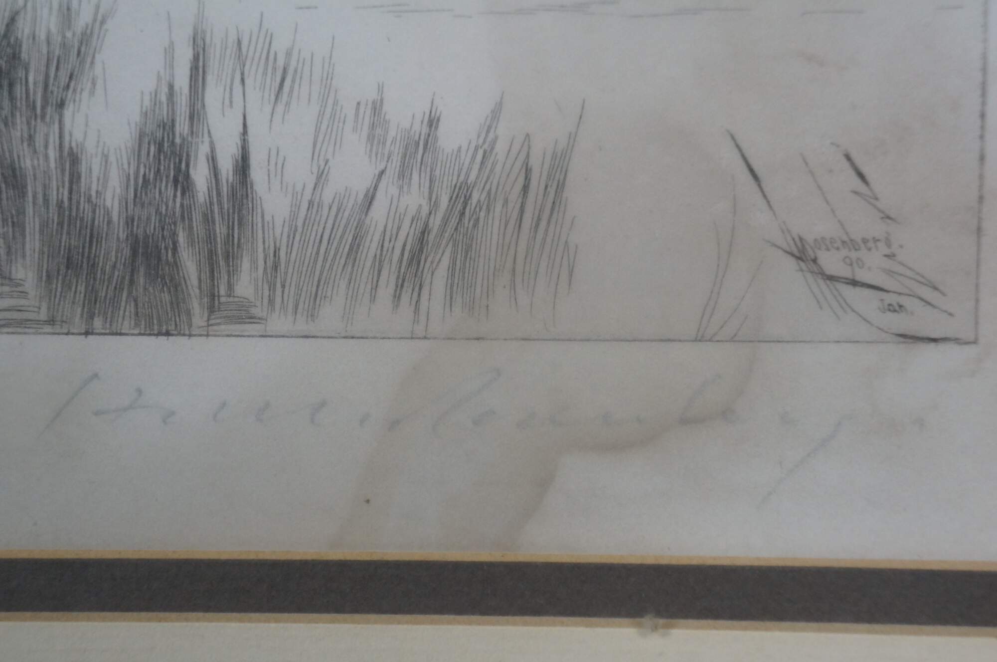 Antique circa 1890 black and white etching by Henry M. Rosenberg, showing panoramic country landscape with cottages and a pond - likely the Old Cottage at Margaretville. Signed in plate H.M. Rosenberg 90 Jan. Pencil signed below right corner. Remarke of a woman in Victorian dress along lower edge. Grooved / beveled wood frame; white and brown layered mat.
