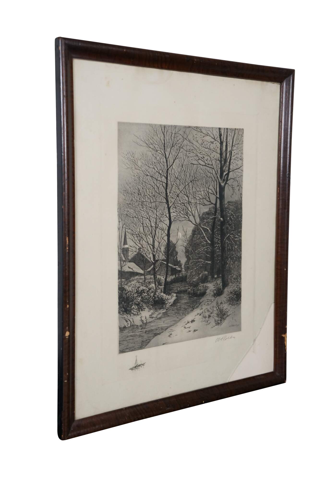 Late 19th century black and white landscape engraving showing a pair of figures taking a moonlit stroll along a river, a village visible through the snowy winter trees. Signed in plate D. (or A.) Schweitzer, lower right. Pencil signed W. Rolls lower right edge. Remarke of a branch of a Christmas tree with a star, lower left. Beveled wood frame; no mat.