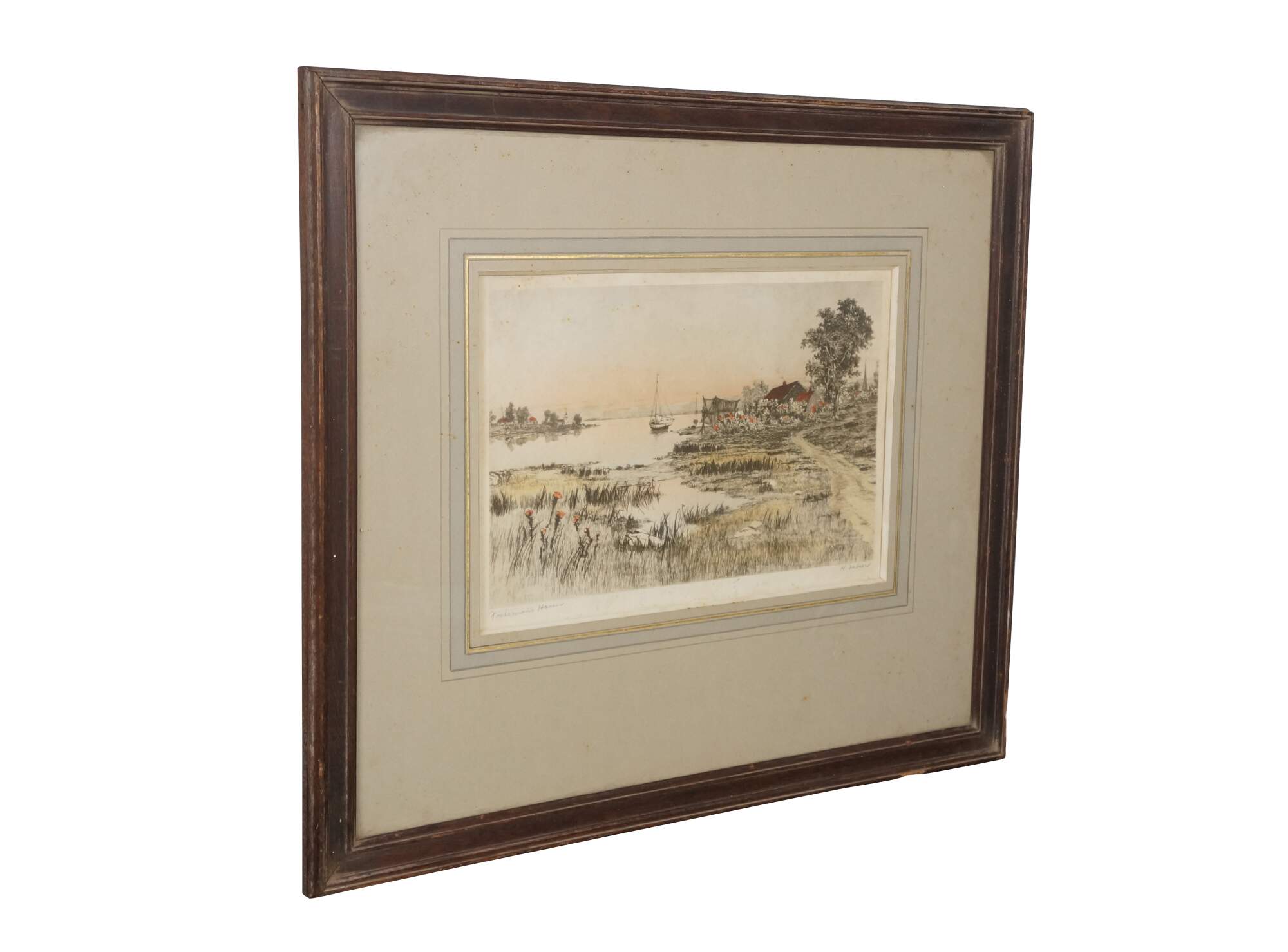 Antique hand tinted etching showing a country landscape with a red roofed cottage and a boat on water. Pencil titled "Fisherman's Haven, lower left. Pencil signed H. Falser lower right. Beveled wood frame; gray may with gold detail.