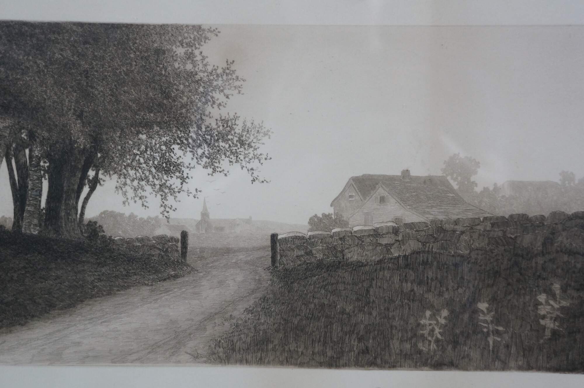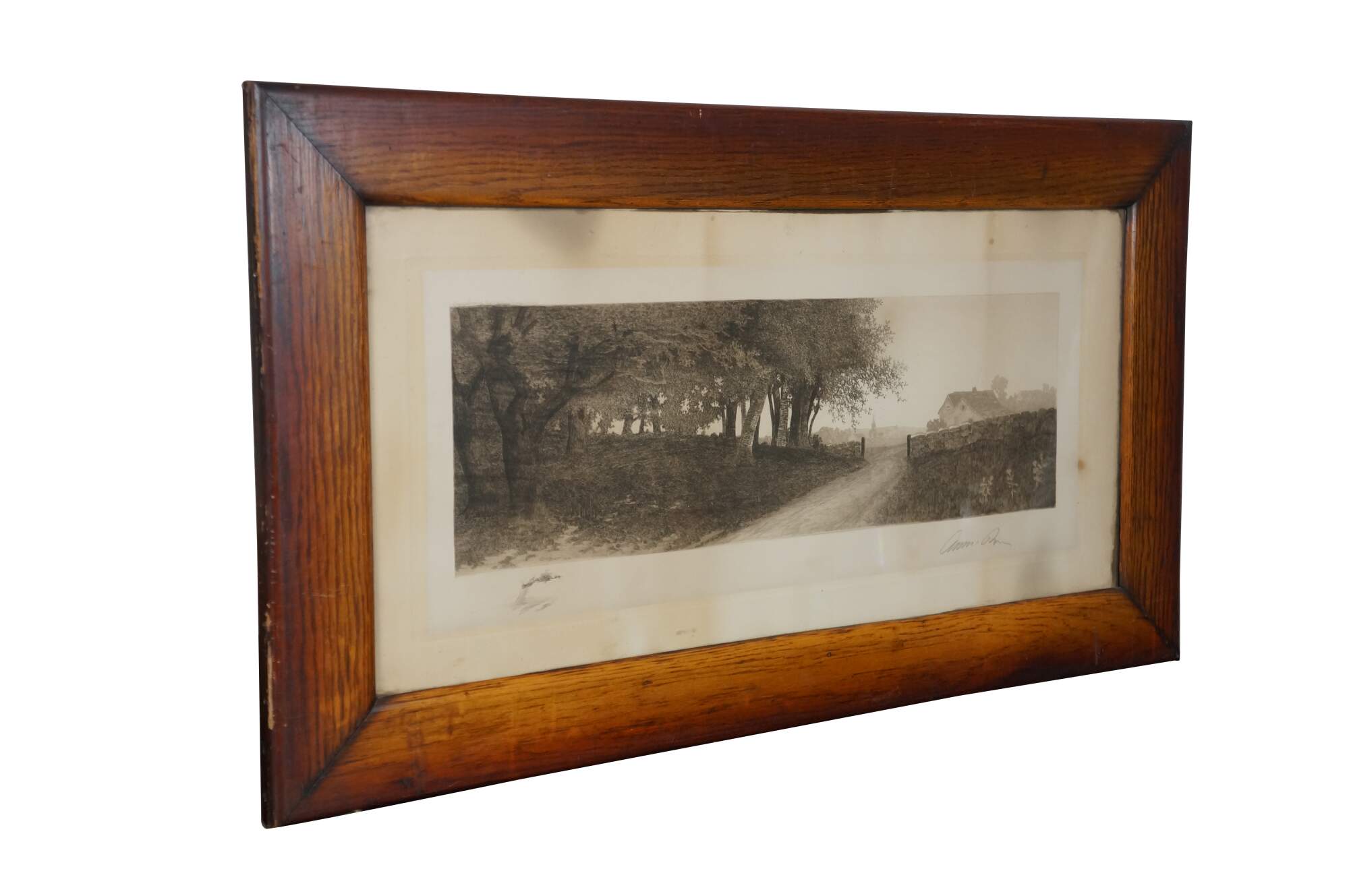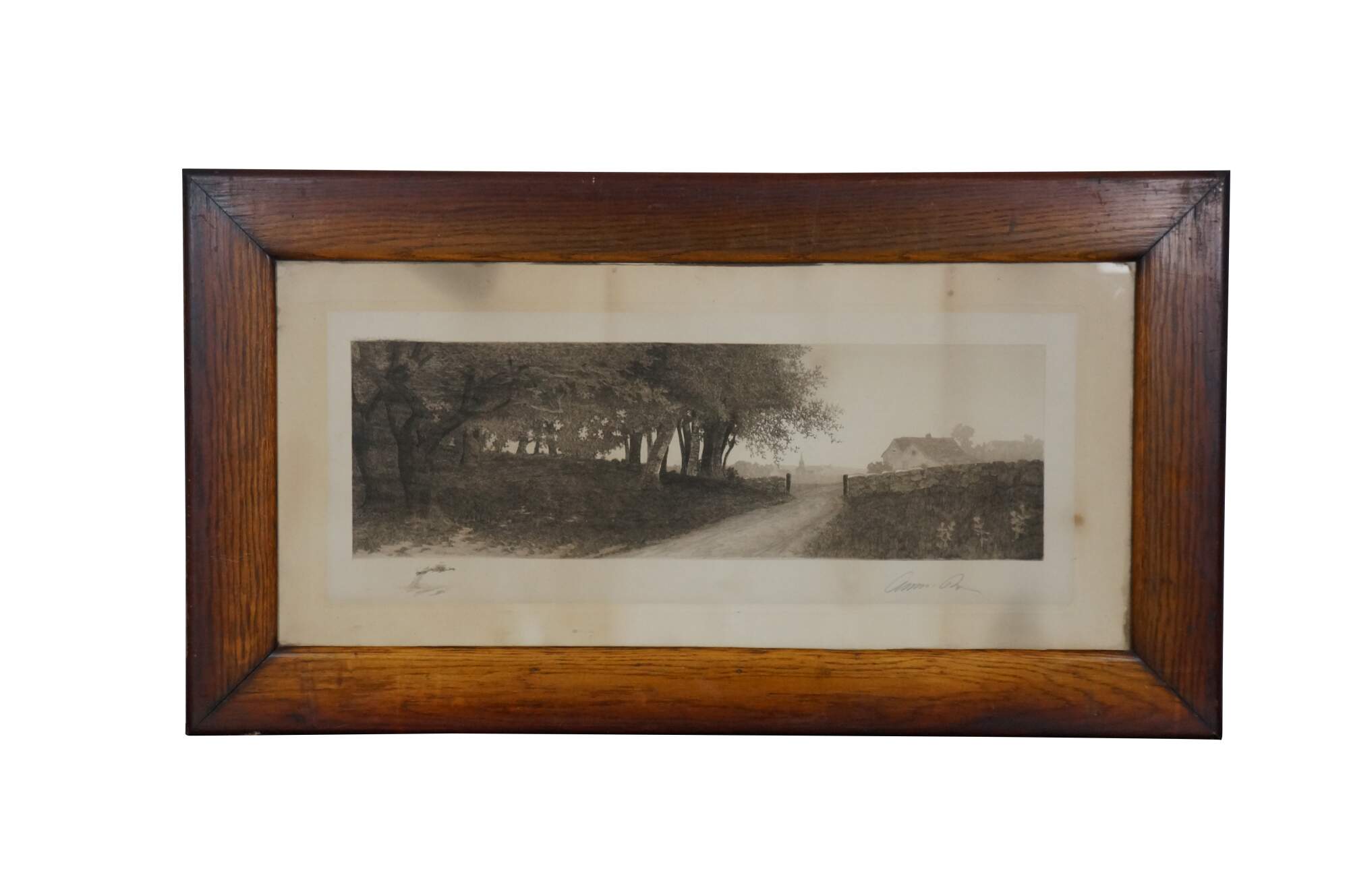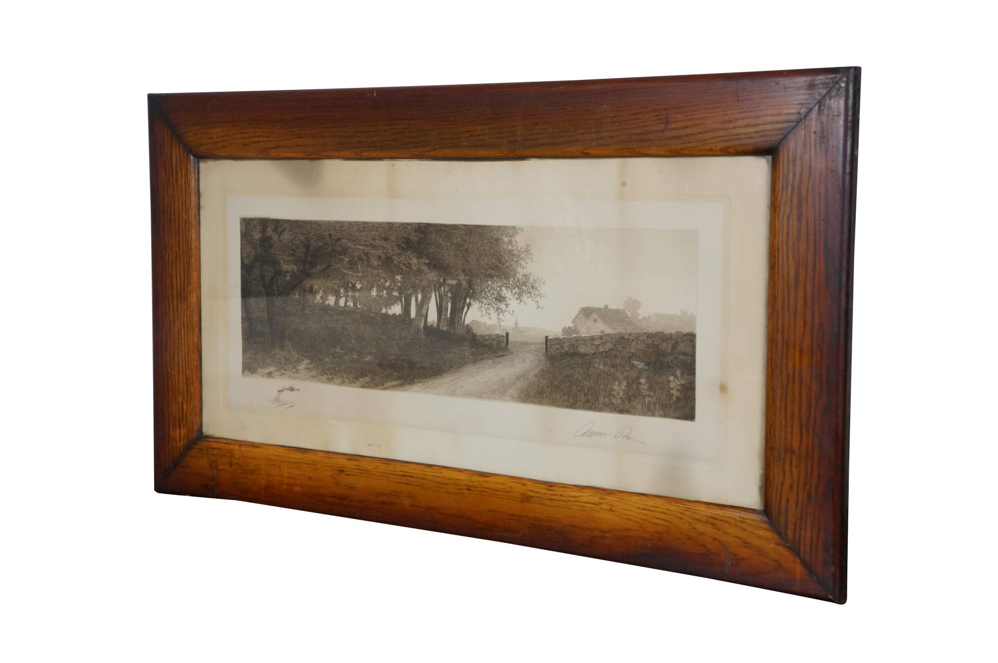 Late 19th century black-and-white etching by Ernest C. Rost. Country road at the edge of a forest, passing through a stone wall towards a village in the distance. Signed in plate “ E.C. Rost 1890,” lower left. Remarque of a tree, lower left. Copyright 1890 by Fishel, Adler & Schwartz, New York. Pencil signature, lower right. Wood frame; no mat.
