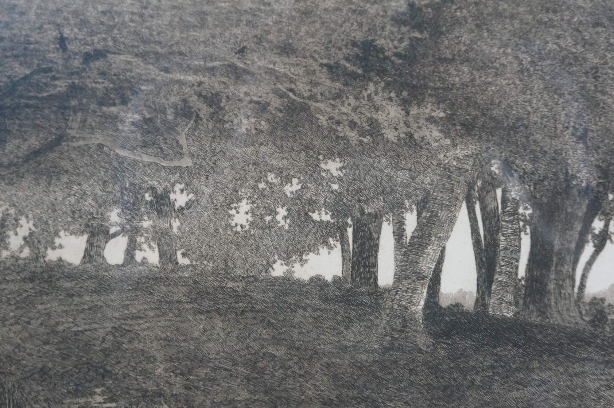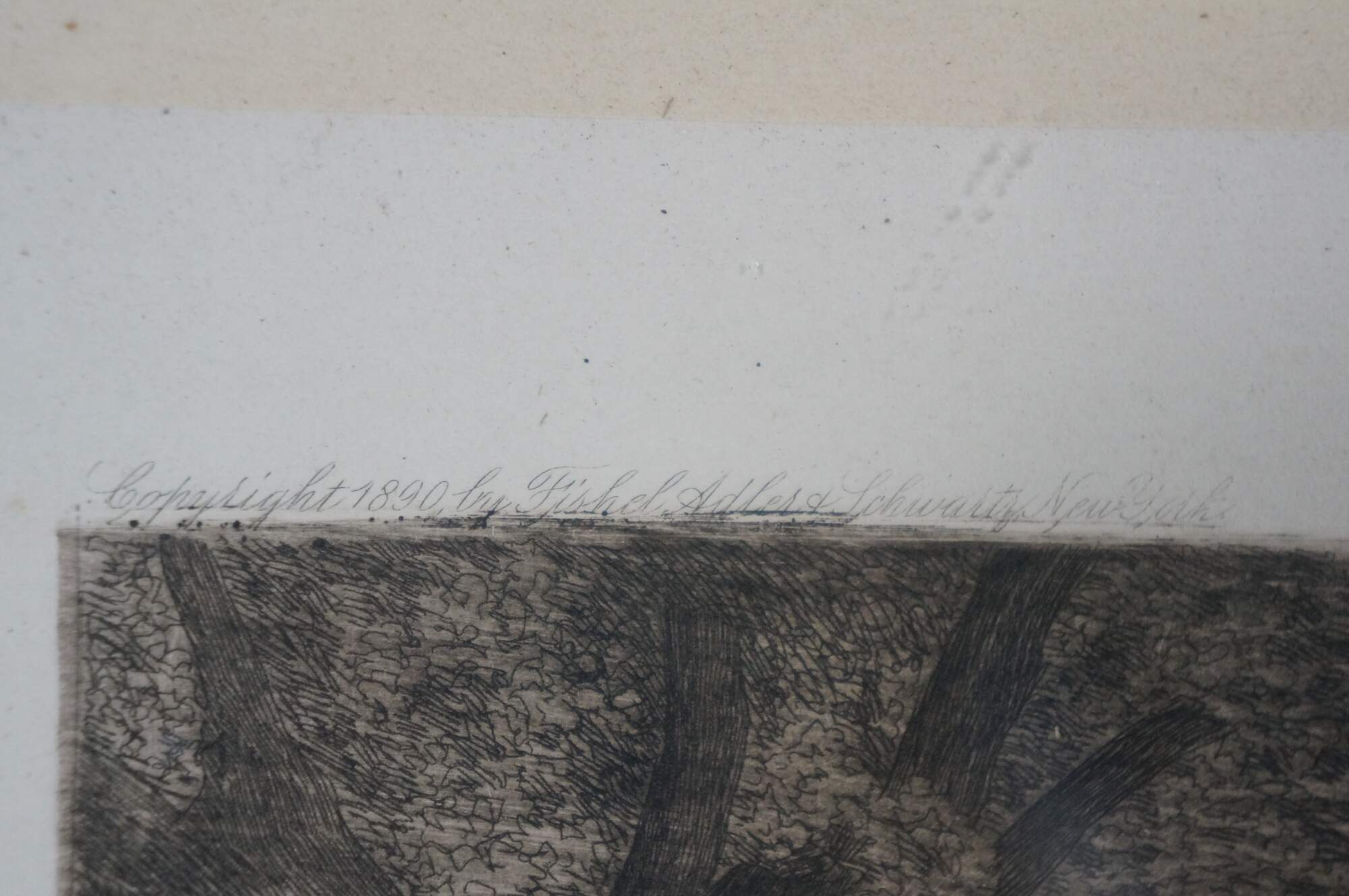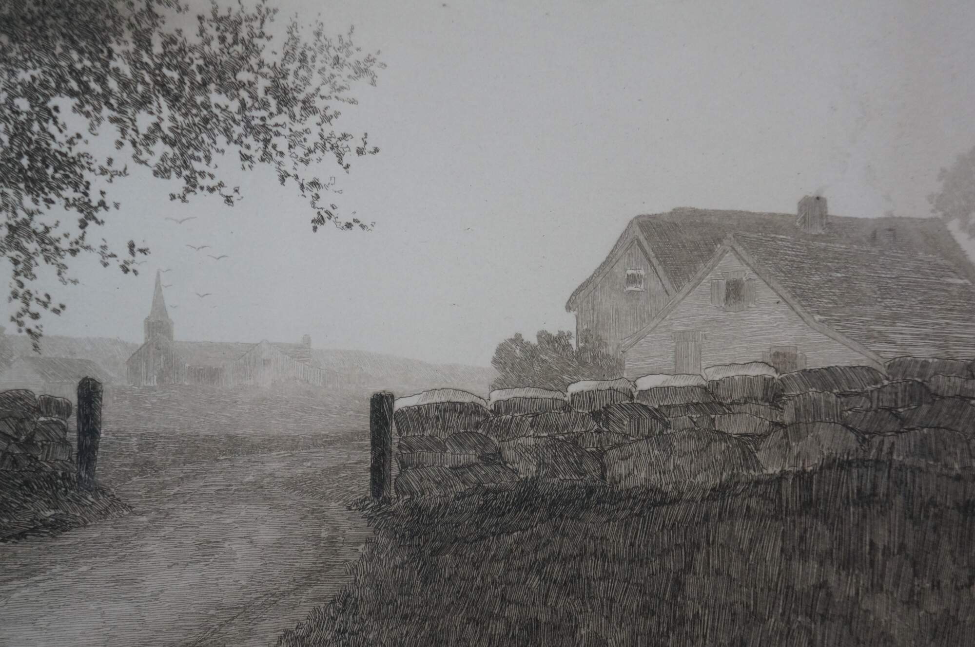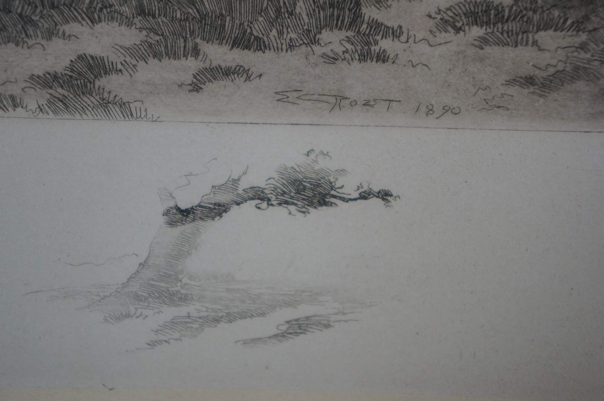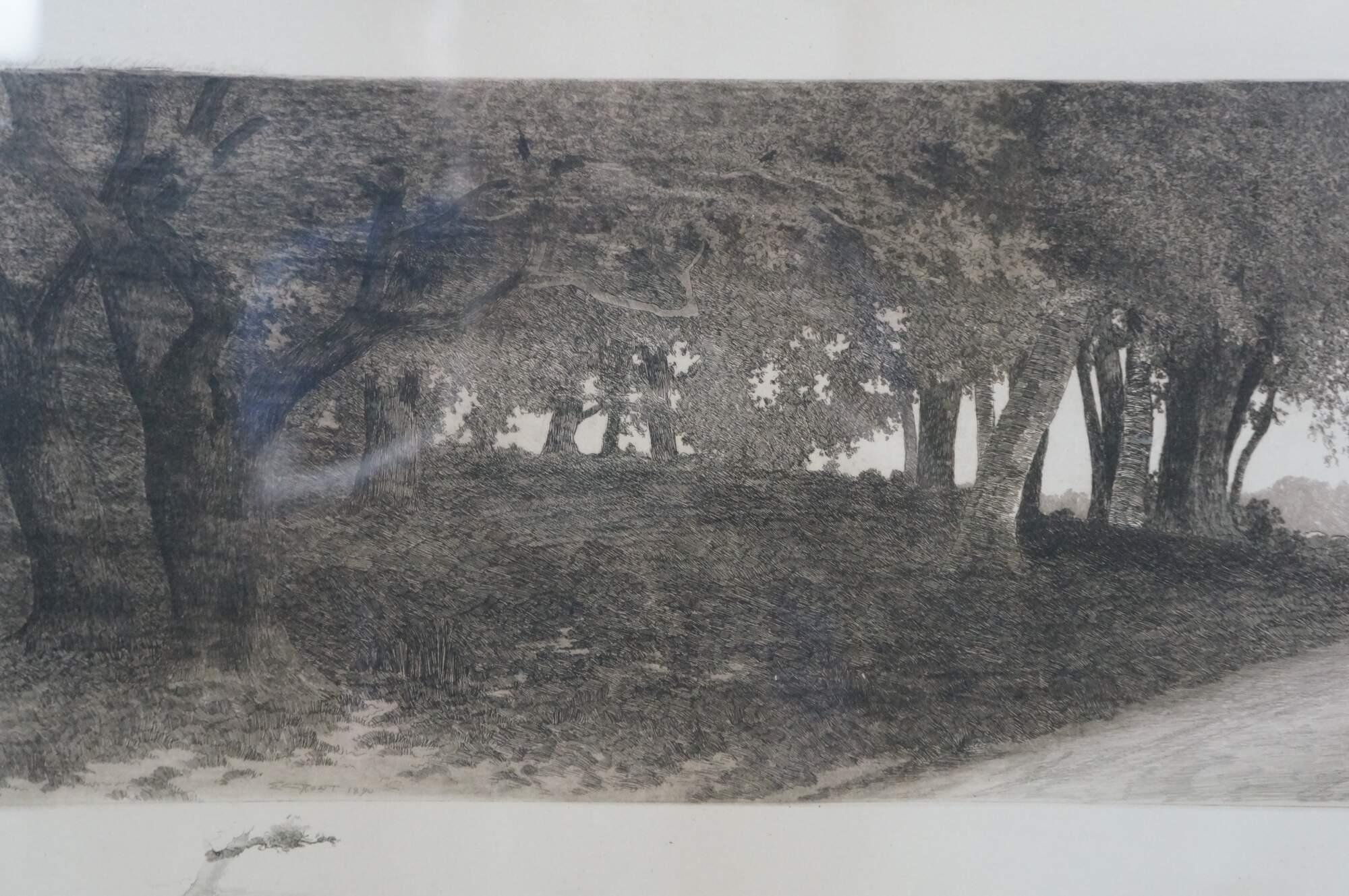 Late 19th century black-and-white etching by Ernest C. Rost. Country road at the edge of a forest, passing through a stone wall towards a village in the distance. Signed in plate “ E.C. Rost 1890,” lower left. Remarque of a tree, lower left. Copyright 1890 by Fishel, Adler & Schwartz, New York. Pencil signature, lower right. Wood frame; no mat.