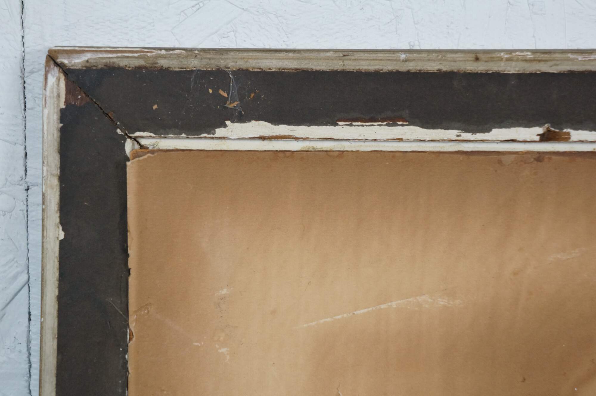 Wear and distressing; discoloration / water stains/ foxing; puncture in print at upper right and at edge lower left; loose in frame, paint loss to frame / marking.