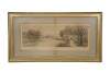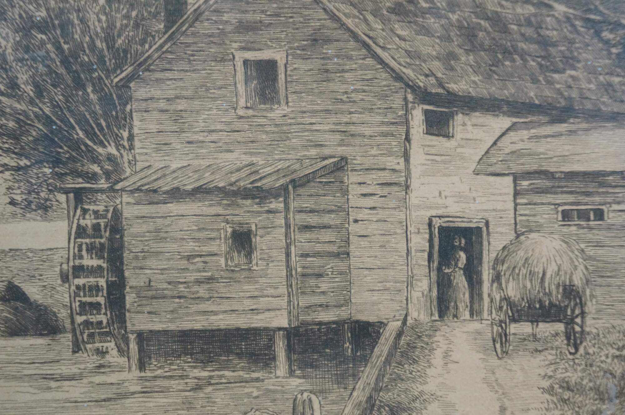 Late 19th century black-and-white etching by H.C. Rost. Panoramic country landscape showing a water mill by a river, with a figure in the doorway. Remark of a pair of mice and small sacks along the lower edge. Copyright 1895 by H.C. Rost. Pencil signed in the lower right corner. Beveled giltwood frame; gray mat.