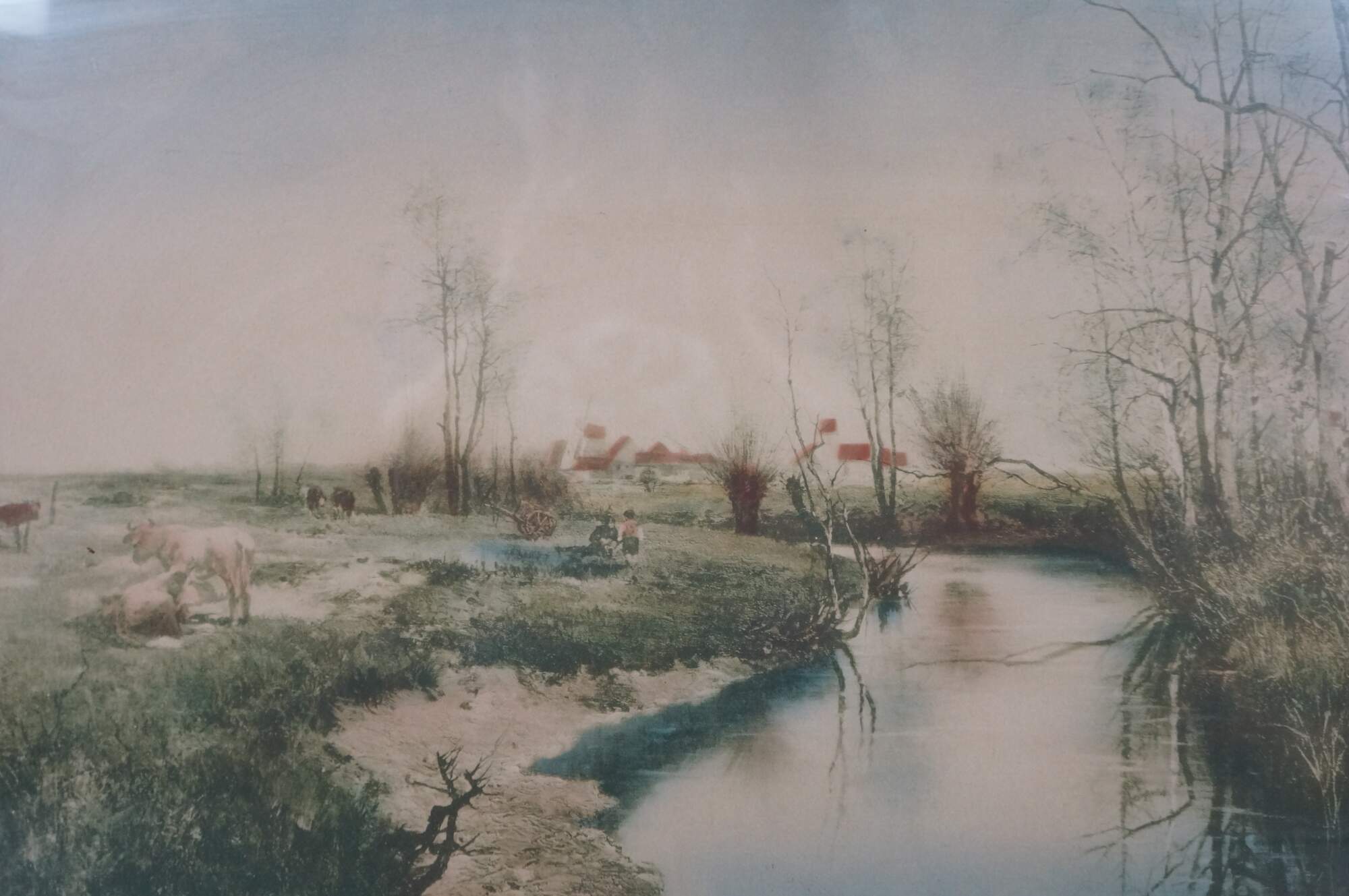Early 20th century hand colored print. Country landscap showing a pair of figures minding a herd of cows by a river, with a red roofed farm in the distance. Partially obscured copyright mark in lower right corner. Beveled giltwood frame with carved border.