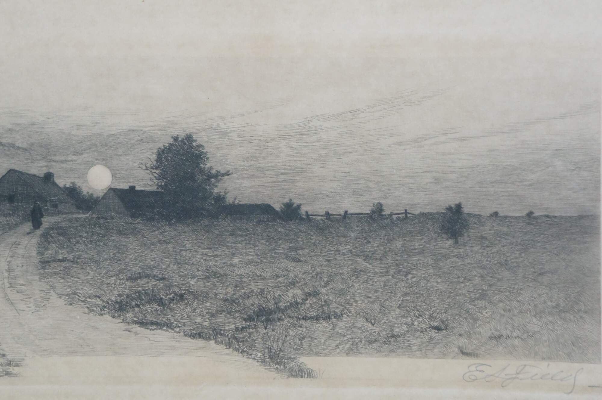 Late 19th century black and white landscape etching by Edward Loyal Field. Lone figure walking down a moonlit country road. Signed in plate E.L. Field, lower left. Pencil signed, lower right. Beveled gilt wood frame carved with egg-and-dart and star-and-moon borders; white mat.