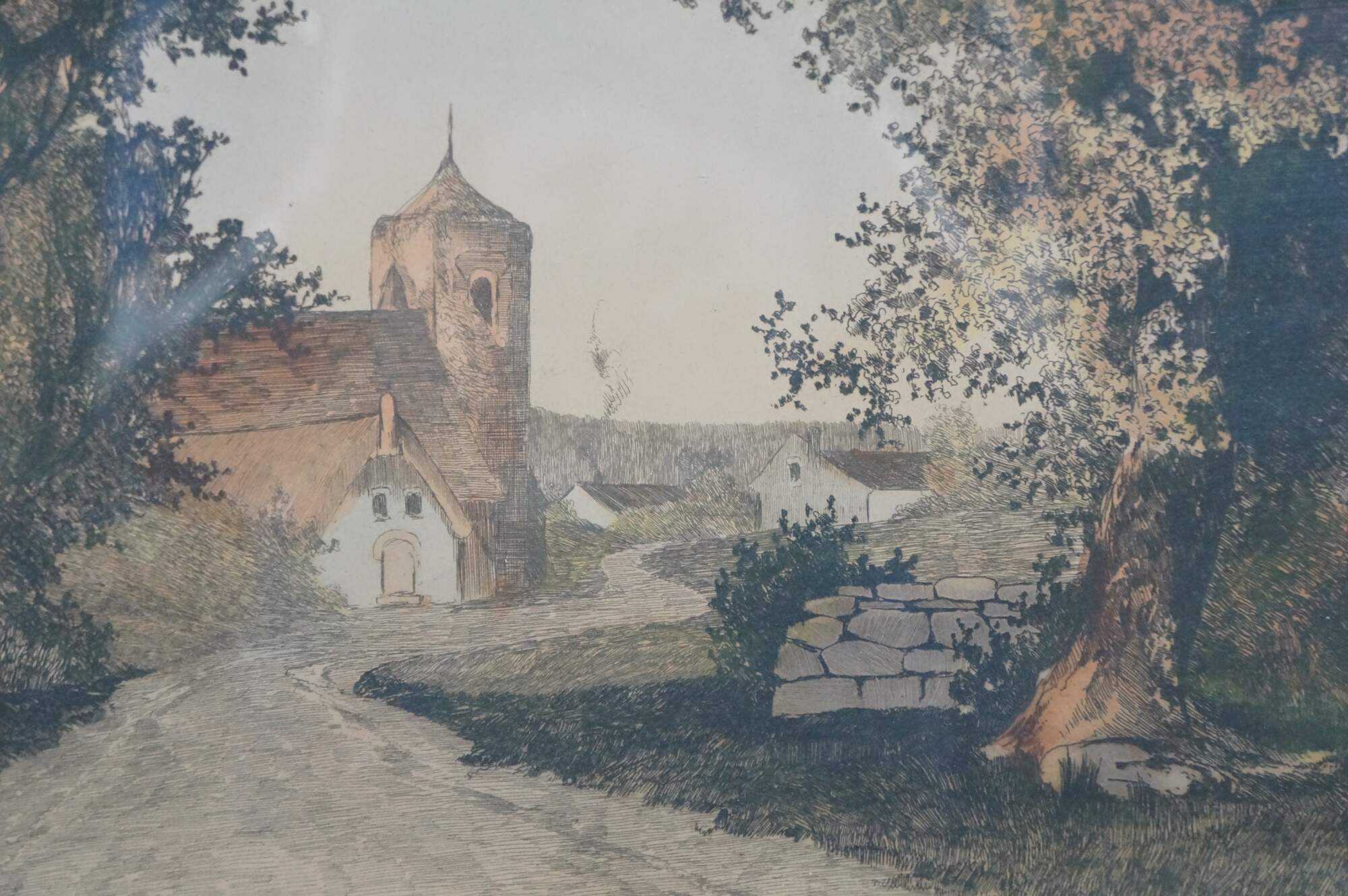 Late 19th century hand colored etching titled "A Bend in the River" by Ernest C. Rost. A picturesque landscape of a country road entering a village along a river. Signed in plate EC Rost 1890. Copyright 1890 by Fishel, Adler, & Schwartz, New York. Floral carved giltwood frame; white mat.
