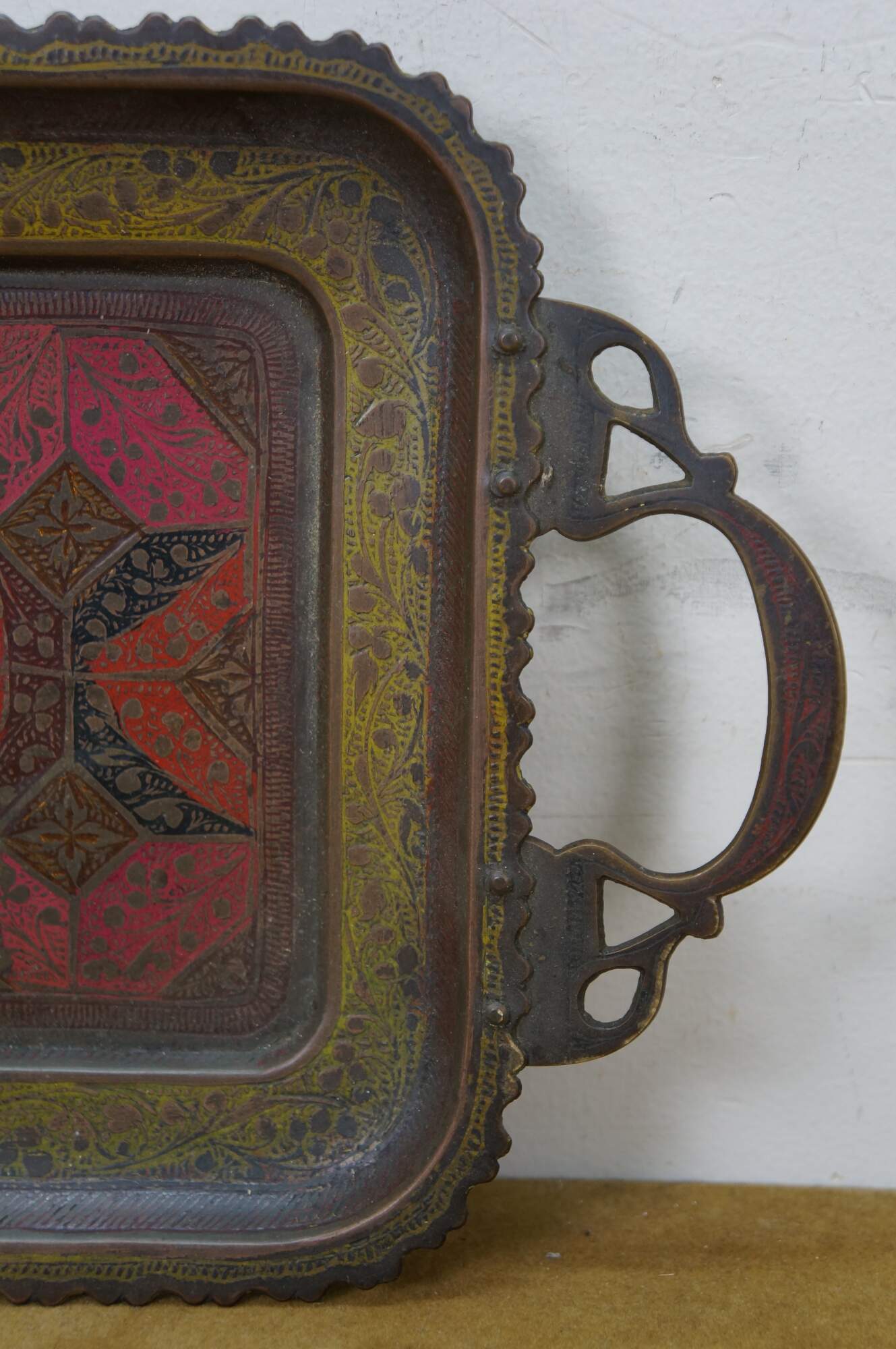 Ten vintage Indian brass etched and enameld serving pieces with a variety of floral designs, birds, and peacocks. Set includes: rectangular serving tray with peacocks, 6 small cups / shot glasses, a lidded compote / candy dish / trophy urn, and two taper candlestick holders with flying bird shaped bases.