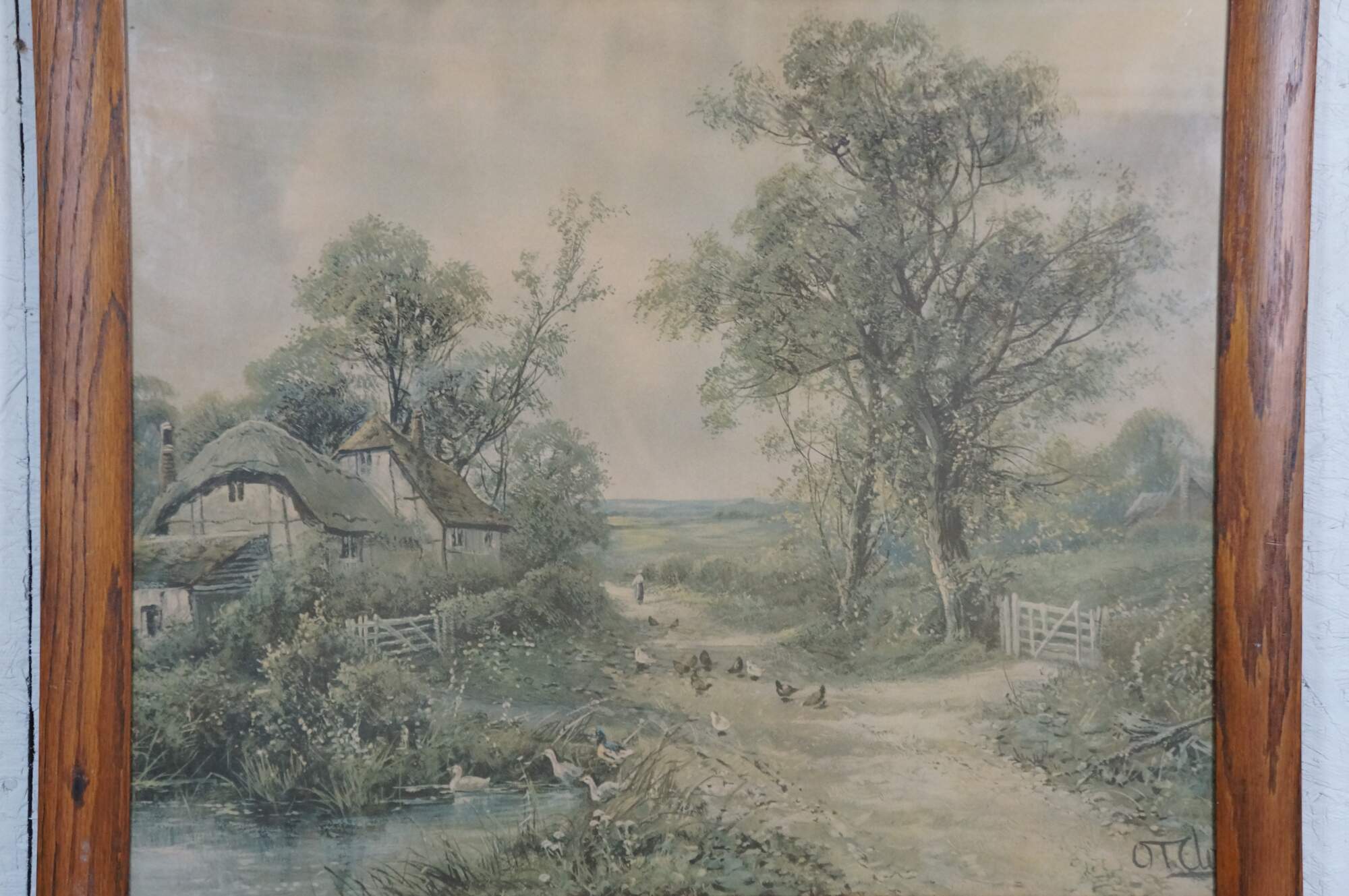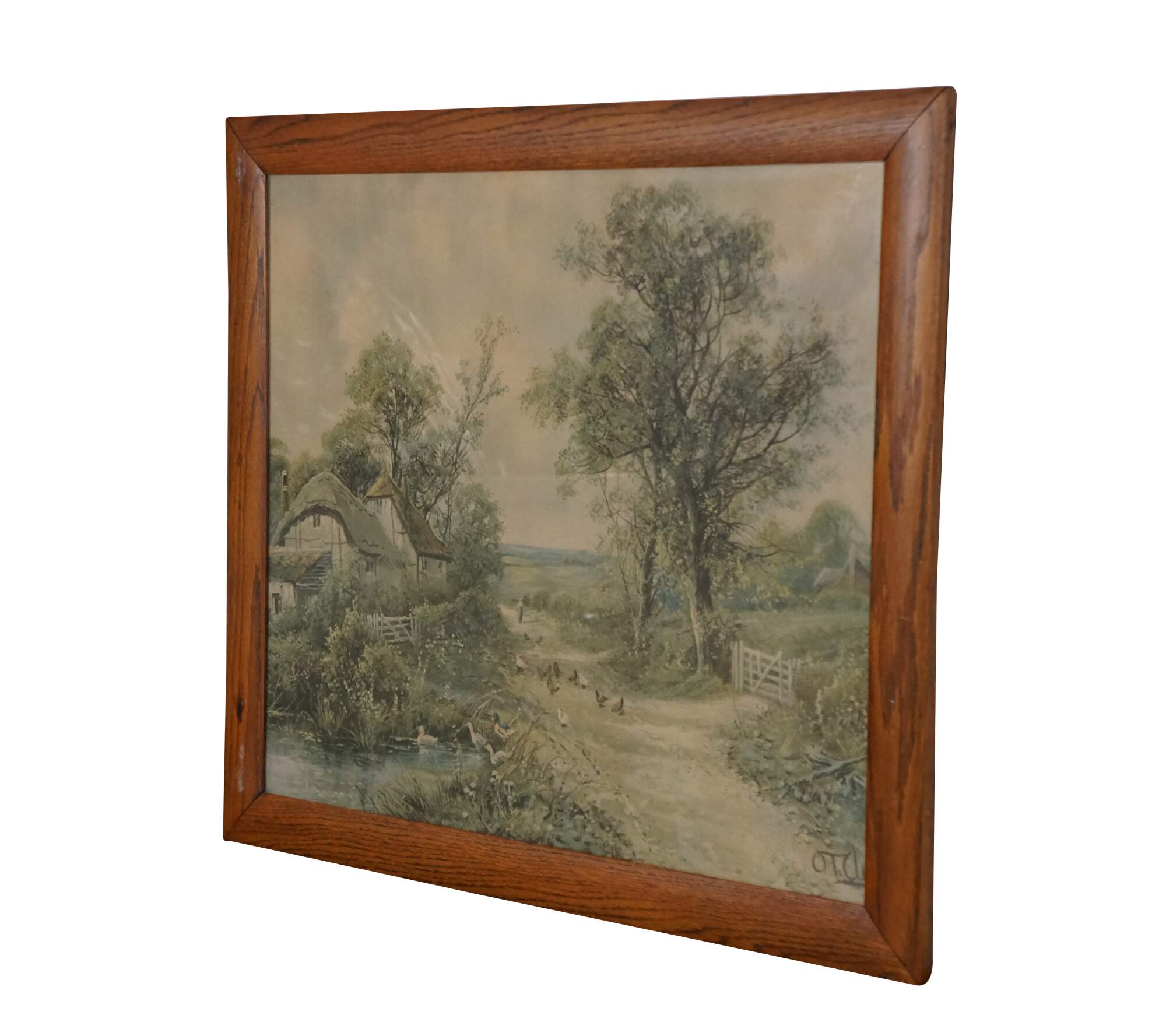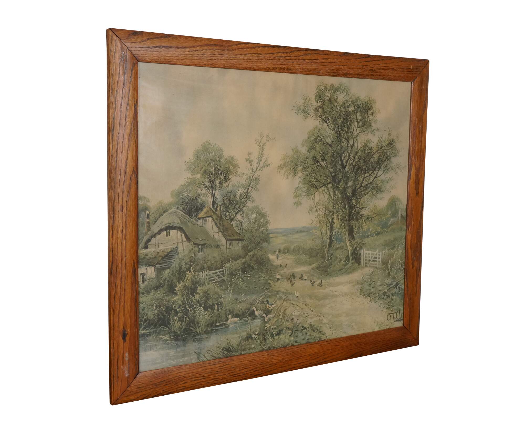 Mid to early 20th century lithograph print titled "By a Country Lane" by Octavius Thomas Clark. Country landscape showing a distant figure, chickens and ducks on a country road by a small pond and thatched roof farmhouse. Signed in plate, lower right. Oak frame; no mat.