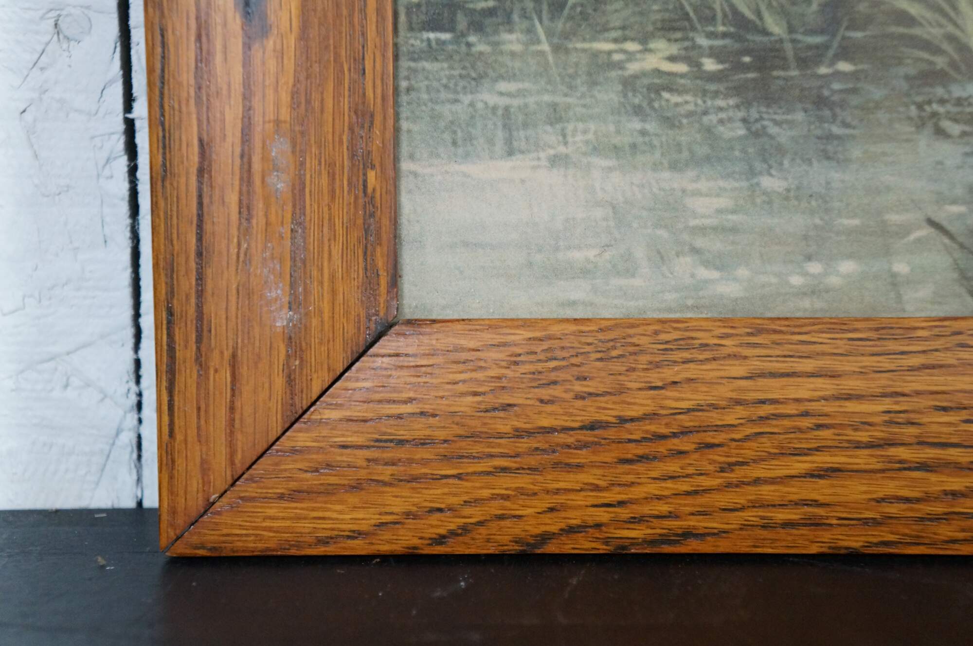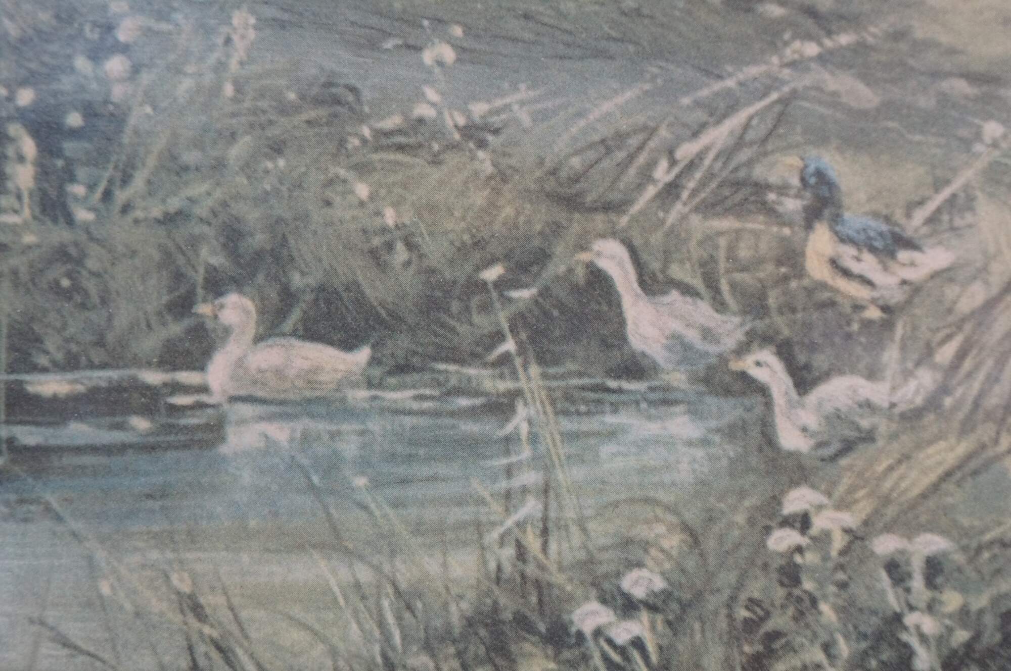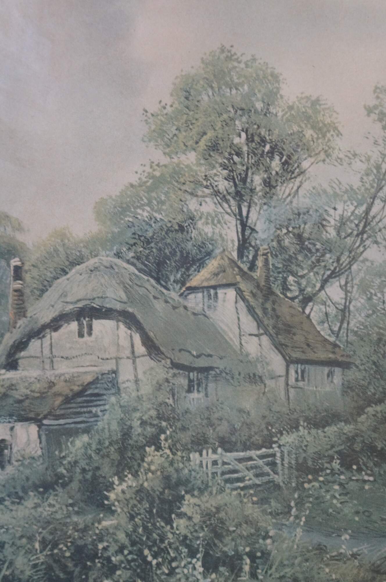 Mid to early 20th century lithograph print titled "By a Country Lane" by Octavius Thomas Clark. Country landscape showing a distant figure, chickens and ducks on a country road by a small pond and thatched roof farmhouse. Signed in plate, lower right. Oak frame; no mat.
