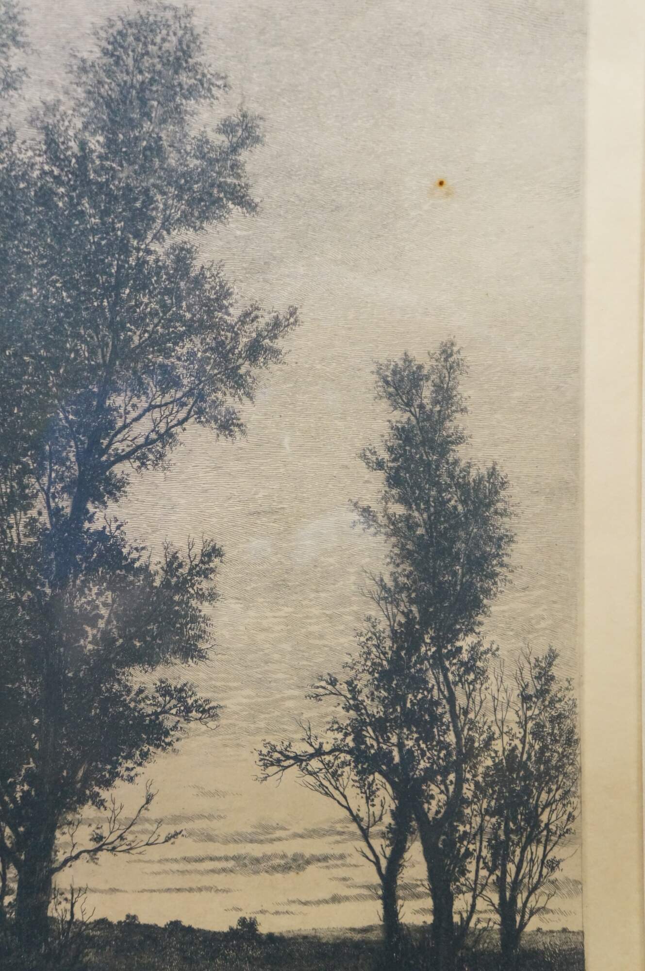 Turn of the century black and white etching. Country landscape showing a small pond framed with tall trees. Remarke of a small country landscape, lower edge. Pencil signed by artist, lower left. Published by James Tyroler, New York, 1905. Light colored beveled wood frame; white mat.