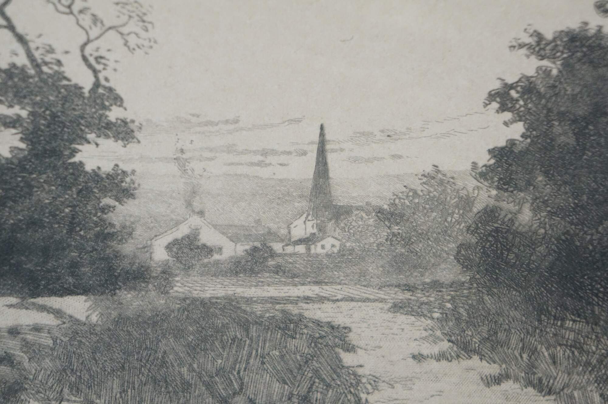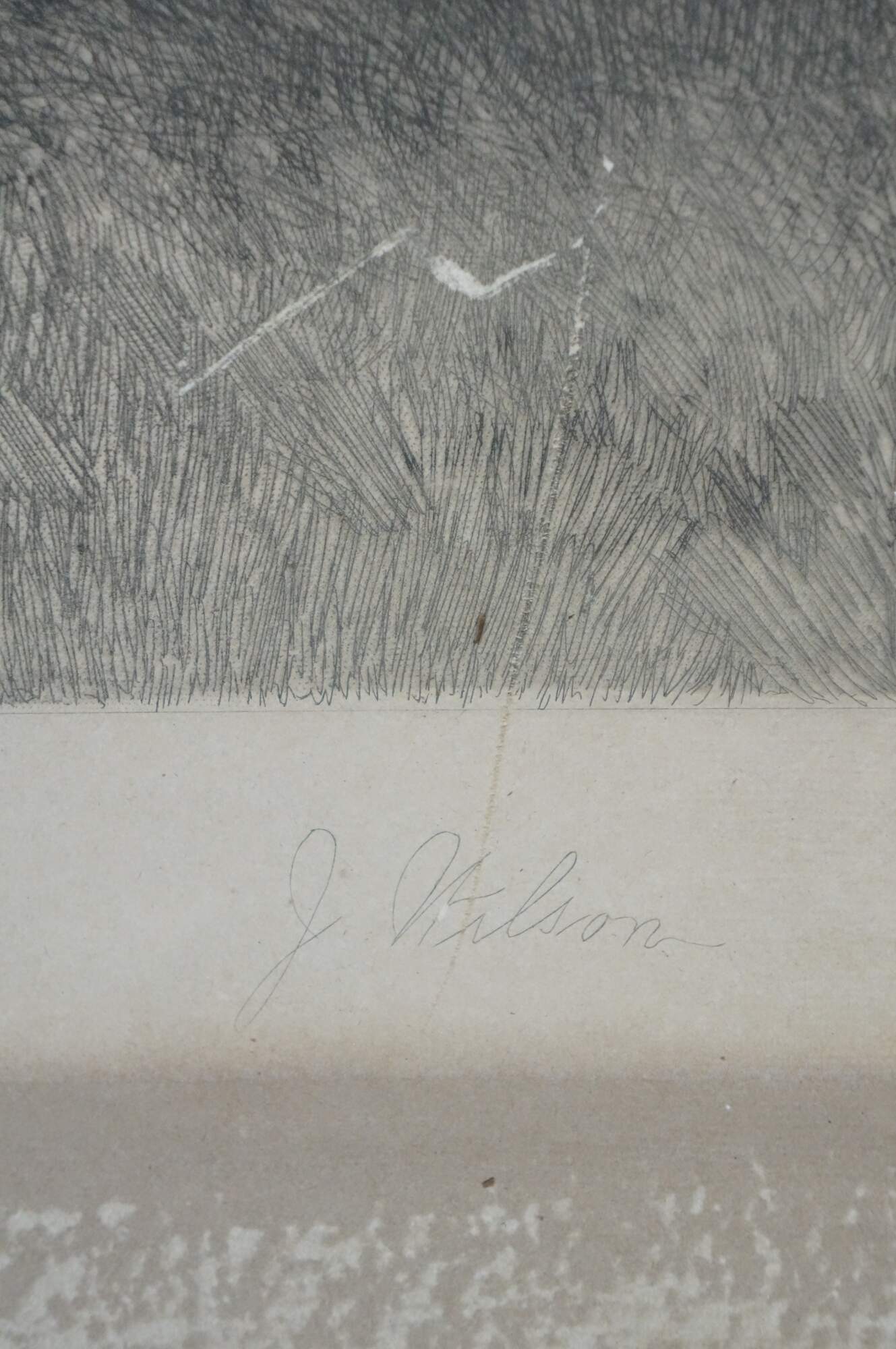 Turn of the century black and white etching. Panoramic Dutch style country landscape showing a bridge over a river at the edge of a country village, with a windmill and figure. Remarke of a stone outcropping, lower edge. Signed in plate, J Wilson, lower right. Published by James Tyroler, New York, 1902. No frame.