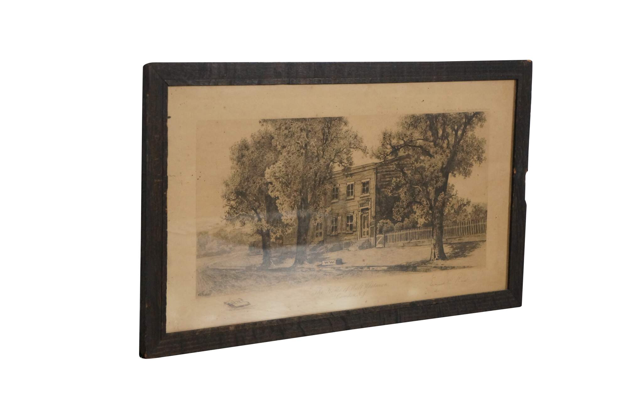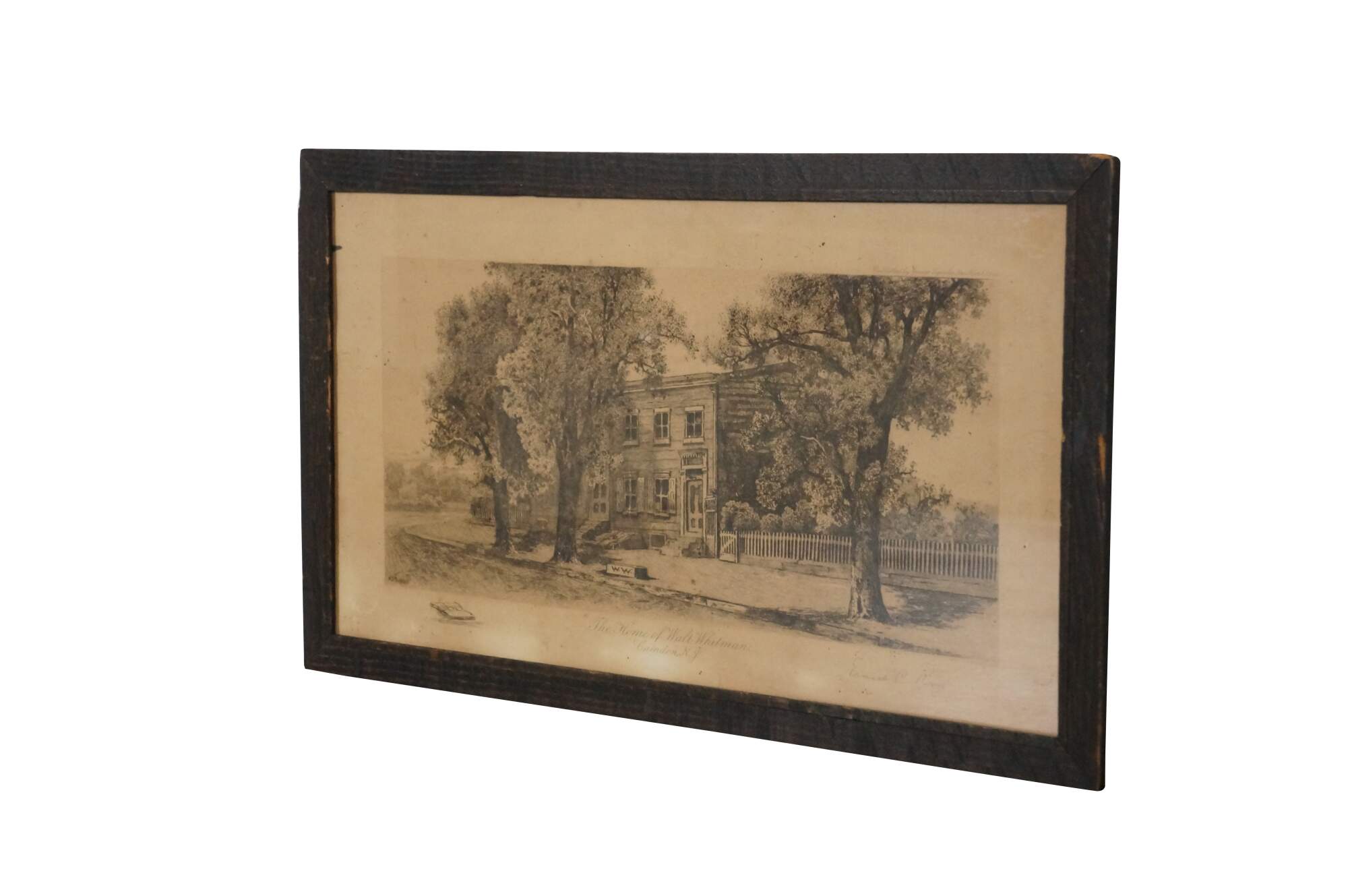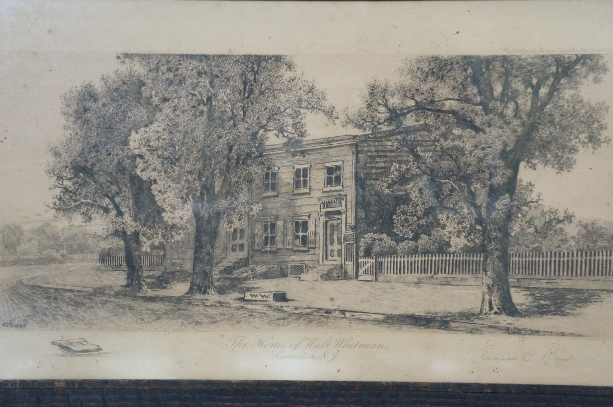 Turn of the century black and white architecture landscape etching titled "The Home of Walt Whitman, Camden, NY." Etched by Ernest C. Rost after a drawing by Nellie Sanford Packard. Signed in plate N.S. Packard, lower left, and Ernest C. Rost, lower right. Remake of glasses on a book, lower left. Published by James Tyroler, New York, 1902. Wood frame; no mat.