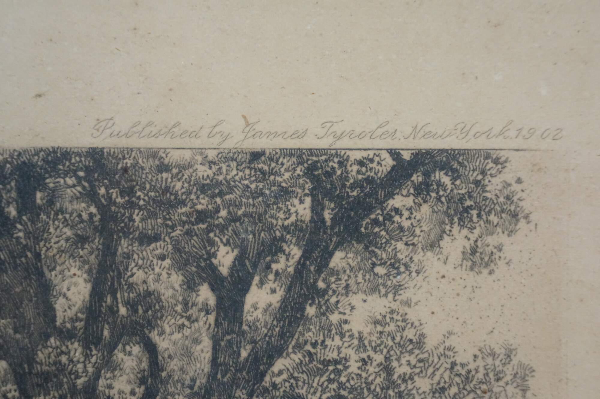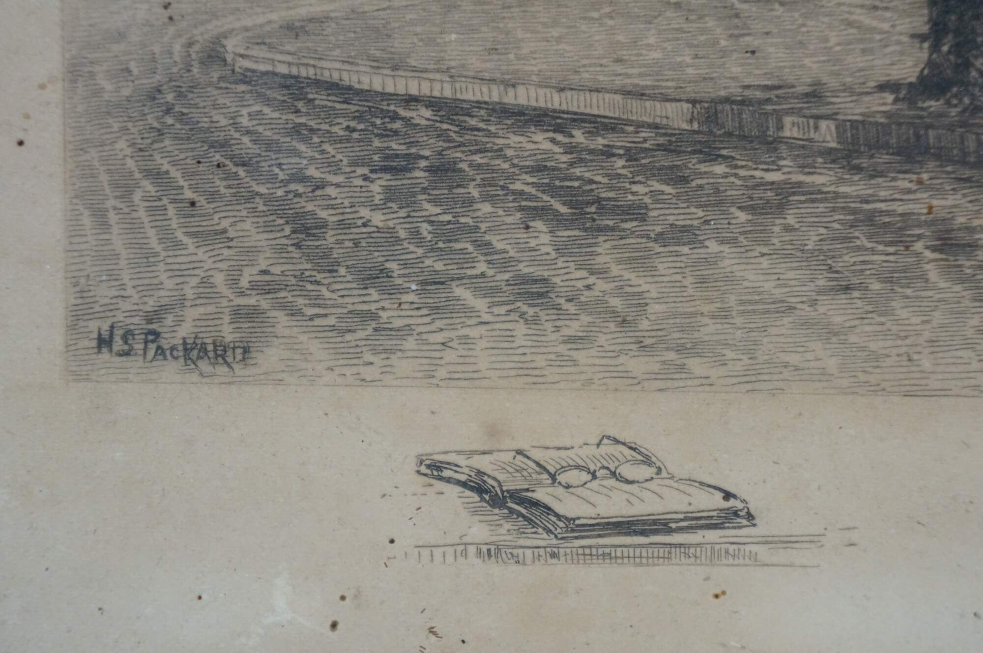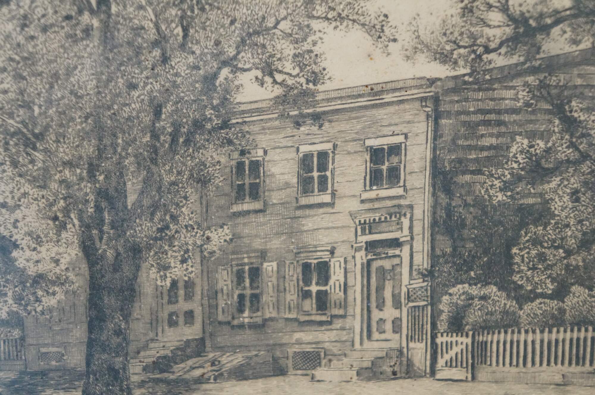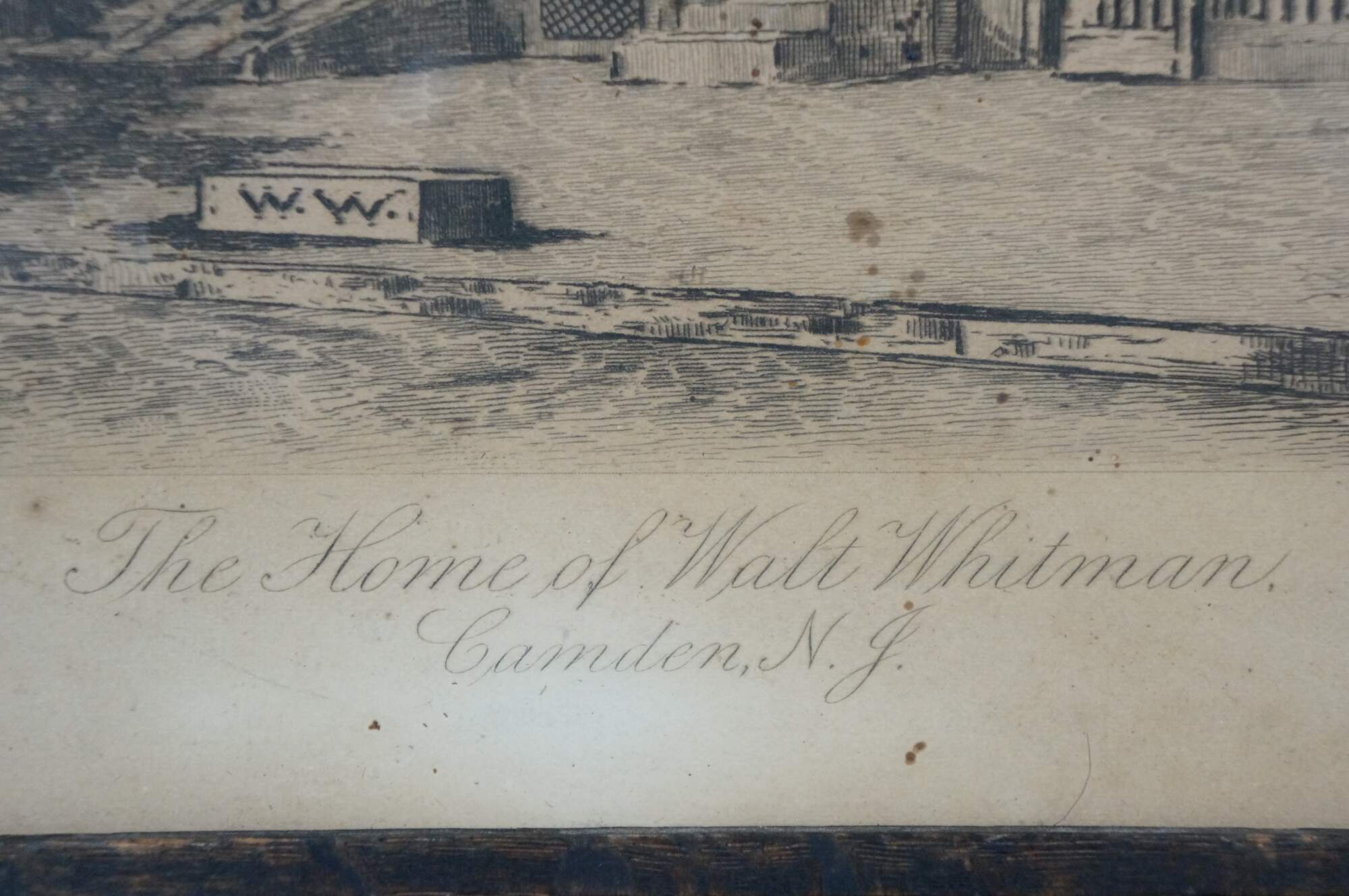 Turn of the century black and white architecture landscape etching titled "The Home of Walt Whitman, Camden, NY." Etched by Ernest C. Rost after a drawing by Nellie Sanford Packard. Signed in plate N.S. Packard, lower left, and Ernest C. Rost, lower right. Remake of glasses on a book, lower left. Published by James Tyroler, New York, 1902. Wood frame; no mat.