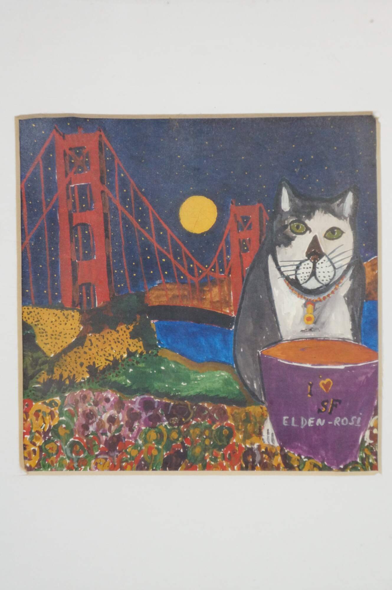 Late 20th century framed triptych of watercolor on paper paintings by Peruvian Folk Artist Elden Rosi - the first showing a golden cat sculpture next to a teapot full of flowers; second, a white kitten chasing a butterfly over the head of a black cat; and third, a gray and white cat seated next to an I Love SF coffee mug in a nighttime landscape featuring the Golden Gate Bridge. First and third signed, lower edge. Black wood frame; white mat.