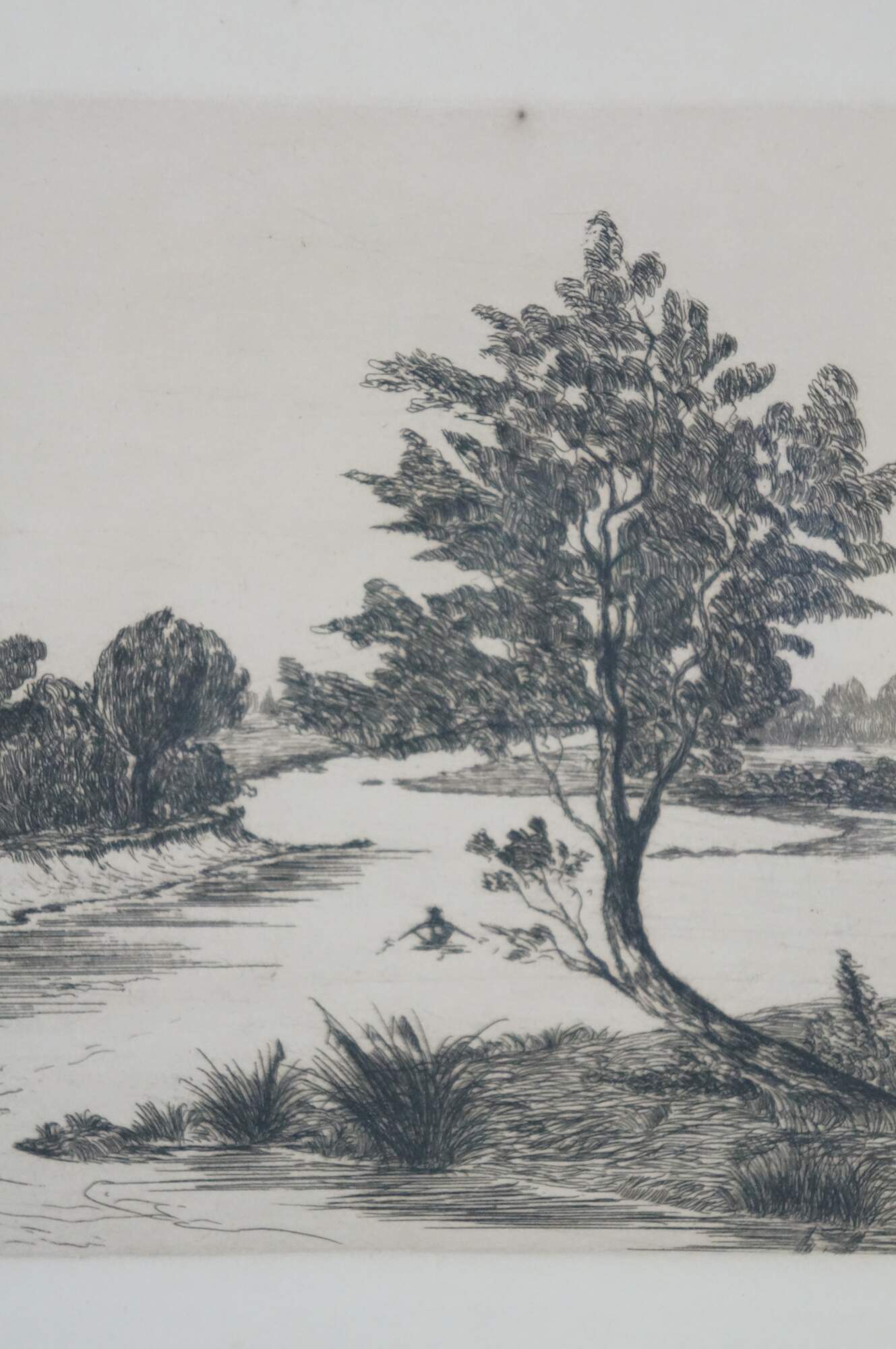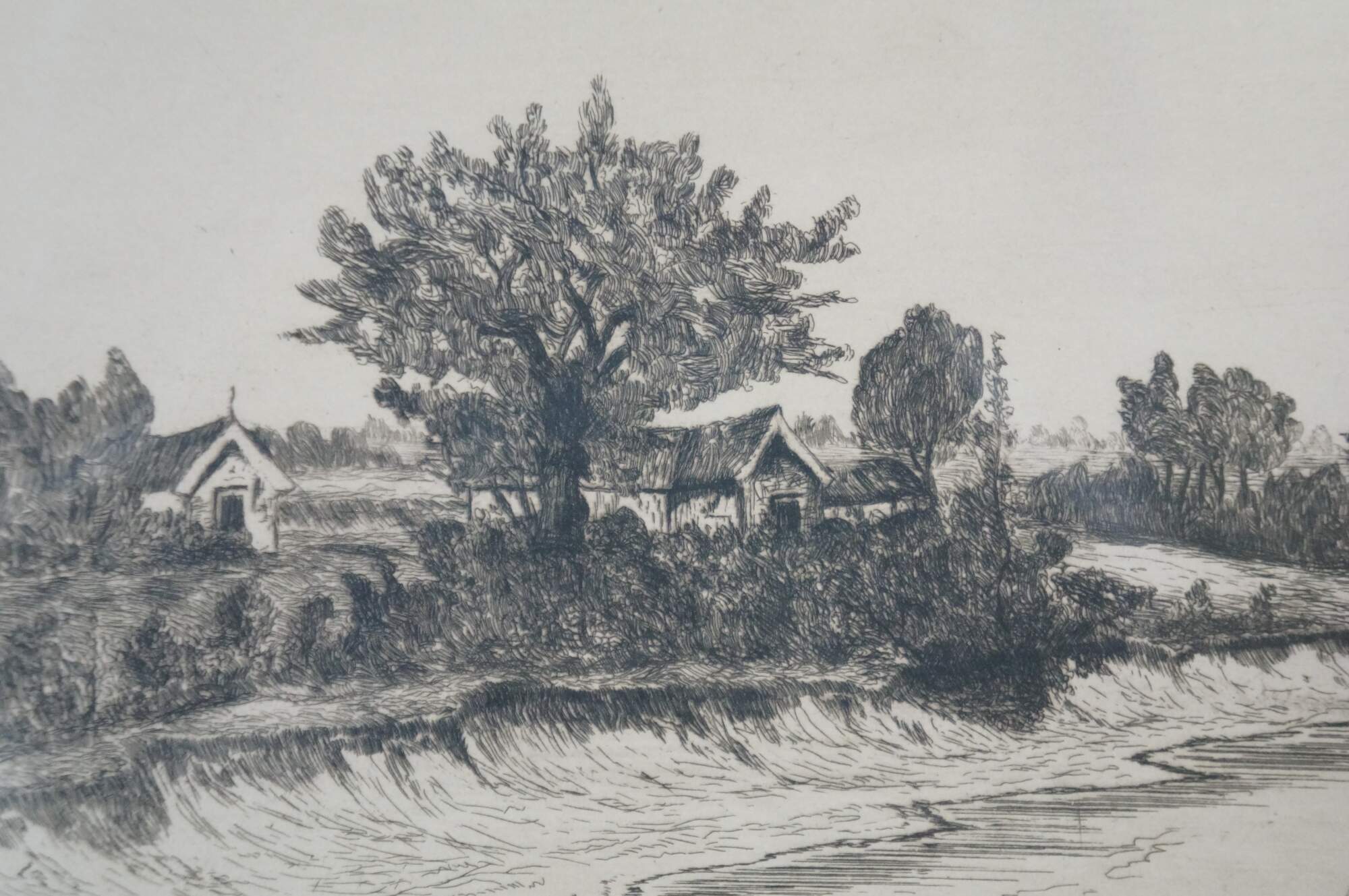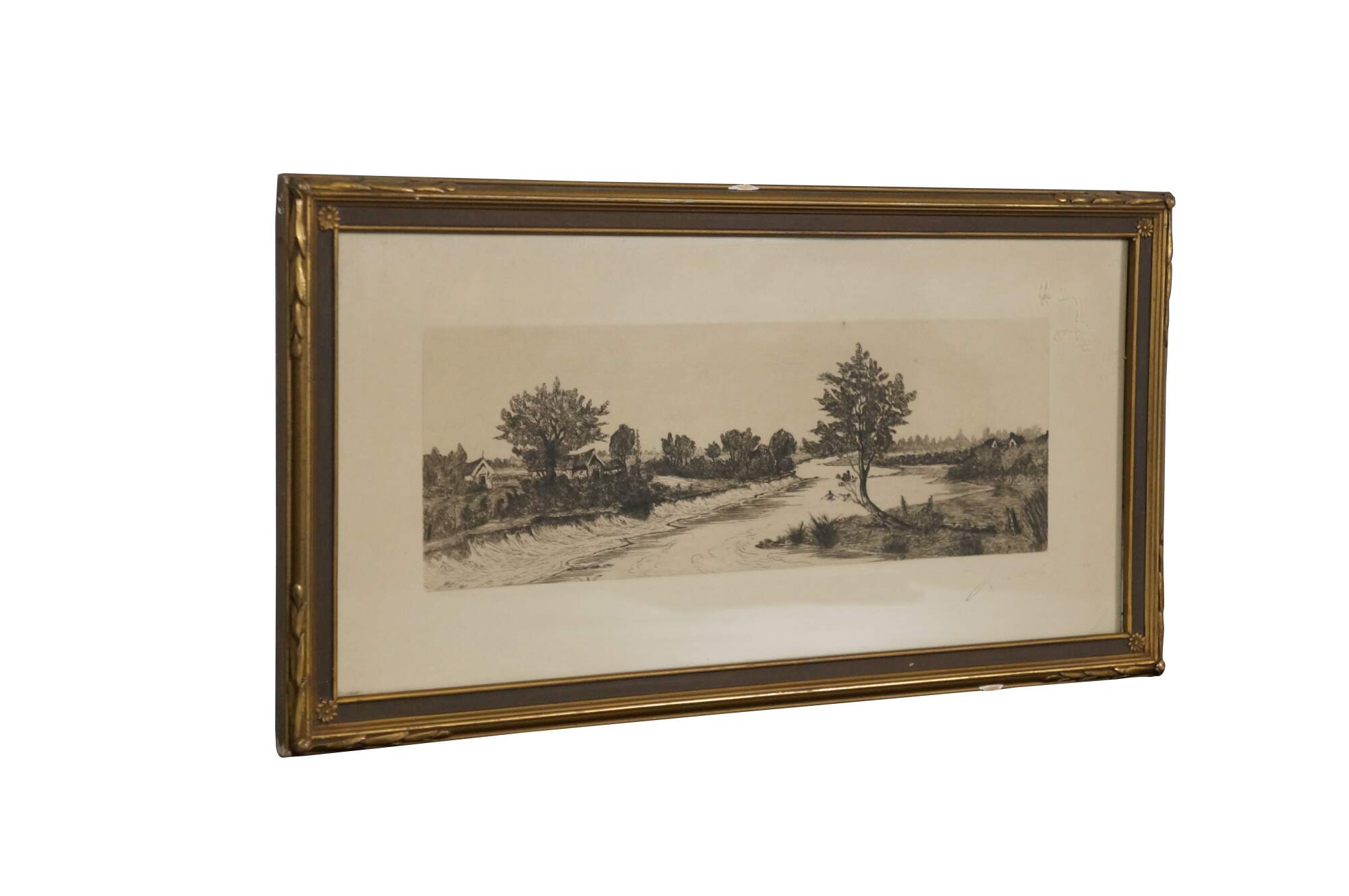 Late 19th to early 20th century black-and-white etching by J. Marsh. Panoramic country riverscape with trees and cottages. Faded signature, lower right. Brown and gilt wood frame with foliate and floral carved corners; no mat.