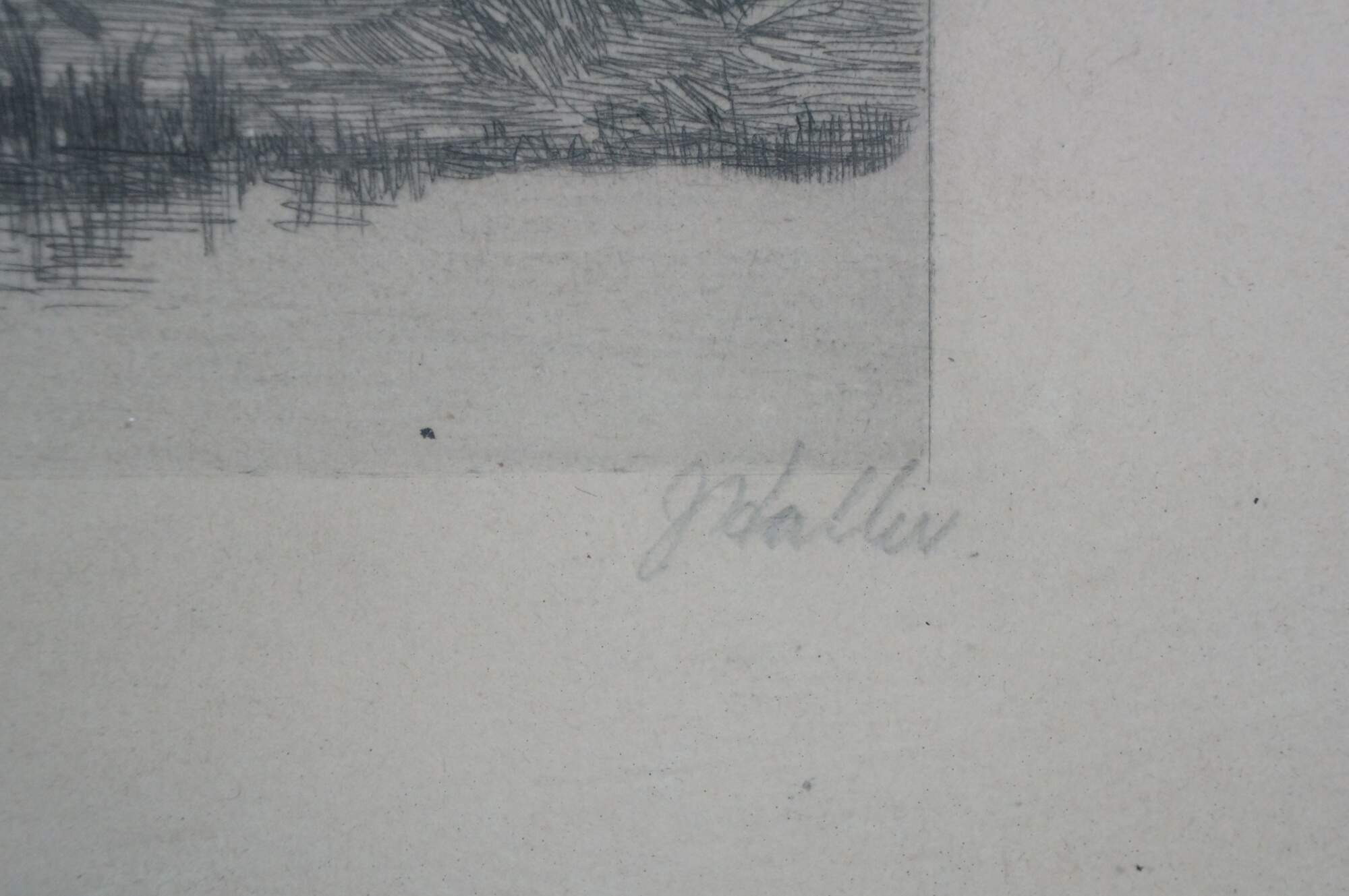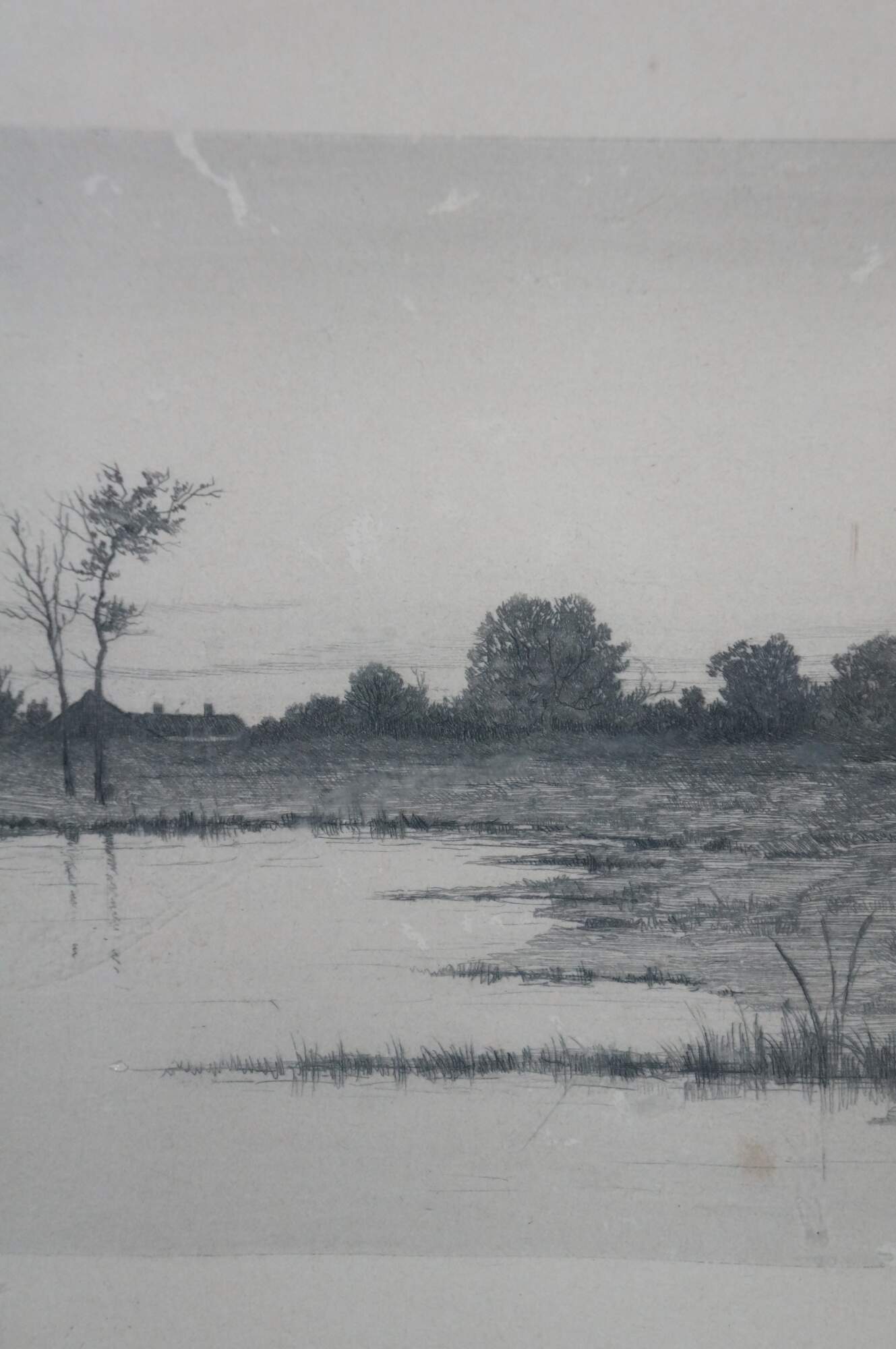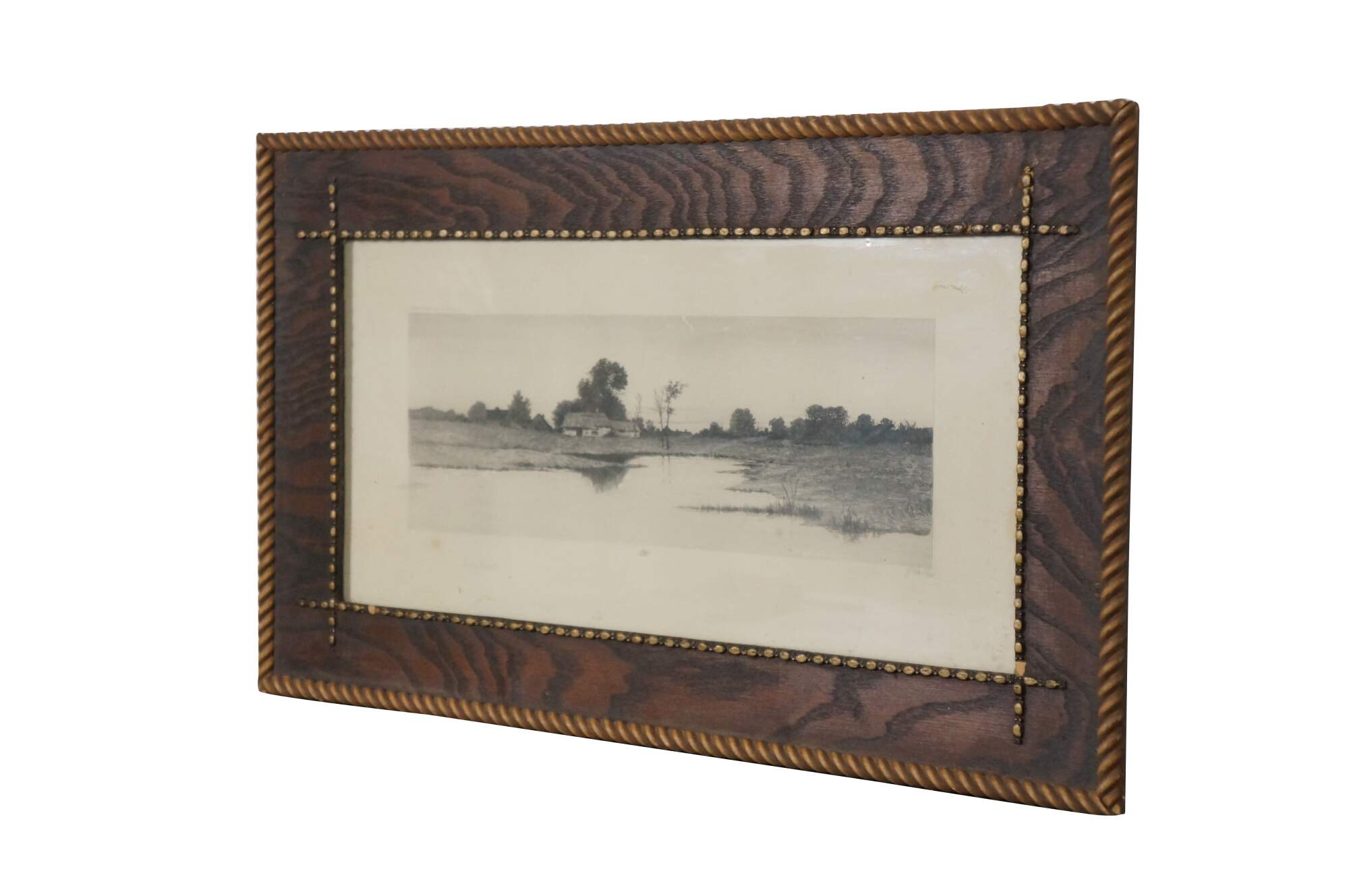 Late 19th century black and white etching by Alfred J. Haller. Panoramic country landscape showing a thatched cottage next to a broad lake. Pencil signed, lower right. Published by Radtke Lauckner & Co, 1890, N.Y. Exotic wood frame with barley twist edge and beaded inner border; no mat.
