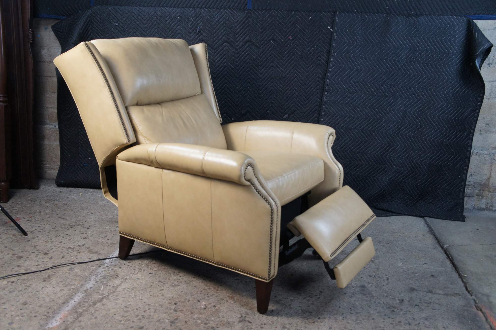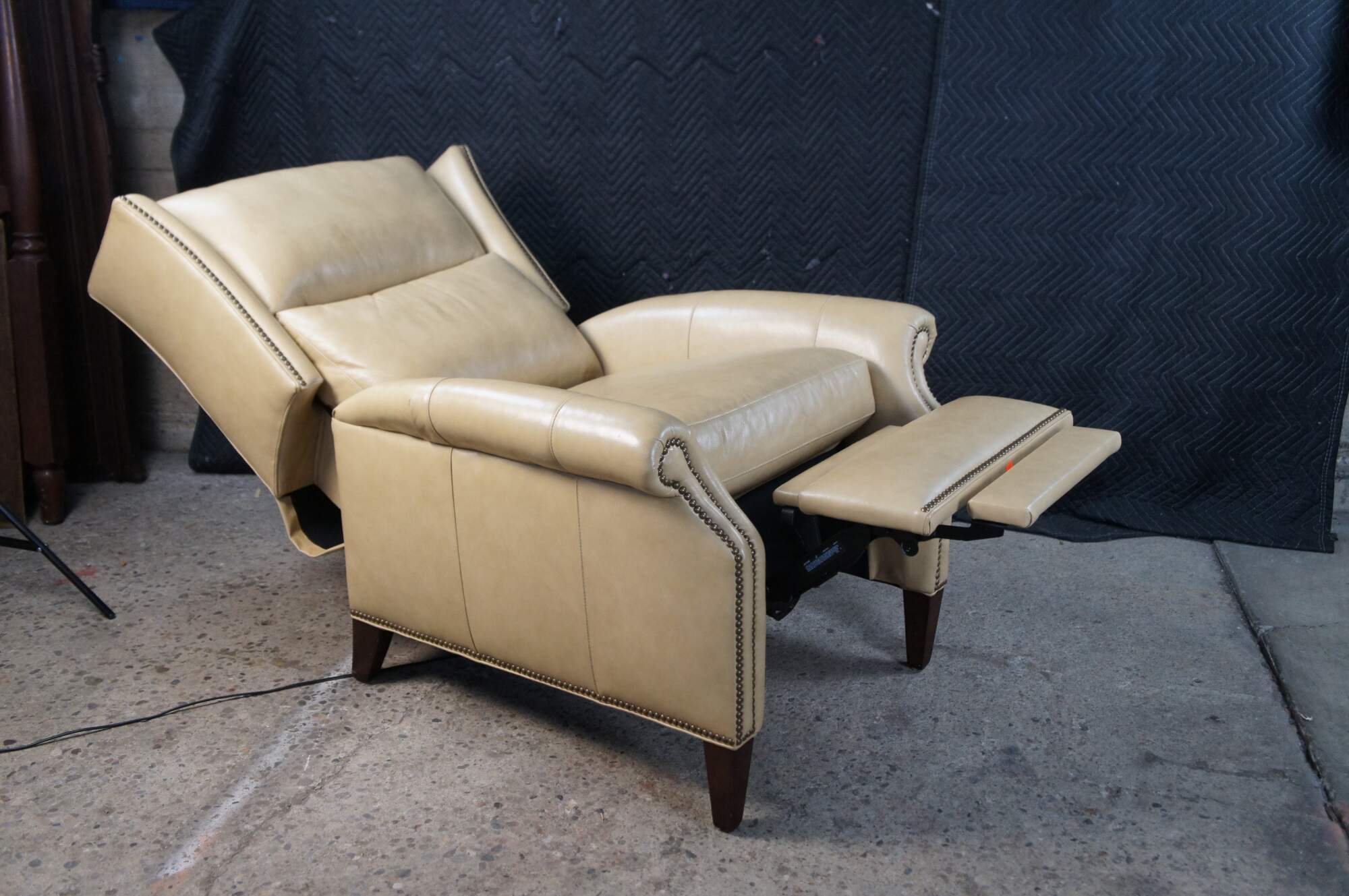 Vintage Hancock and Moore bisque / beige leather power reclining armchair. Handcrafted from top grain leather and special cushioning carefully selected to retain it's shape while remaining soft and comfortable, the Sami Recliner makes a refined and powerful statement. Luxurious bustle back for the ultimate comfort experience. Rolled arms, nail trimmed finish and tapered legs. Handmade in America.