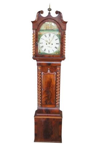 A very impressive antique 19th century Scottish long case 8 day Grandfather clock by George Lumsden of Pittenweem. Tall Georgian style case featuring barley twisted accents and S scrolled top with open pediment and brass finial. The face is hand painted with roman numerals and a nautical maritime seascape scene of sailboats / Clipper Ships, Seagulls, and a Lighthouse against in choppy waters. Brass weight driven movement with recoil escapement, iron bell at the top of the movement with hammer strike, iron weights and steel pendulum rod with brass covered bob.
