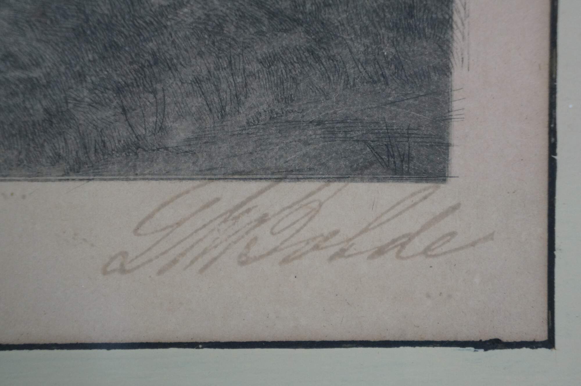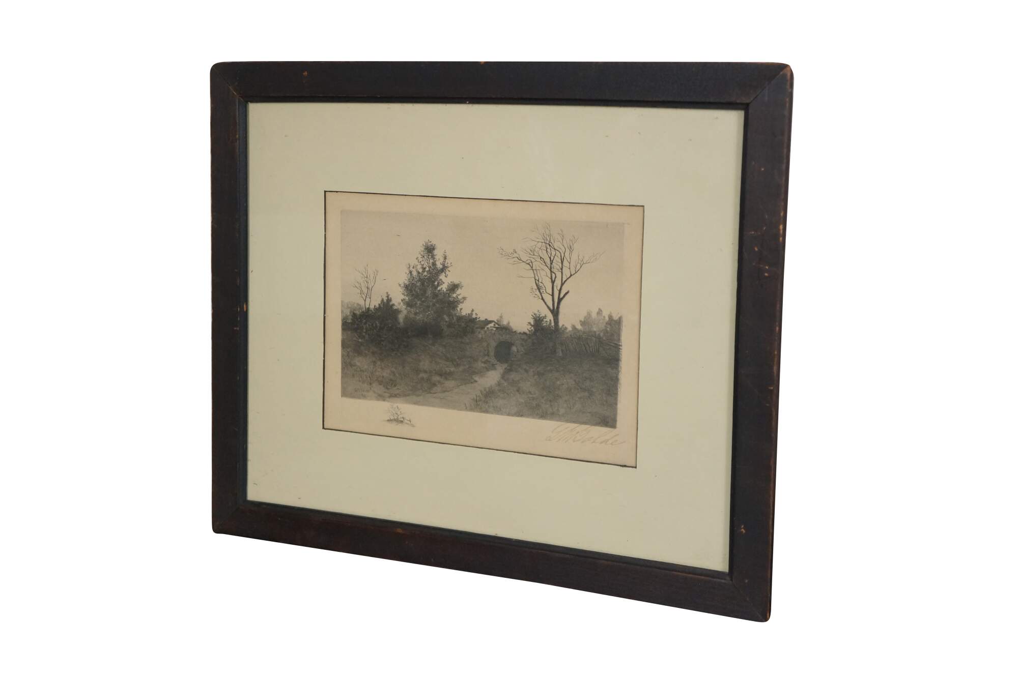 Late 19th century black and white etching by George William Bohde (American, 1870-1939). Country landscape showing of a stone bridge over a small creek with a cottage / house in the background. Signed in plate GW Bohde 91, lower left. Remarke of a tree and fence, lower left edge. signed in ink, lower right edge. Wood frame; white mat.